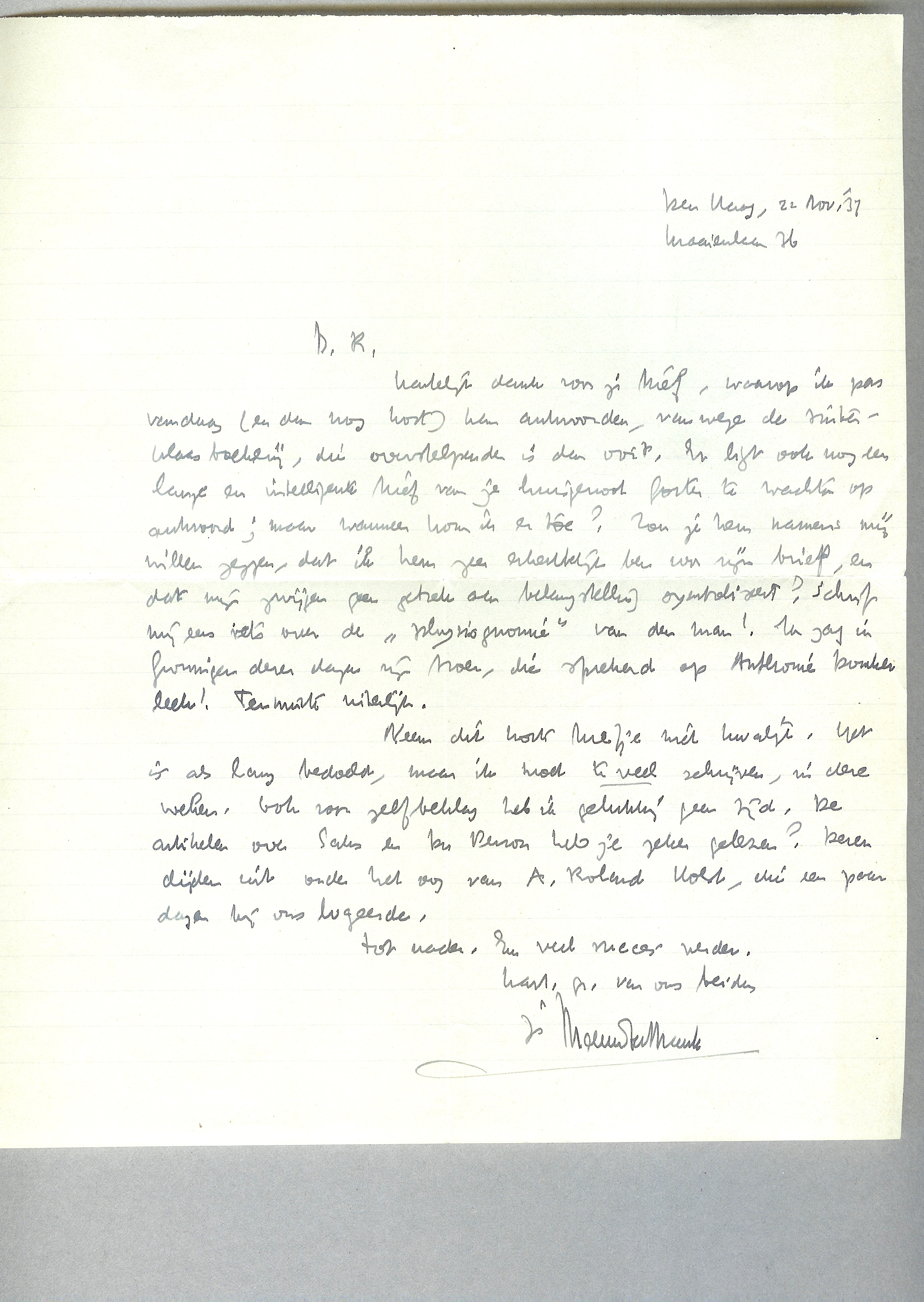 Neem dit korte briefje niet kwalijk. Het is als lang bedoeld, maar ik moet te veel schrijven, in deze weken. Ook voor zelfbeklag heb ik gelukkig geen tijd. De artikelen over Saks en Du Perron heb je zeker gelezen? Dezen dijden uit onder het oog van A. Roland Holst, die een paar dagen bij ons logeerde.