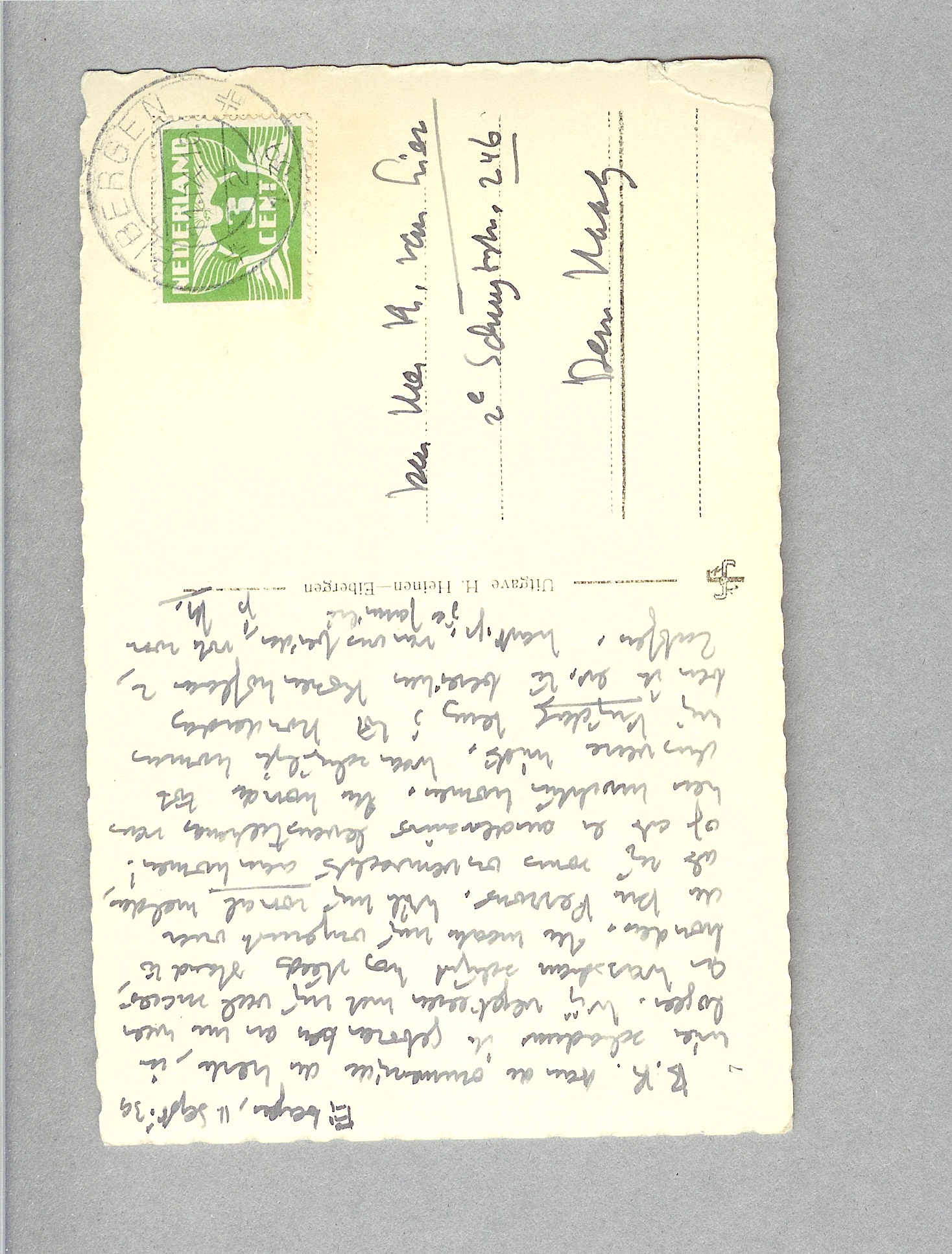 Aan de ommezijde de kerk, in wier schaduw ik geboren ben en nu weer logeer. Wij vegeteeren met vrij veel succes, en Warschau schijnt nog steeds stand te houden. Ik maak mij ongerust over de Du Perrons. Wil mij vooral melden, als zij soms onverwachts aankomen! Of als er anderszins levensteekenen van hen mochten komen. Ik hoorde tot dusverre niets. Waarschijnlijk komen wij Vrijdag terug; tot Donderdag ben ik ev. te bereiken Rozenhoflaan 2, Zutfen.