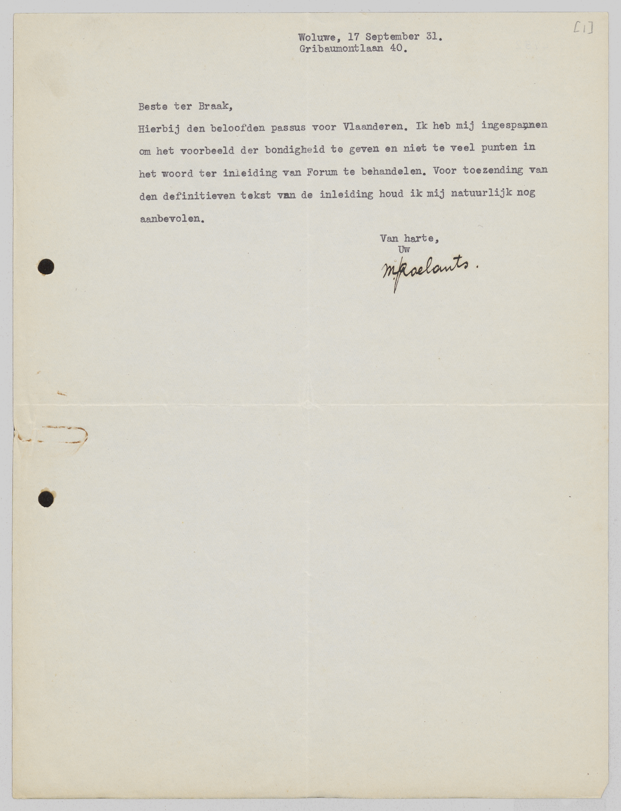 Hierbij den beloofden passus voor Vlaanderen. Ik heb mij ingespannen om het voorbeeld der bondigheid te geven en niet te veel punten in het woord ter inleiding van Forum te behandelen. Voor toezending van den definitieven tekst van de inleiding houd ik mij natuurlijk nog aanbevolen.