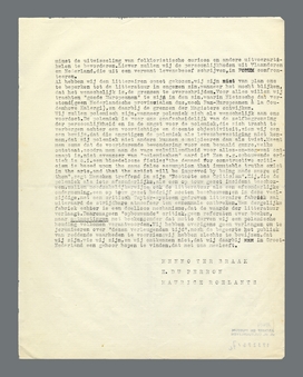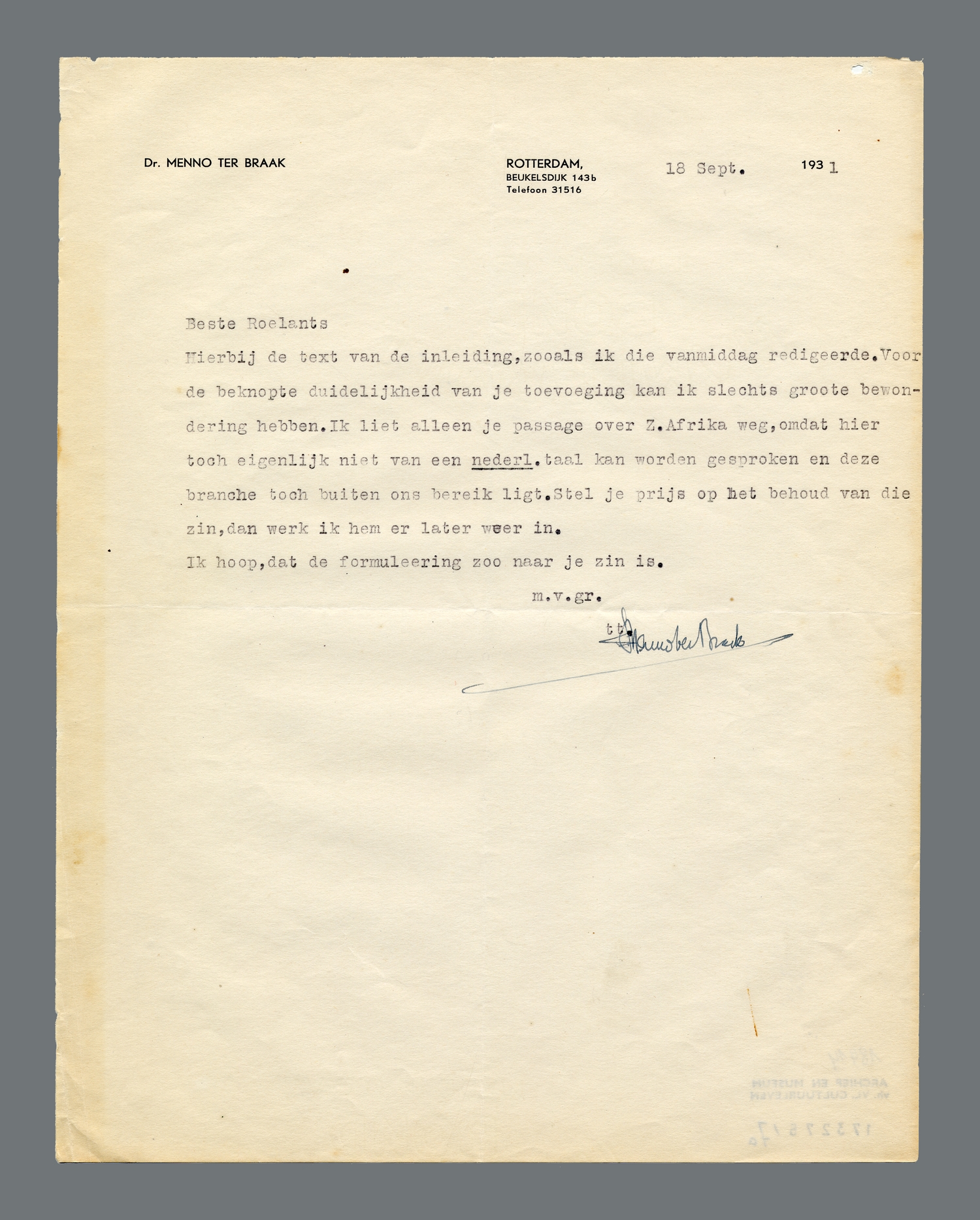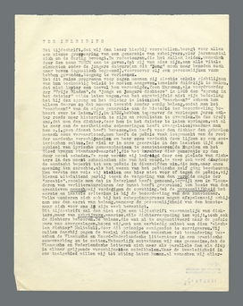 Hierbij de text van de inleiding, zooals ik die vanmiddag redigeerde. Voor de beknopte duidelijkheid van je toevoeging kan ik slechts groote bewondering hebben. Ik liet alleen je passage over Z.Afrika weg, omdat hier toch eigenlijk niet van een nederl. taal kan worden gesproken en deze branche toch buiten ons bereik ligt. Stel je prijs op het behoud van die zin, dan werk ik hem er later weer in.
