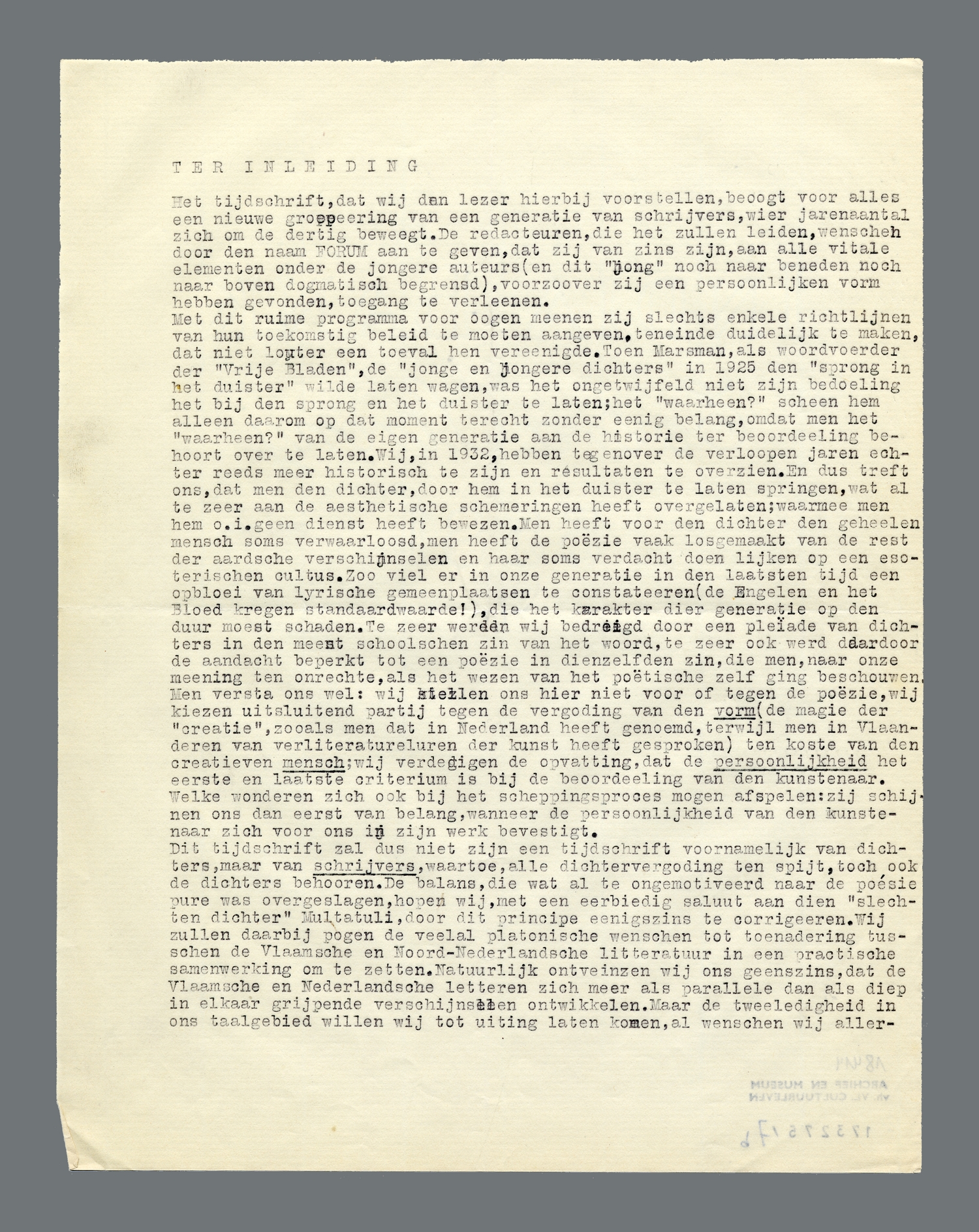Met dit ruime programma voor oogen meenen zij slechts enkele richtlijnen van hun toekomstig beleid te moeten aangeven, teneinde duidelijk te maken, dat niet louter een toeval hen verenigde. Toen Marsman, als woordvoerder der Vrije Bladen, de ‘jonge en jongere dichters’ in 1925 den ‘sprong in het duister’ wilde laten wagen, was het ongetwijfeld niet zijn bedoeling het bij den sprong en het duister te laten; het ‘waarheen?’ scheen hem alleen daarom op dat moment terecht zonder eenig belang, omdat men het ‘waarheen?’ van de eigen generatie aan de historie ter beoordeeling behoort over te laten. Wij, in 1932, hebben tegenover de verloopen jaren echter reeds meer historisch te zijn en resultaten te overzien. En dus treft ons, dat men den dichter, door hem in het duister te laten springen, wat al te zeer aan de aesthetische schemeringen heeft overgelaten; waarmee men hem o.i. geen dienst heeft bewezen. Men heeft voor den dichter den geheelen mensch soms verwaarloosd, men heeft de poëzie vaak losgemaakt van de rest der aardsche verschijnselen en haar soms verdacht doen lijken op een esoterischen cultus. Zoo viel er in onze generatie in den laatsten tijd een opbloei van lyrische gemeenplaatsen te constateeren (de Engelen en het Bloed kregen standaardwaarde!), die het karakter dier generatie op den duur moest schaden. Te zeer werden wij bedreigd door een pleiade van dichters in den meest schoolschen zin van het woord, te zeer ook werd daardoor de aandacht beperkt tot een poëzie in dienzelfden zin, die men, naar onze meening ten onrechte, als het wezen van het poëtische zelf ging beschouwen. Men versta ons wel: wij stellen ons hier niet voor of tegen de poëzie, wij kiezen uitsluitend partij tegen de vergoding van den vorm (de magie der ‘creatie’, zooals men dat in Nederland heeft genoemd, terwijl men in Vlaanderen van verliteratureluren der kunst heeft gesproken) ten koste van den creatieven mensch; wij verdedigen de opvatting, dat de persoonlijkheid het eerste en laatste criterium is bij de beoordeeling van den kunstenaar.