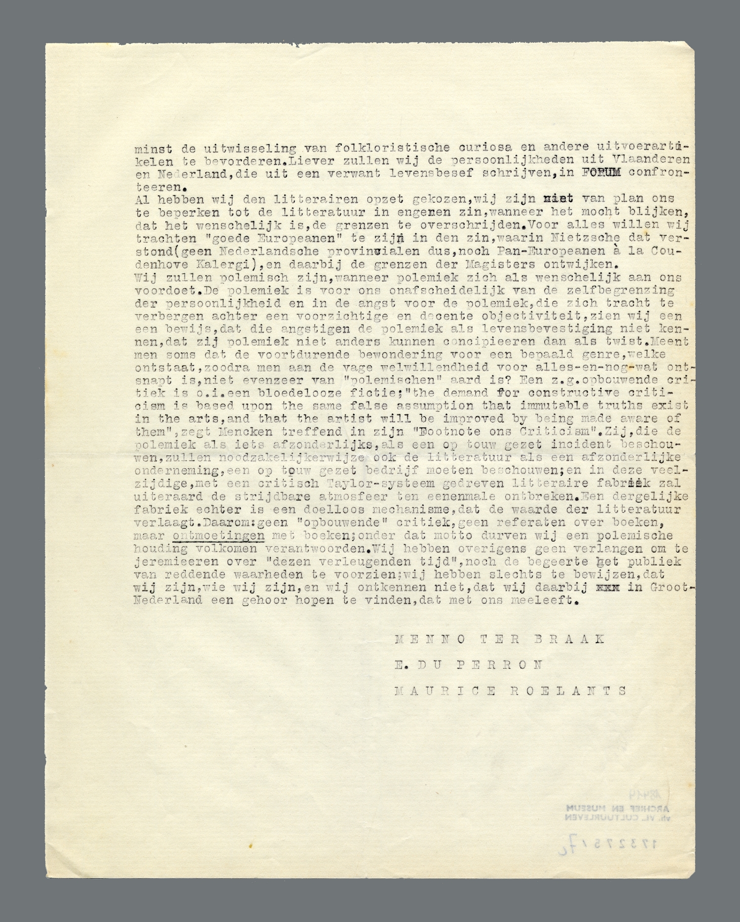 Dit tijdschrift zal dus niet zijn een tijdschrift voornamelijk van dichters, maar van schrijvers, waartoe, alle dichtervergoding ten spijt, toch ook de dichters behooren. De balans, die wat al te ongemotiveerd naar de poésie pure was overgeslagen, hopen wij, met een eerbiedig saluut aan dien ‘slechten dichter’ Multatuli, door dit principe eenigszins te corrigeeren. Wij zullen daarbij pogen de veelal platonische wenschen tot toenadering tusschen de Vlaamsche en Noord-Nederlandse litteratuur in een practische samenwerking om te zetten. Natuurlijk ontveinzen wij ons geenszins, dat de Vlaamsche en Nederlandsche letteren zich meer als parallele dan als diep in elkaar grijpende verschijnselen ontwikkelen. Maar de tweeledigheid in ons taalgebied willen wij tot uiting laten komen, al wenschen wij allerminst de uitwisseling van folkloristische curiosa en andere uitvoerartikelen te bevorderen. Liever zullen wij de persoonlijkheden uit Vlaanderen en Nederland, die uit een verwant levensbesef schrijven, in Forum confronteeren.