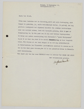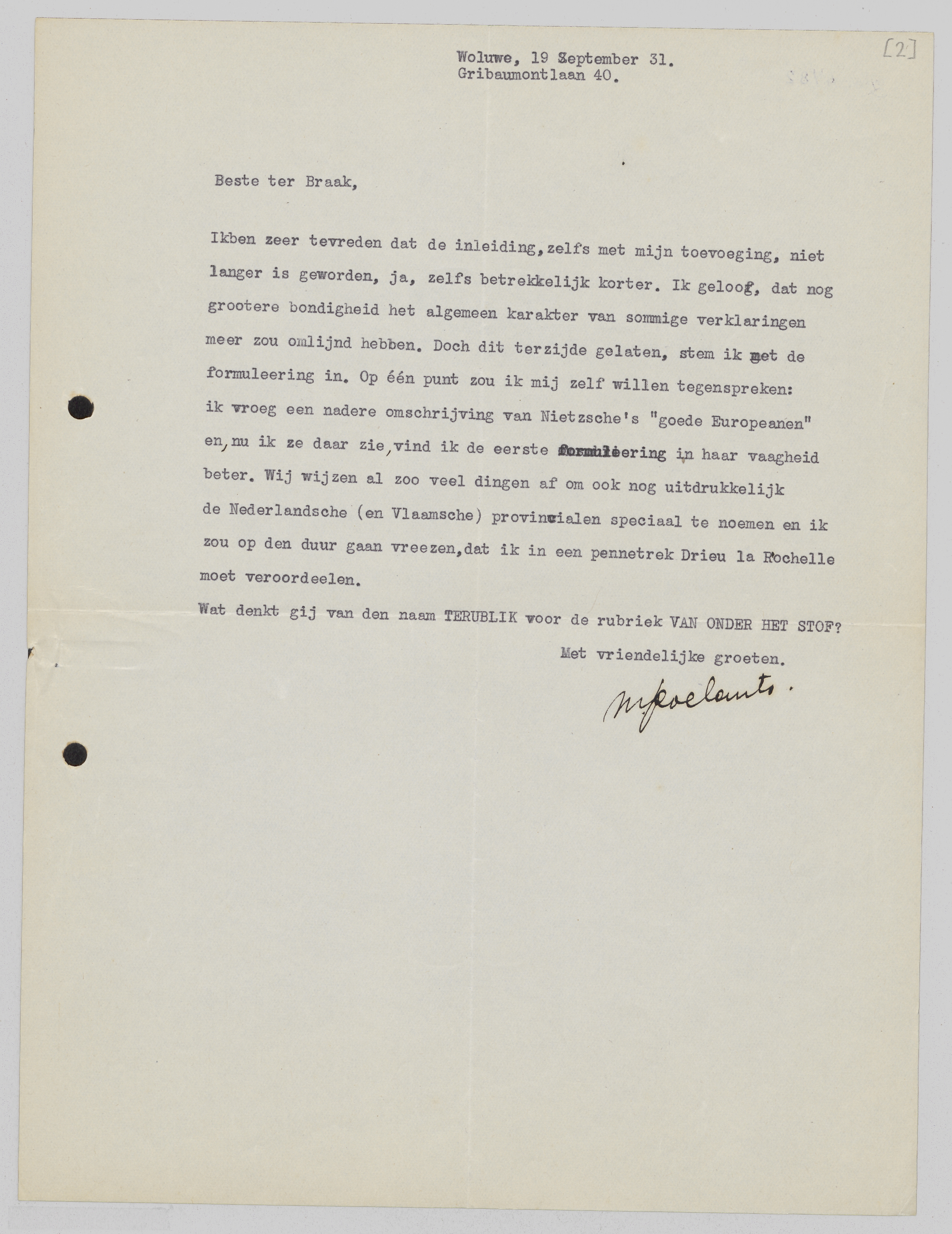 Ik ben zeer tevreden dat de inleiding, zelfs met mijn toevoeging, niet langer is geworden, ja, zelfs betrekkelijk korter. Ik geloof, dat nog grootere bondigheid het algemeen karakter van sommige verklaringen meer zou omlijnd hebben. Doch dit terzijde gelaten, stem ik met de formuleering in. Op één punt zou ik mij zelf willen tegenspreken: ik vroeg een nadere omschrijving van Nietzsche's ‘goede Europeanen’ en, nu ik ze daar zie, vind ik de eerste formuleering in haar vaagheid beter. Wij wijzen al zoo veel dingen af om ook nog uitdrukkelijk de Nederlandsche (en Vlaamsche) provincialen speciaal te noemen en ik zou op den duur gaan vreezen, dat ik in een pennetrek Drieu la Rochelle moet veroordeelen.