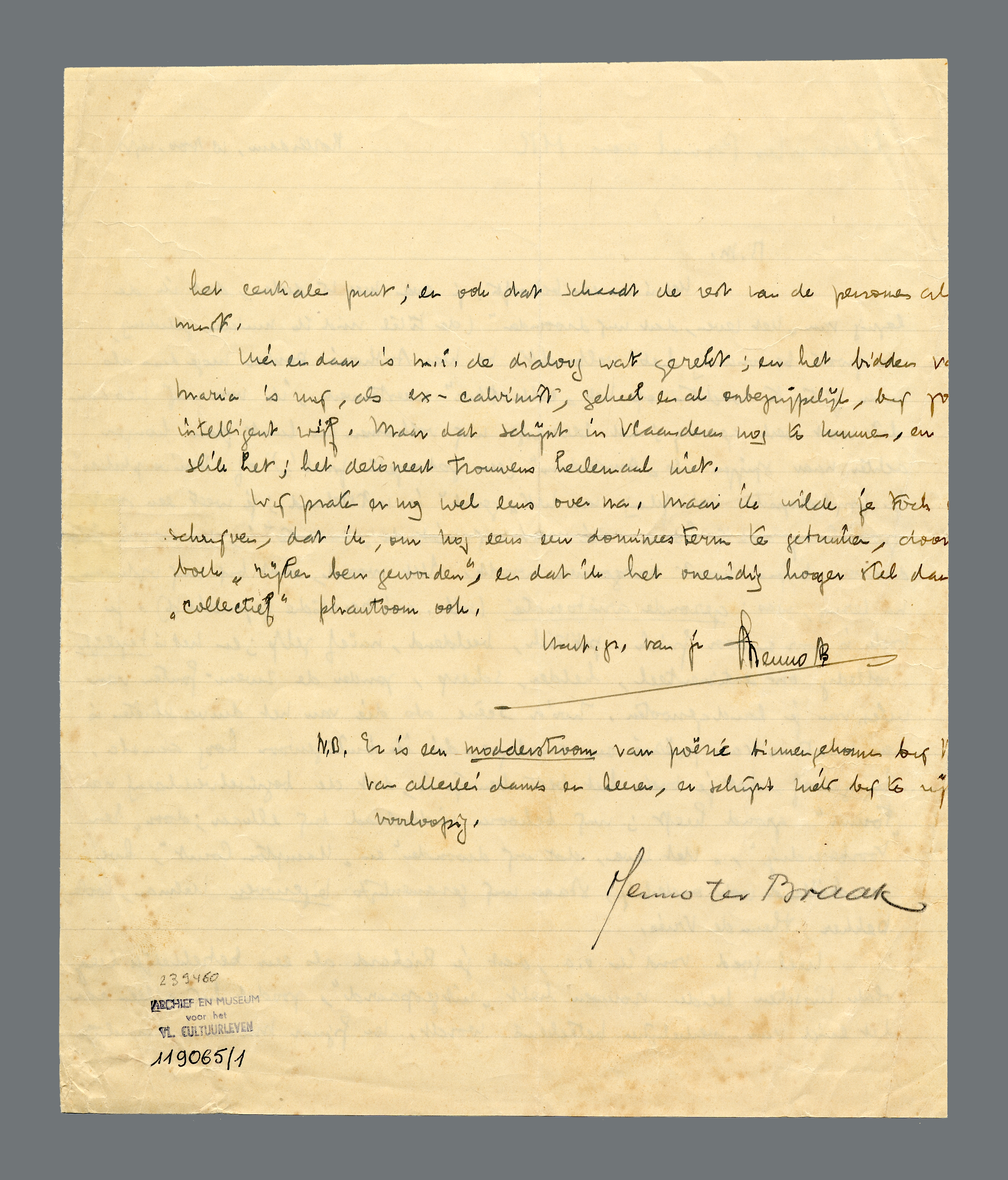 Het is me een behoefte, je even mee te deelen, dat ik de lezing van Het leven, dat wij droomden (de titel vind ik minder gelukkig) met groote bewondering heb volbracht. De heer Anthonie Donker moge dan als maar zitten te wachten op het ‘collectieve’ meesterwerk, ik voor mij heb aan dit soort werk genoeg; het bevredigt mij volkomen en laat geen honger achter naar spijzen als Amsterdam (een godvergeten prul!) of Druivenplukkers. Je psychologische ontrafeling van het ‘geval’ is uitstekend; je weet een soort gevoelslaag aan te boren, die voor mij niet de ‘onderste’ is, maar die juist daarom bijna nooit ontgonnen wordt. Het woord, dat bij mij opkwam, na lezing, was: gezonde aristocratie (selbs. aristocratische gezondheid). Je boek is door en door frisch, poëtisch, beeldend, naïef zelfs; en het is tegelijk volledig onsentimenteel, helder, scherp, zonder de zwam-fouten van velen van je landgenooten. Zoo'n scene als die van het duivenschieten is een mixtuur van poëzie en analyse, die ik buitengewoon hoog aansla. Ik geloof, dat je boek het beste bewijs is, dat de beginselverklaring van Forum grond heeft; wij behooren inderdaad bij elkaar; door Een Voorbereiding, Het leven, dat wij droomden en Hampton Court, hoe verschillend ook onderling, staan wij gezamenlijk tegenover Helman, Coolen, Dekker, Theun de Vries.