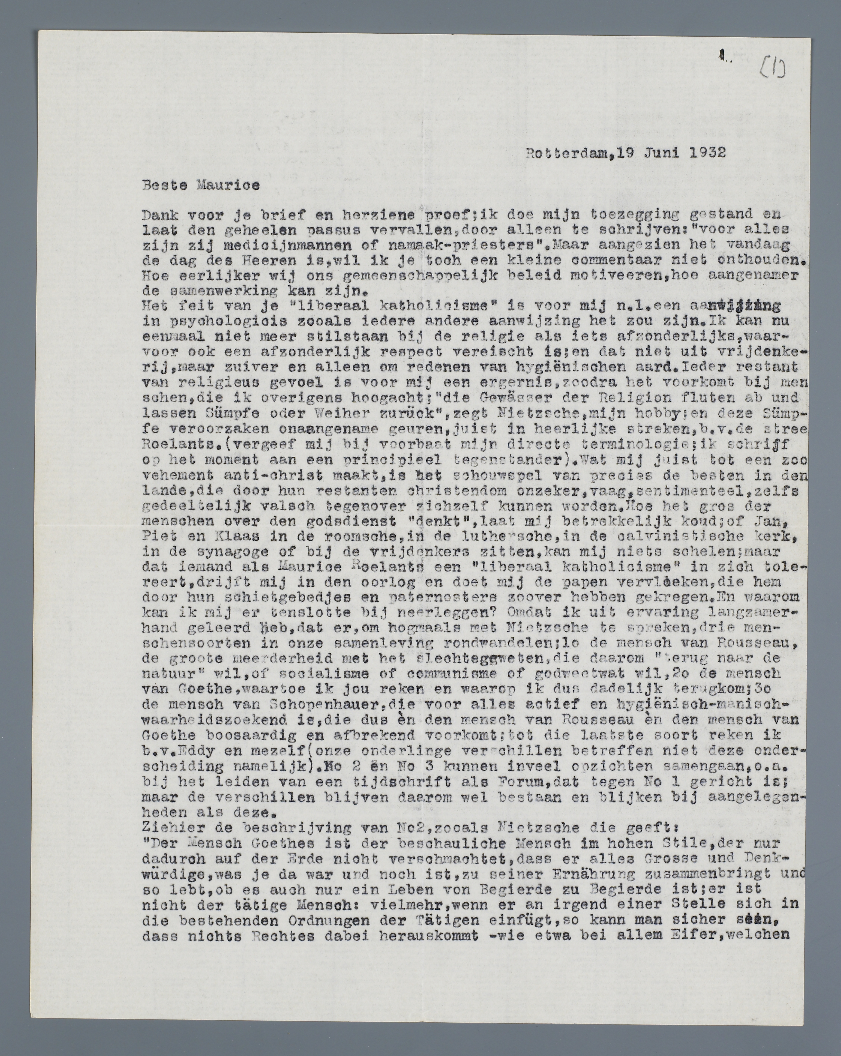 Het feit van je ‘liberaal katholicisme’ is voor mij n.l. een aanwijzing in psychologicis zooals iedere andere aanwijzing het zou zijn. Ik kan nu eenmaal niet meer stilstaan bij de religie als iets afzonderlijks, waarvoor ook een afzonderlijk respect vereischt is; en dat niet uit vrijdenkerij, maar zuiver en alleen om redenen van hygiënischen aard. Ieder restant van religieus gevoel is voor mij een ergemis, zoodra het voorkomt bij menschen, die ik overigens hoogacht; ‘die Gewässer der religion fluten ab und lassen Sümpfe oder Weiher zurück’, zegt Nietzsche, mijn hobby; en deze Sümpfe veroorzaken onaangename geuren, juist in heerlijke streken, b.v. de streek Roelants. (vergeef mij bij voorbaat mijn directe terminologie; ik schrijf op het moment aan een principieel tegenstander). Wat mij juist tot een zoo vehement antichrist maakt, is het schouwspel van precies de besten in den lande, die door hun restanten christendom onzeker, vaag, sentimenteel, zelfs gedeeltelijk valsch tegenover zichzelf kunnen worden. Hoe het gros der menschen over den godsdienst ‘denkt’, laat mij betrekkelijk koud; of Jan, Piet en Klaas in de roomsche, in de luthersche, in de calvinistische kerk, in de synagoge of bij de vrijdenkers zitten, kan mij niets schelen; maar dat iemand als Maurice Roelants een ‘liberaal katholicisme’ in zich tolereert, drijft mij in den oorlog en doet mij de papen vervloeken, die hem door hun schietgebedjes en paternosters zoover hebben gekregen. En waarom kan ik mij er tenslotte bij neerleggen? Omdat ik uit ervaring langzamerhand geleerd heb, dat er, om nogmaals met Nietzsche te spreken, drie menschensoorten in onze samenleving rondwandelen; 1e de mensch van Rousseau, de groote meerderheid met het slechte geweten, die daarom ‘terug naar de natuur’ wil, of socialisme of communisme of godweetwat wil, 2ede mensch van Goethe, waartoe ik jou reken en waarop ik dus dadelijk terugkom; 3e de mensch van Schopenhauer, die voor alles actief en hygiënisch-manisch-waarheidszoekend is, die dus èn den mensch van Rousseau èn den mensch van Goethe boosaardig en afbrekend voorkomt; tot die laatste soort reken ik b.v. Eddy en mezelf (onze onderlinge verschillen betreffen niet deze onderscheiding namelijk). No 2 en No 3 kunnen in veel opzichten samengaan, o.a. bij het leiden van een tijdschrift als Forum, dat tegen No 1 gericht is; maar de verschillen blijven daarom wel bestaan en blijken bij aangelegenheden als deze.