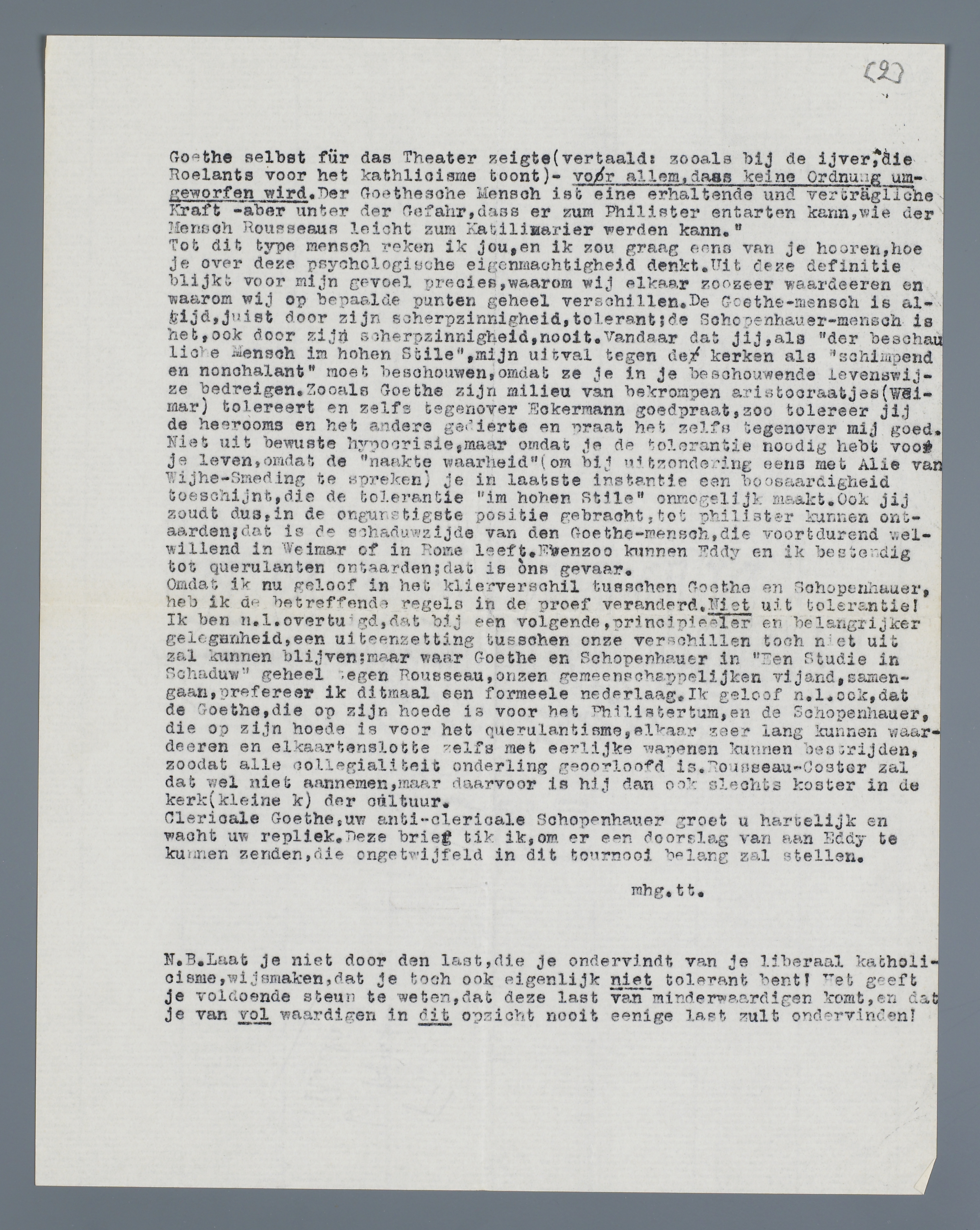 Clericale Goethe, uw anti-clericale Schopenhauer groet u hartelijk en wacht uw repliek. Deze brief tik ik, om er een doorslag van aan Eddy te kunnen zenden, die ongetwijfeld in dit tournooi belang zal stellen.