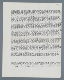 Tot dit type mensch reken ik jou, en ik zou graag eens van je hooren, hoe je over deze psychologische eigenmachtigheid denkt. Uit deze definitie blijkt voor mijn gevoel precies, waarom wij elkaar zoozeer waardeeren en waarom wij op bepaalde punten geheel verschillen. De Goethe-mensch is altijd, juist door zijn scherpzinnigheid, tolerant; de Schopenhauer-mensch is het, ook door zijn scherpzinnigheid, nooit. Vandaar dat jij, als ‘der beschauliche Mensch im hohen Stile’, mijn uitval tegen de kerken als ‘schimpend en nonchalant’ moet beschouwen, omdat ze je in je beschouwende levenswijze bedreigen. Zooals Goethe zijn milieu van bekrompen aristocraatjes (Weimar) tolereert en zelfs tegenover Eckermann goedpraat, zoo tolereer jij de heerooms en het andere gedierte en praat het zelfs tegenover mij goed. Niet uit bewuste hypocrisie, maar omdat je de tolerantie noodig hebt voor je leven, omdat de ‘naakte waarheid’ (om bij uitzondering eens met Alie van Wijhe-Smeding te spreken) je in laatste instantie een boosaardigheid toeschijnt, die de tolerantie ‘im hohen Stile’ onmogelijk maakt. Ook jij zoudt dus, in de ongunstigste positie gebracht, tot philister kunnen ontaarden; dat is de schaduwzijde van den Goethe-mensch, die voortdurend welwillend in Weimar of in Rome leeft. Evenzoo kunnen Eddy en ik bestendig tot querulanten ontaarden; dat is òns gevaar.
