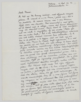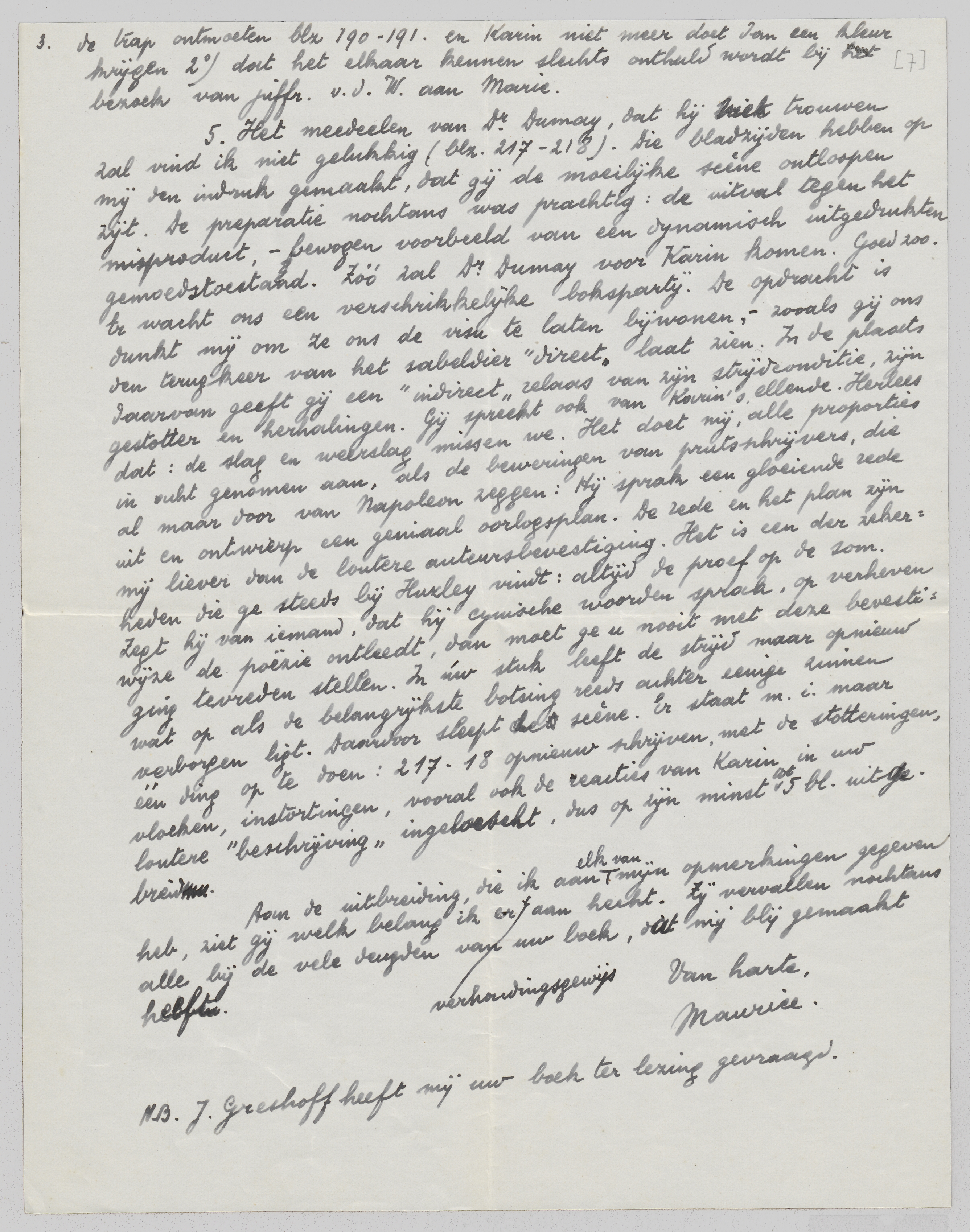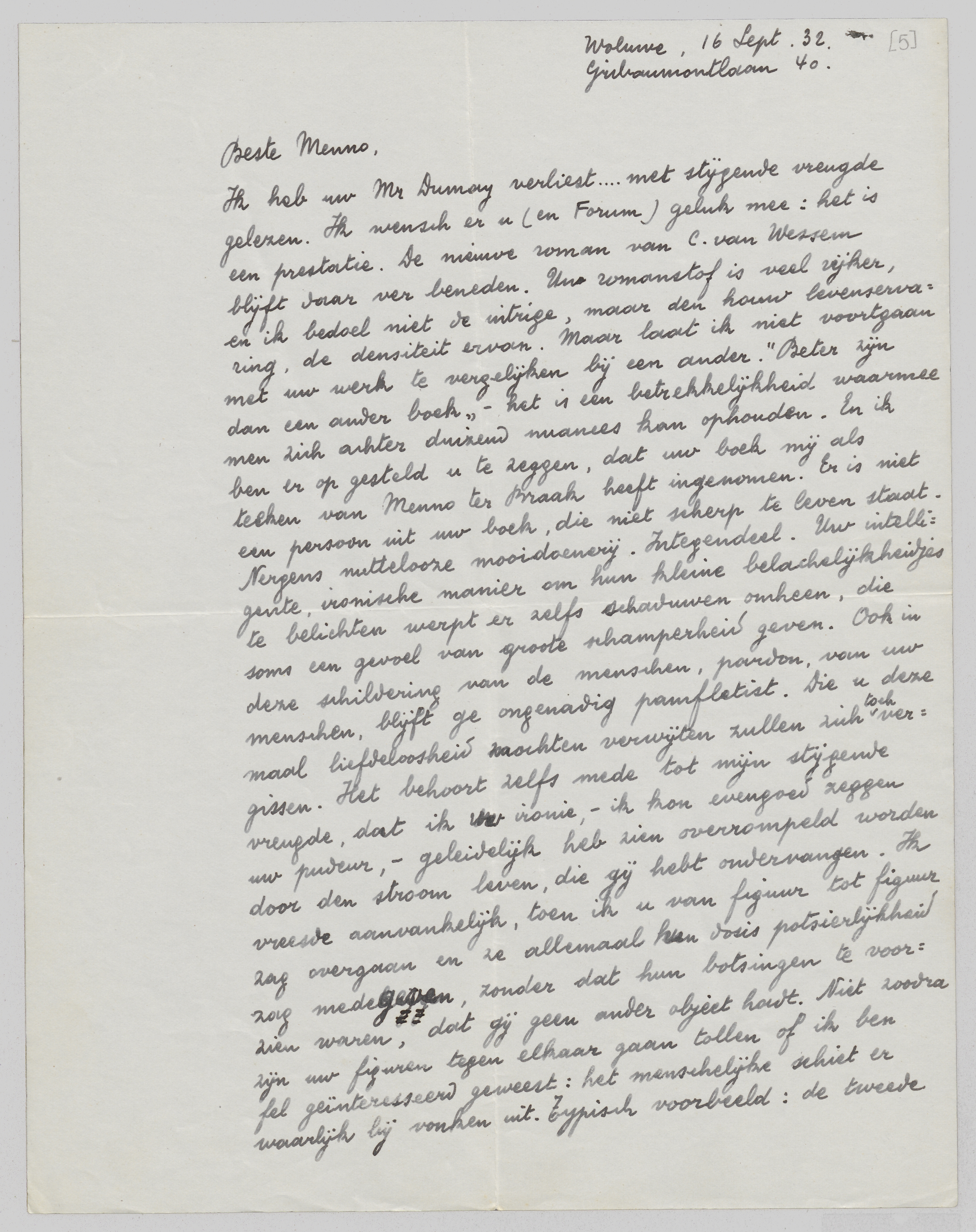 Ik heb uw Mr. Dumay verliest... met stijgende vreugde gelezen. Ik wensch er u (en Forum) geluk mee: het is een prestatie. De nieuwe roman van C. van Wessem blijft daar ver beneden. Uw romanstof is veel rijker, en ik bedoel niet de intrige, maar den houw levenservaring, de densiteit ervan. Maar laat ik niet voortgaan met uw werk te vergelijken bij een ander. ‘Beter zijn dan een ander boek’ - het is een betrekkelijkheid waarmee men zich achter duizend nuances kan ophouden. En ik ben er op gesteld u te zeggen, dat uw boek mij als teeken van Menno ter Braak heeft ingenomen. Er is niet een persoon uit uw boek, die niet scherp te leven staat. Nergens nuttelooze mooidoenerij. Integendeel. Uw intelligente, ironische manier om hun kleine belachelijkheidjes te belichten werpt er zelfs schaduwen omheen, die soms een gevoel van groote schamperheid geven. Ook in deze schildering van de menschen, pardon, van uw menschen, blijft ge ongenadig pamfletist. Die u deze maal liefdeloosheid mochten verwijten zullen zich toch vergissen. Het behoort zelfs mede tot mijn stijgende vreugde, dat ik uw ironie, - ik kon evengoed zeggen uw pudeur, - geleidelijk heb zien overrompeld worden door den stroom leven, die gij hebt ondervangen. Ik vreesde aanvankelijk, toen ik u van figuur tot figuur zag overgaan en ze allemaal hun dosis potsierlijkheid zag mede[gegeven], zonder dat hun botsingen te voorzien waren, dat gij geen ander object hadt. Niet zoodra zijn uw figuren tegen elkaar gaan tollen of ik ben fel geïnteresseerd geweest: het menschelijke schiet er waarlijk bij vonken uit. Typisch voorbeeld: de tweede terugkeer van het dronken sabeldier is een prachtig mengsel van groteske onnoozelheid en oprechte meewarigheid. Er zijn trouwens meer van die subtiele dooreenschuivingen van aard en gevoel, van onsublieme en streng gepeilde verhoudingen in uw boek en waardoor het uitstijgt boven al te verstandig sarcasme. Kortom, ik ben tevreden over die biecht, zonder het aanstellerige van een biecht, die, wonder samentreffen, mij voor een goed deel persoonlijke belevenis is geweest. Maar dat is een ander paar mouwen...