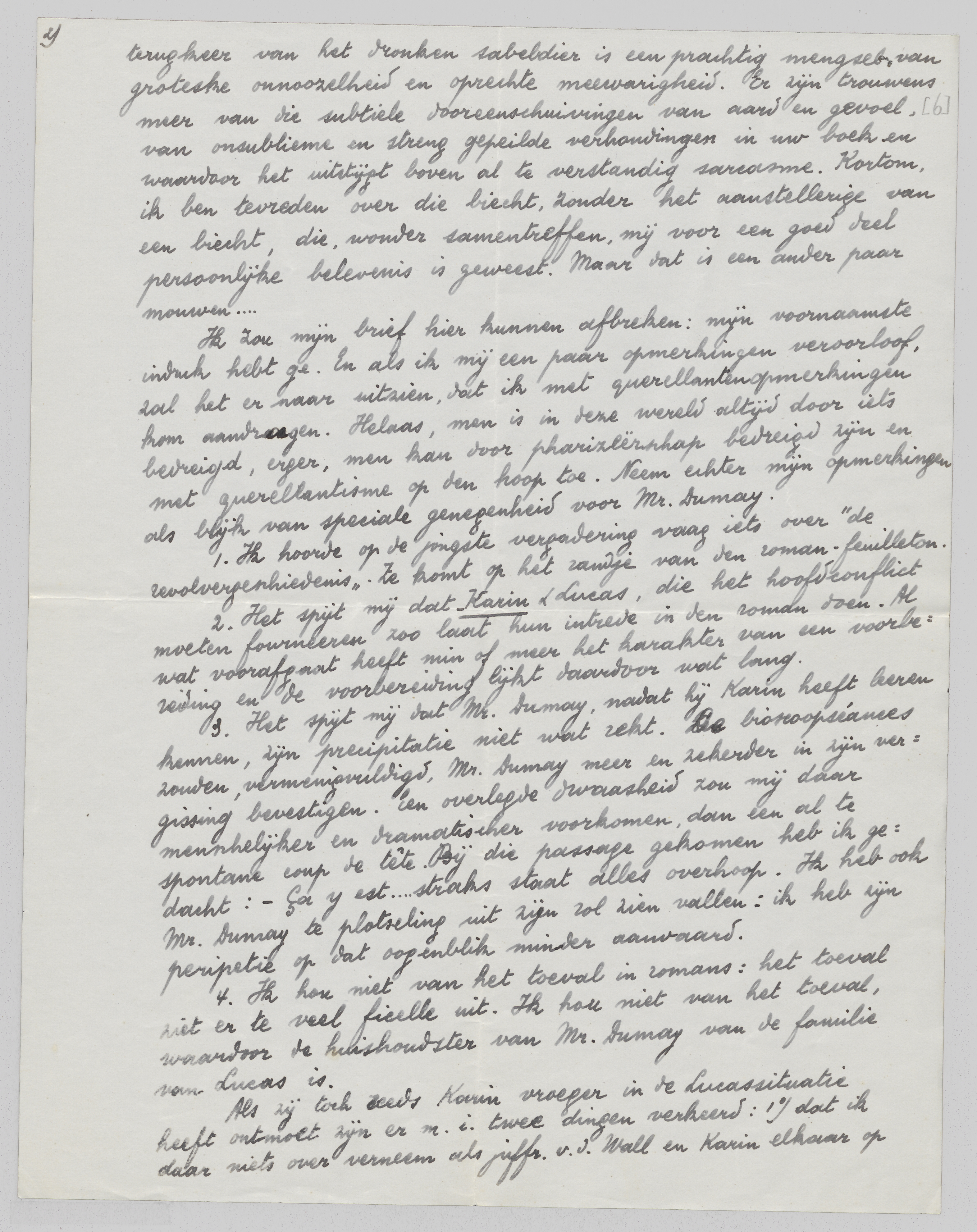 Ik zou mijn brief hier kunnen afbreken: mijn voornaamste indruk hebt ge. En als ik mij een paar opmerkingen veroorloof, zal het er naar uitzien, dat ik met querellantenopmerkingen kom aandragen. Helaas, men is in deze wereld altijd door iets bedreigd, erger, men kan door pharizeërschap bedreigd zijn en met querellantisme op den koop toe. Neem echter mijn opmerkingen als blijk van speciale genegenheid voor Mr. Dumay.