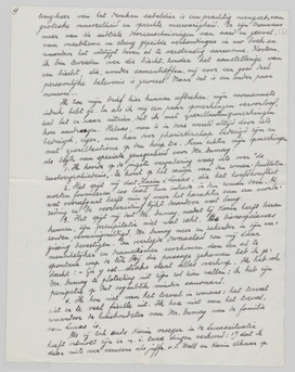 5. Het meedeelen van Dr. Dumay, dat hij niet trouwen zal, vind ik niet gelukkig (biz. 217-218). Die bladzijden hebben op mij den indruk gemaakt, dat gij de moeilijke scène ontloopen zijt. De preparatie nochtans was prachtig: de uitval tegen het misproduct,- bewogen voorbeeld van een dynamisch uitgedrukten gemoedtoestand. Zóó zal Dr. Dumay voor Karin komen. Goed zoo. Er wacht ons een verschrikkelijke bokspartij. De opdracht is dunkt mij om ze ons de [visu] te laten bijwonen, -zooals gij ons den terugkeer ven het sabeldier ‘direct’ laat zien. In de plaats daarvan geeft gij een ‘indirect’ relaas van zijn strijdconditie, zijn gestotter en herhalingen. Gij spreekt ook van Karin's ellende. Herlees dat: de slag en weerslag missen we. Het doet mij, alle proporties in acht genomen aan, als de beweringen van prutsschrijvers, die al maar door van Napoleon zeggen: Hij sprak een gloeiende rede uit en ontwierp een geniaal oorlogsplan. De rede en het plan zijn mij liever dan de loutere auteursbevestiging. Het is een der zekerheden die ge steeds bij Huxley vindt: altijd de proef op de som. Zegt hij van iemand, dat hij cynische woorden sprak, op verheven wijze de poëzie ontleedt, dan moet ge u nooit met deze bevestiging tevreden stellen. In úw stuk leeft de strijd maar opnieuw wat op als de belangrijkste botsing reeds achter eenige zinnen verborgen ligt. Daardoor sleept de scène. Er staat m.i. maar één ding op te doen: 217-218 opnieuw schrijven, met de stotteringen, vloeken, instortingen, vooral ook de readies van Karin in uw loutere ‘beschrijving’ ingelascht, dus op zijn minst tot 5 blz. uitgebreid.