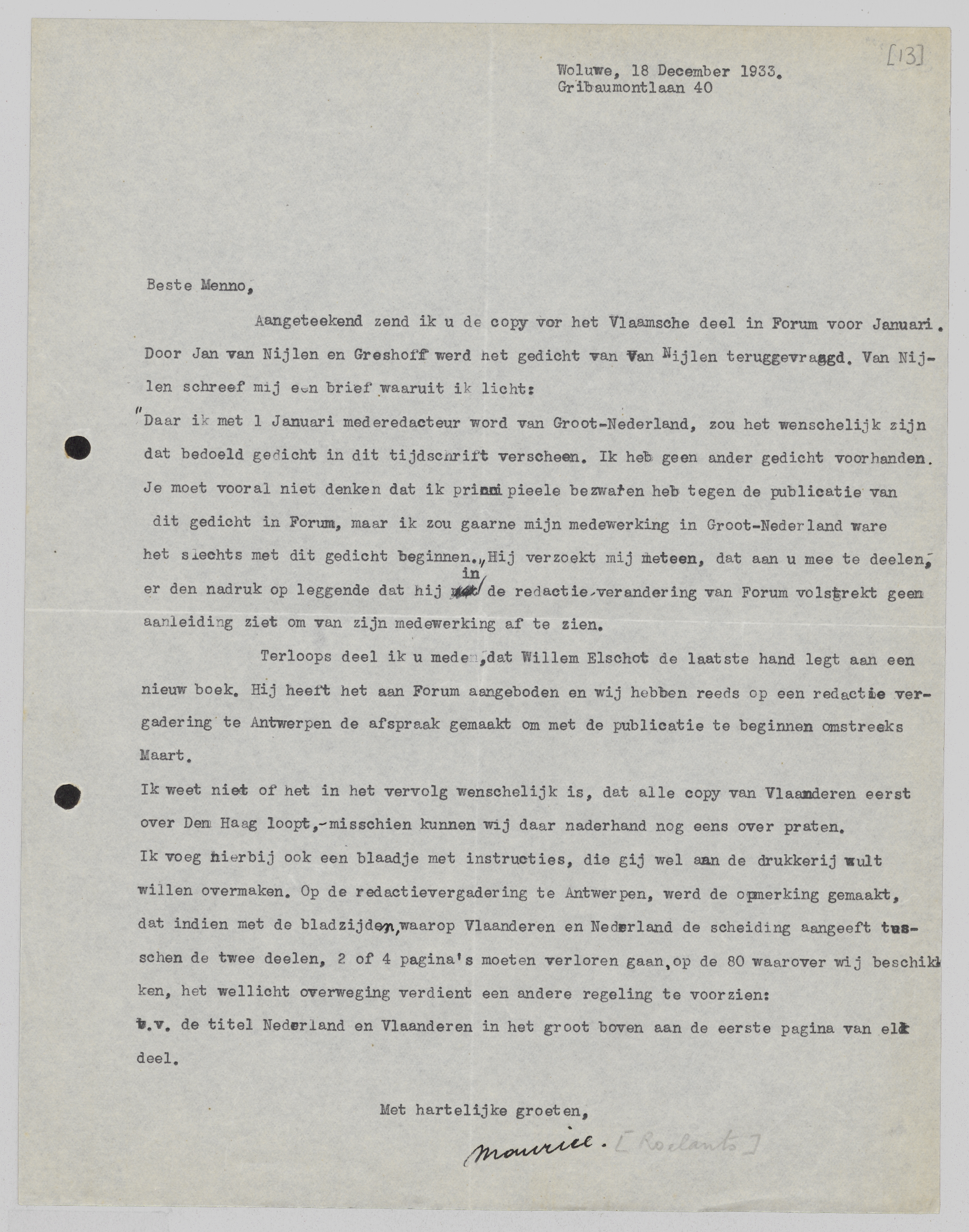 Aangeteekend zend ik u de copy voor het Vlaamsche deel in Forum voor Januari. Door Jan van Nijlen en Greshoff werd het gedicht van Van Nijlen teruggevraagd. Van Nijlen schreef mij een brief waaruit ik licht: