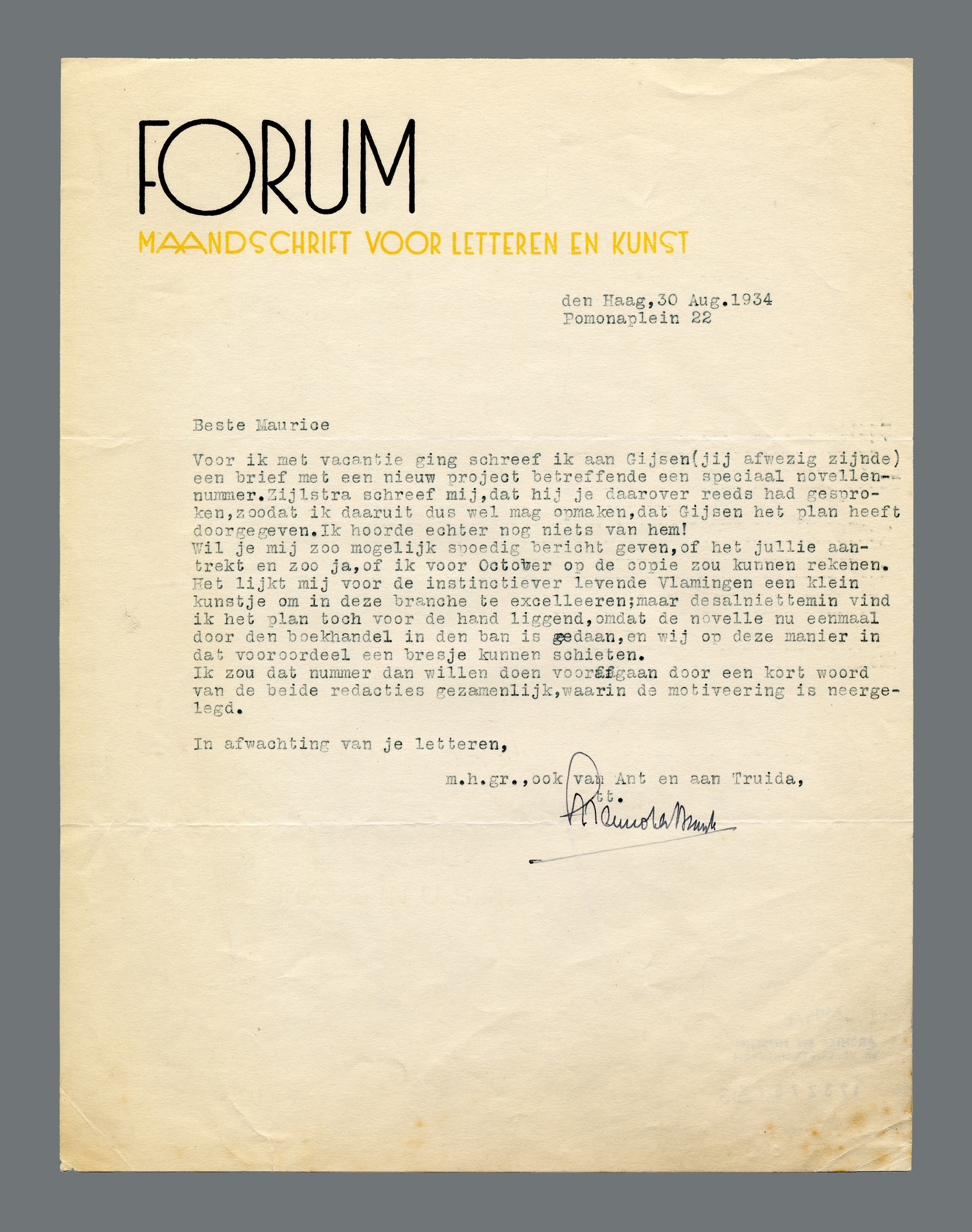 Voor ik met vacantie ging schreef ik aan Gijsen (jij afwezig zijnde) een brief met een nieuw project betreffende een speciaal novellennummer. Zijlstra schreef mij, dat hij je daarover reeds had gesproken, zoodat ik daaruit dus wel mag opmaken, dat Gijsen het plan heeft doorgegeven. Ik hoorde echter nog niets van hem!