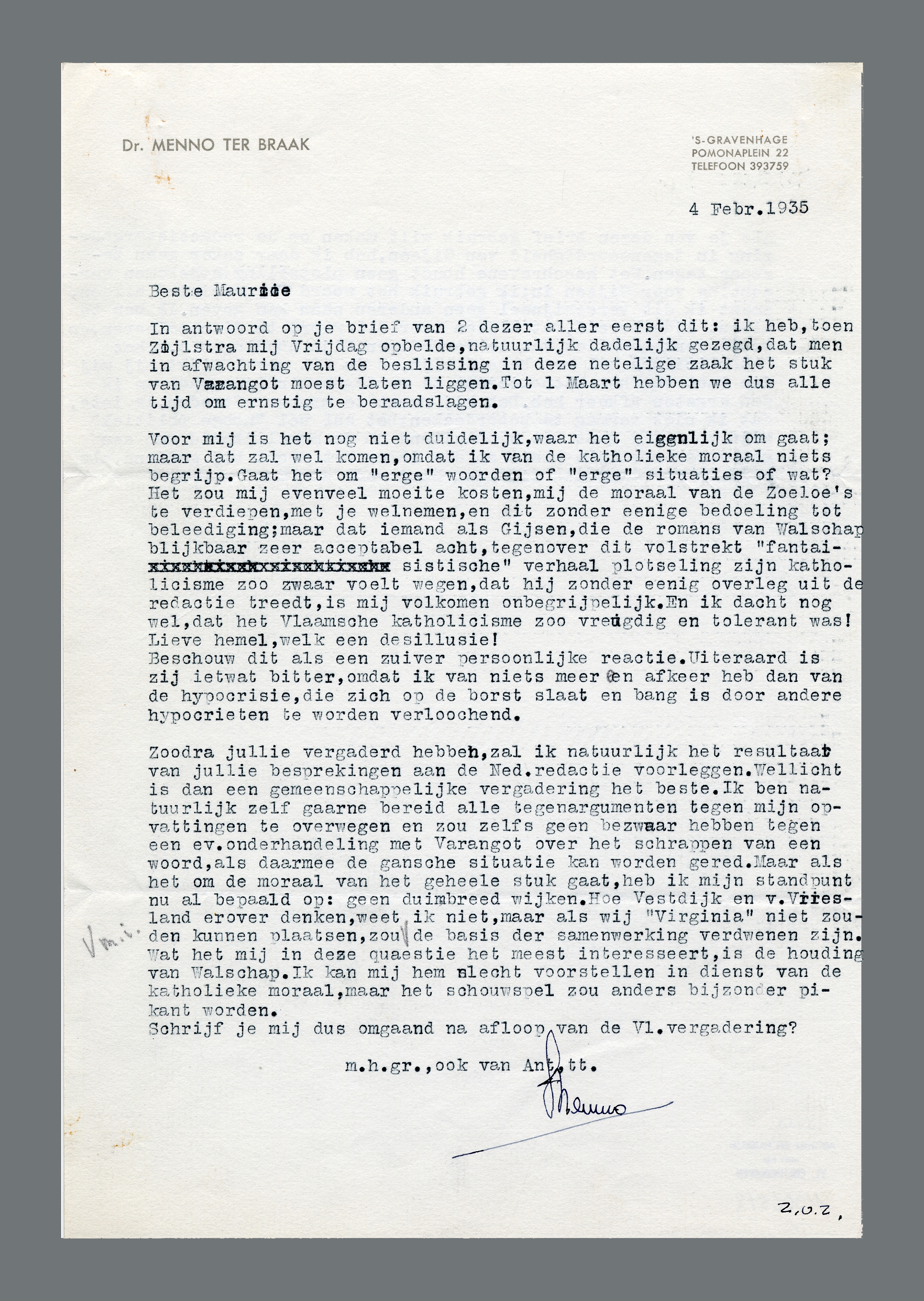 Zoodra jullie vergaderd hebben, zal ik natuurlijk het resultaat van jullie besprekingen aan de Ned. redactie voorleggen. Wellicht is dan een gemeenschappelijke vergadering het beste. Ik ben natuurlijk zelf gaarne bereid alle tegenargumenten tegen mijn opvattingen te overwegen en zou zelfs geen bezwaar hebben tegen een ev. onderhandeling met Varangot over het schrappen van een woord, als daarmee de gansche situatie kan worden gered. Maar als het om de moraal van het geheele stuk gaat, heb ik mijn standpunt nu al bepaald op: geen duimbreed wijken. Hoe Vestdijk en v. Vriesland erover denken, weet ik niet, maar als wij Virginia niet zouden kunnen plaatsen, zou m.i. de basis der samenwerking verdwenen zijn. Wat het mij in deze quaestie het meest interesseert, is de houding van Walschap. Ik kan mij hem slecht voorstellen in dienst van de katholieke moraal, maar het schouwspel zou anders bijzonder pikant worden.