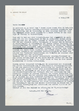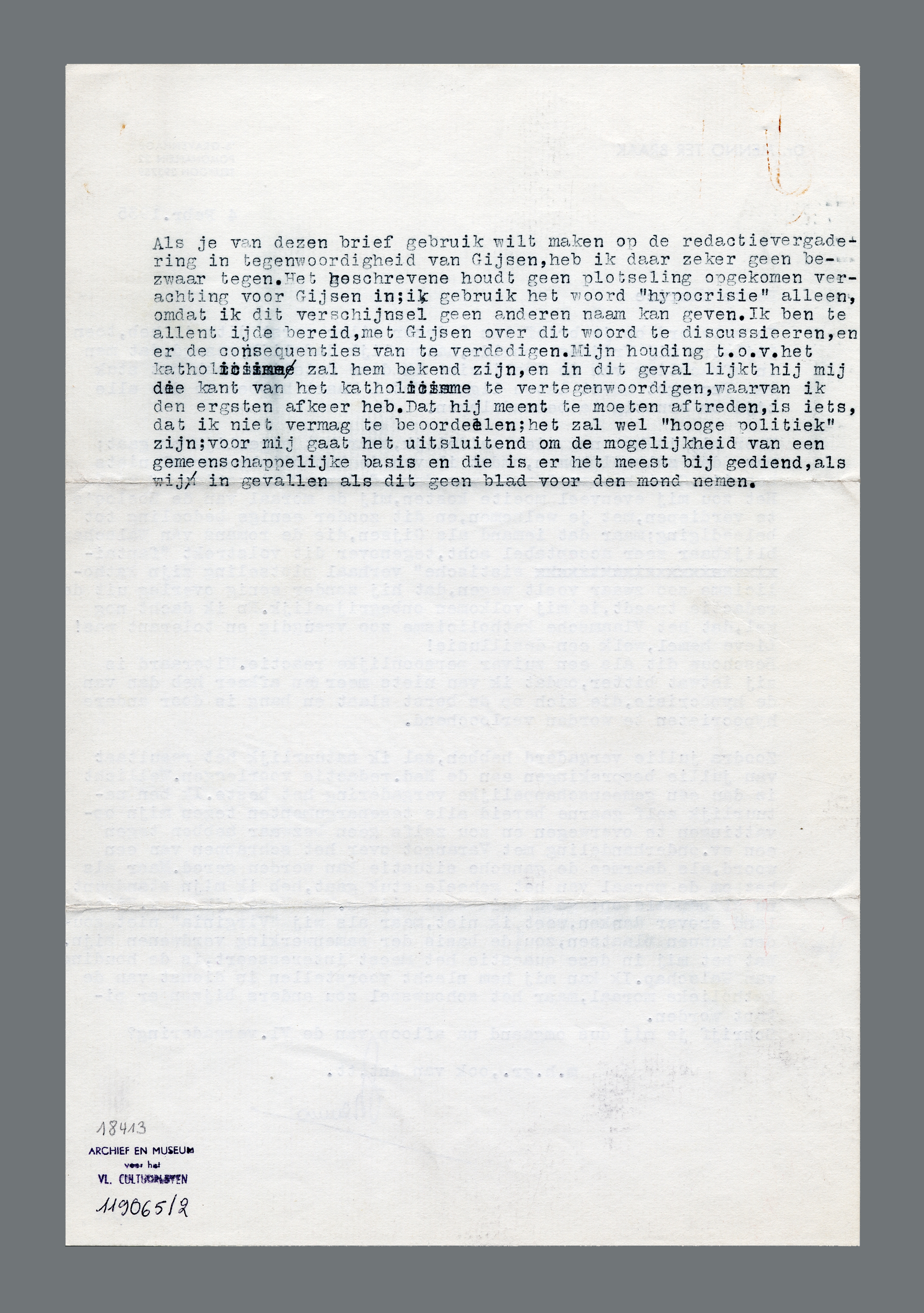 Als je van dezen brief gebruik wilt maken op de redactievergadering in tegenwoordigheid van Gijsen, heb ik daar zeker geen bezwaar tegen. Het beschrevene houdt geen plotseling opgekomen verachting voor Gijsen in; ik gebruik het woord ‘hypocrisie’ alleen, omdat ik dit verschijnsel geen anderen naam kan geven. Ik ben te allen tijde bereid, met Gijsen over dit woord te discussieeren, en er de consequenties van te verdedigen. Mijn houding t.o.v. het katholicisme zal hem bekend zijn, en in dit geval lijkt hij mij die kant van het katholicisme te vertegenwoordigen, waarvan ik den ergsten afkeer heb. Dat hij meent te moeten aftreden, is iets, dat ik niet vermag te beoordeelen; het zal wel ‘hooge politiek’ zijn; voor mij gaat het uitsluitend om de mogelijkheid van een gemeenschappelijke basis en die is er het meest bij gediend, als wij in gevallen als dit geen blad voor den mond nemen.