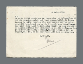 Na mijn brief gesloten en verzonden te hebben, kom ik tot de conclusie, dat het toch waarschijnlijk beter is, dat je mijn reactie als voorloopig zuiver persoonlijk beschouwt en er de besprekingen a.s. Woensdag niet door laat beïnvloeden. Mocht er een openlijke uiteenzetting der standpunten noodig zijn, dan ben ik natuurlijk altijd bereid, Gijsen precies dat te zeggen, wat ik jou nu vertrouwelijk heb geschreven.