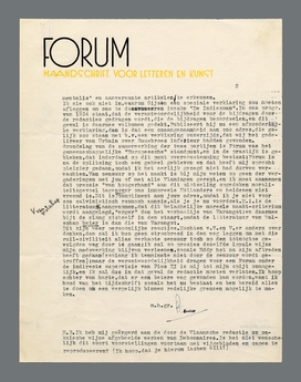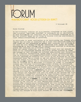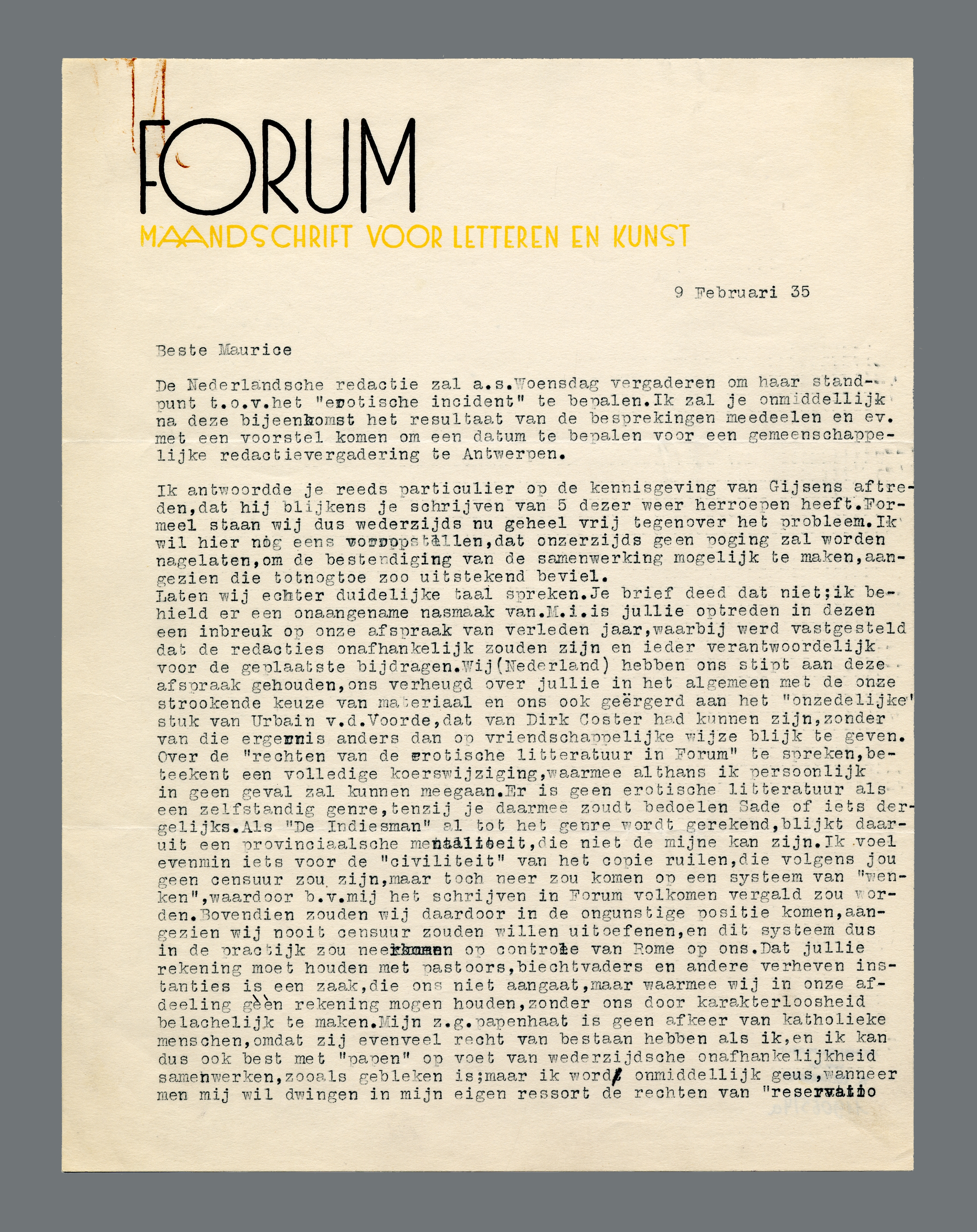 Laten wij echter duidelijke taal spreken. Je brief deed dat niet; ik behield er een onaangename nasmaak van. M.i. is jullie optreden in dezen een inbreuk op onze afspraak van verleden jaar, waarbij werd vastgesteld dat de redacties onafhankelijk zouden zijn en ieder verantwoordelijk voor de geplaatste bijdragen. Wij (Nederland) hebben ons stipt aan deze afspraak gehouden, ons verheugd over jullie in het algemeen met de onze strookende keuze van materiaal en ons ook geërgerd aan het ‘onzedelijke’ stuk van Urbain v.d. Voorde, dat van Dirk Coster had kunnen zijn, zonder van die ergernis anders dan op vriendschappelijke wijze blijk te geven. Over de ‘rechten van de erotische litteratuur in Forum’ te spreken, beteekent een volledige koerswijziging, waarmee althans ik persoonlijk in geen geval zal kunnen meegaan. Er is geen erotische litteratuur als een zelfstandig genre, tenzij je daarmee zoudt bedoelen Sade of iets dergelijks. Als De Indiesman’ al tot het genre wordt gerekend, blijkt daaruit een provinciaalsche mentaliteit, die niet de mijne kan zijn. Ik voel evenmin iets voor de ‘civiliteit’ van het copie ruilen, die volgens jou geen censuur zou zijn, maar toch neer zou komen op een systeem van ‘wenken’, waardoor b.v. mij het schrijven in Forum volkomen vergald zou worden. Bovendien zouden wij daardoor in de ongunstige positie komen, aangezien wij nooit censuur zouden willen uitoefenen, en dit systeem dus in de practijk zou neerkomen op controle van Rome op ons. Dat jullie rekening moet houden met pastoors, biechtvaders en andere verheven instanties is een zaak, die ons niet aangaat, maar waarmee wij in onze afdeeling gèèn rekening mogen houden, zonder ons door karakterloosheid belachelijk te maken. Mijn z.g. papenhaat is geen afkeer van katholieke menschen, omdat zij evenveel recht van bestaan hebben als ik, en ik kan dus ook best met ‘papen’ op voet van wederzijdsche onafhankelijkheid samenwerken, zooals gebleken is; maar ik word onmiddellijk geus, wanneer men mij wil dwingen in mijn eigen ressort de rechten van ‘reservatio mentalis’ en aanverwante artikelen te erkennen.