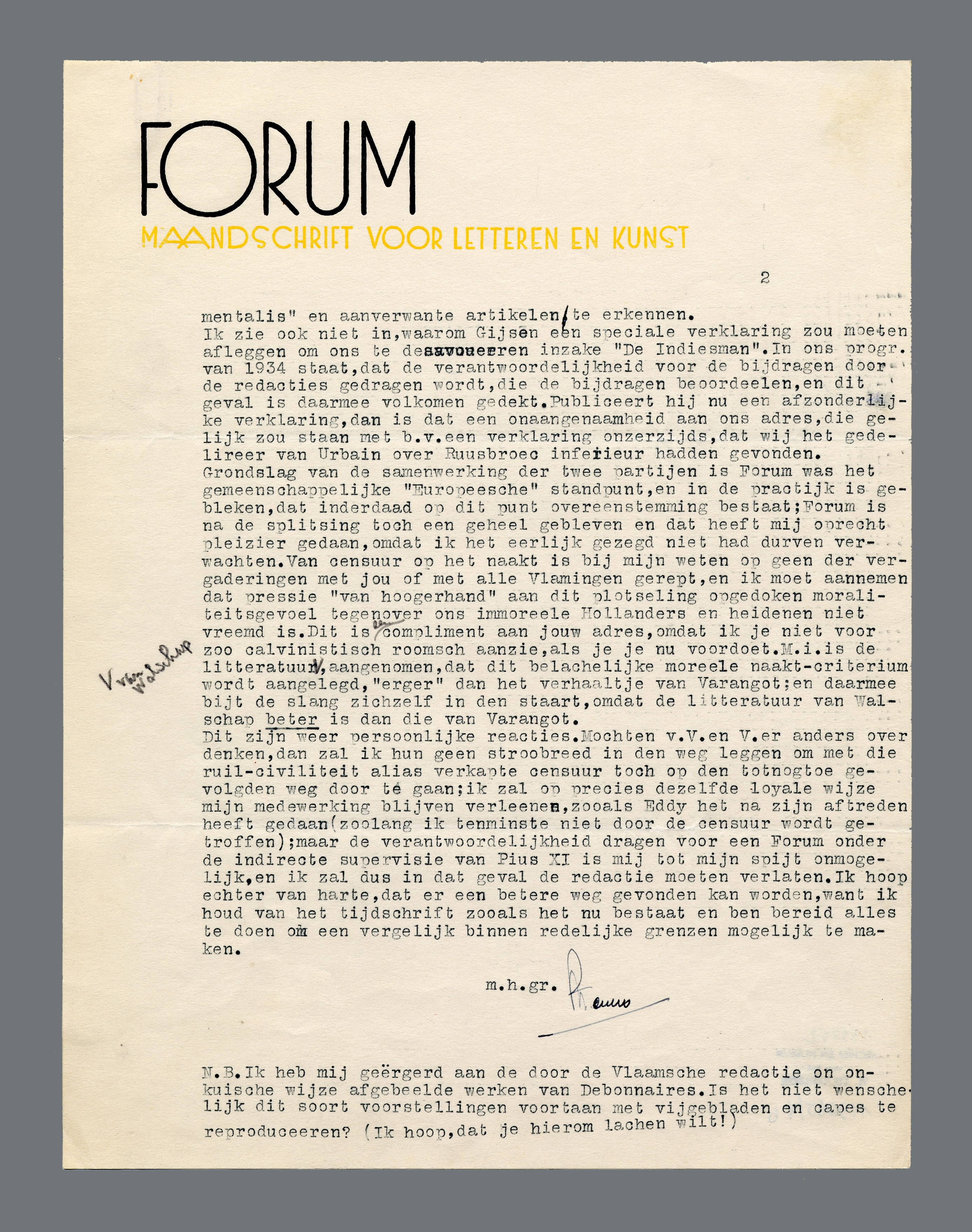 Dit zijn weer persoonlijke readies. Mochten v.V. en V. er anders over denken, dan zal ik hun geen stroobreed in den weg leggen om met die ruil-civiliteit alias verkapte censuur toch op den totnogtoe gevolgden weg door te gaan; ik zal op precies dezelfde loyale wijze mijn medewerking blijven verleenen, zooals Eddy het na zijn aftreden heeft gedaan (zoolang ik tenminste niet door de censuur wordt getroffen); maar de verantwoordelijkheid dragen voor een Forum onder de indirecte supervisie van Pius XI is mij tot mijn spijt onmogelijk, en ik zal dus in dat geval de redactie moeten verlaten. Ik hoop echter van harte, dat er een betere weg gevonden kan worden, want ik houd van het tijdschrift zooals het nu bestaat en ben bereid alles te doen om een vergelijk binnen redelijke grenzen mogelijk te maken.