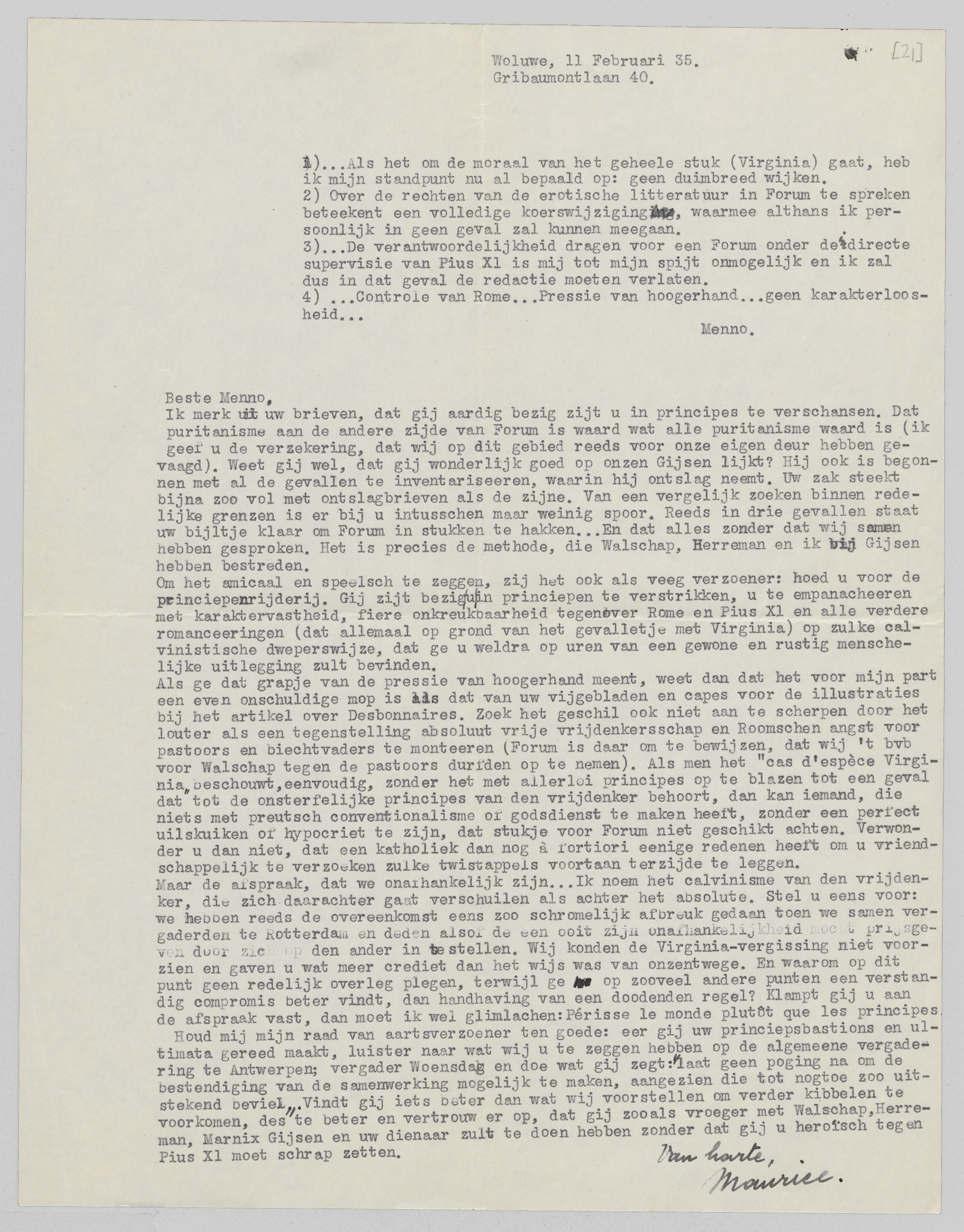 Als ge dat grapje van de pressie van hoogerhand meent, weet dan dat het voor mijn part een even onschuldige mop is als dat van uw vijgebladen en capes voor de illustrates bij het artikel over Desbonnaires. Zoek het geschil ook niet aan te scherpen door het louter als een tegenstelling absoluut vrije vrijdenkersschap en Roomschen angst voor pastoors en biechtvaders te monteeren (Forum is daar om te bewijzen, dat wij 't bvb voor Walschap tegen de pastoors durfden op te nemen). Als men het ‘cas d'espèce Virginia’ beschouwt, eenvoudig, zonder het met allerlei principes op te blazen tot een geval dat tot de onsterfelijke pricipes van den vrijdenker behoort, dan kan iemand, die niets met preutsch conventionalisme of godsdienst te maken heeft, zonder een perfect uilskuiken of hypocriet te zijn, dat stukje voor Forum niet geschikt achten. Verwonder u dan niet, dat een katholiek dan nog à fortiori eenige redenen heeft om u vriendschappelijk te verzoeken zulke twistappels voortaan terzijde te leggen.