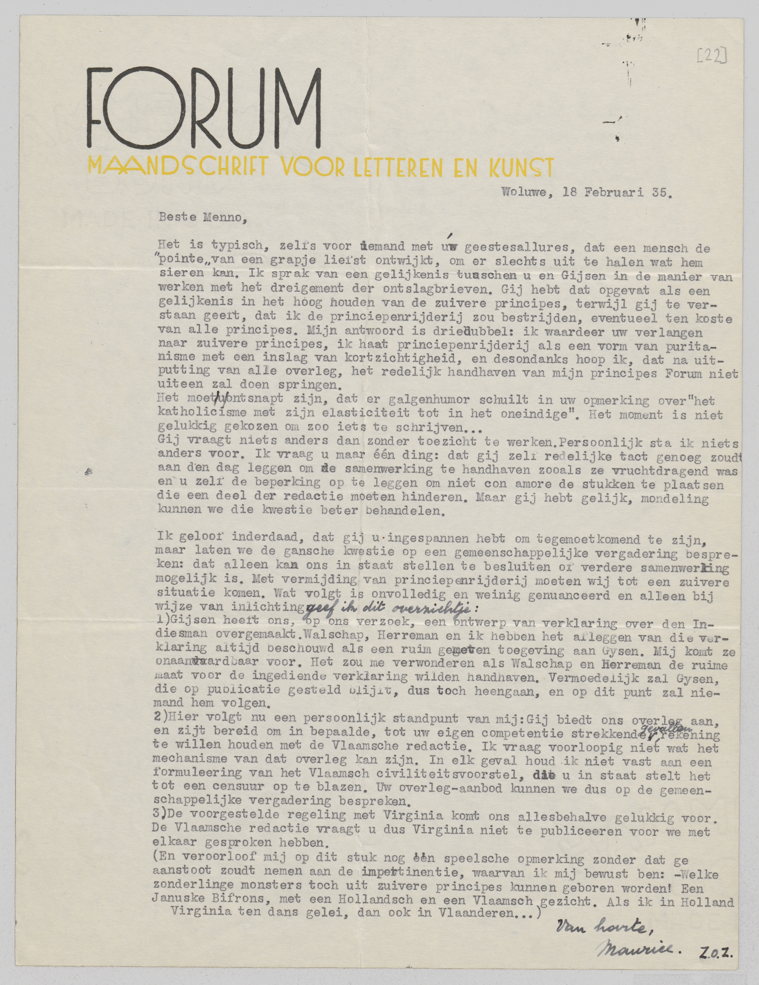 Het is typisch, zelfs voor iemand met uw geestesallures, dat een mensch de ‘pointe’ van een grapje liefst ontwijkt, om er slechts uit te halen wat hem sieren kan. Ik sprak van een gelijkenis tusschen u en Gijsen in de manier van werken met het dreigement der ontslagbrieven. Gij hebt dat opgevat als een gelijkenis in het hoog houden van de zuivere principes, terwijl gij te verstaan geeft, dat ik de princiepenrijderij zou bestrijden, eventueel ten koste van alle principes. Mijn antwoord is driedubbel: ik waardeer uw verlangen naar zuivere principes, ik haat priciepenrijderij als een vorm van puritanisme met een inslag van kortzichtigheid, en desondanks hoop ik, dat na uitputting van alle overleg, het redelijk handhaven van mijn principes Forum niet uiteen zal doen springen.
