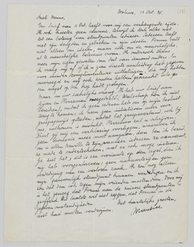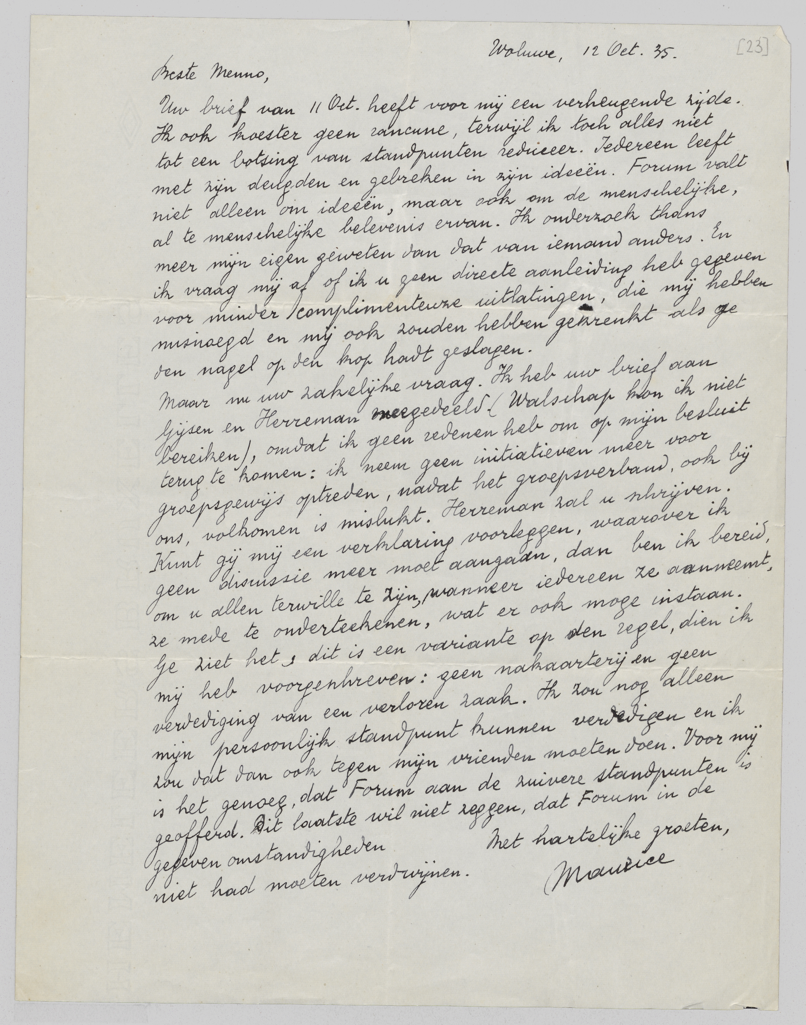 Uw brief van 11 Oct. heeft voor mij een verheugende zijde. Ik ook koester geen rancune, terwijl ik toch alles niet tot een botsing van standpunten reduceer. Iedereen leeft met zijn deugden en gebreken in zijn ideeën. Forum valt niet alleen om ideeën, maar ook om de menschelijke, al te menschelijke belevenis ervan. Ik onderzoek thans meer mijn eigen geweten dan dat van iemand anders. En ik vraag mij af of ik u geen directe aanleiding heb gegeven voor minder complimenteuze uitlatingen, die mij hebben misnoegd en mij ook zouden hebben gekrenkt als ge den nagel op den kop hadt geslagen.