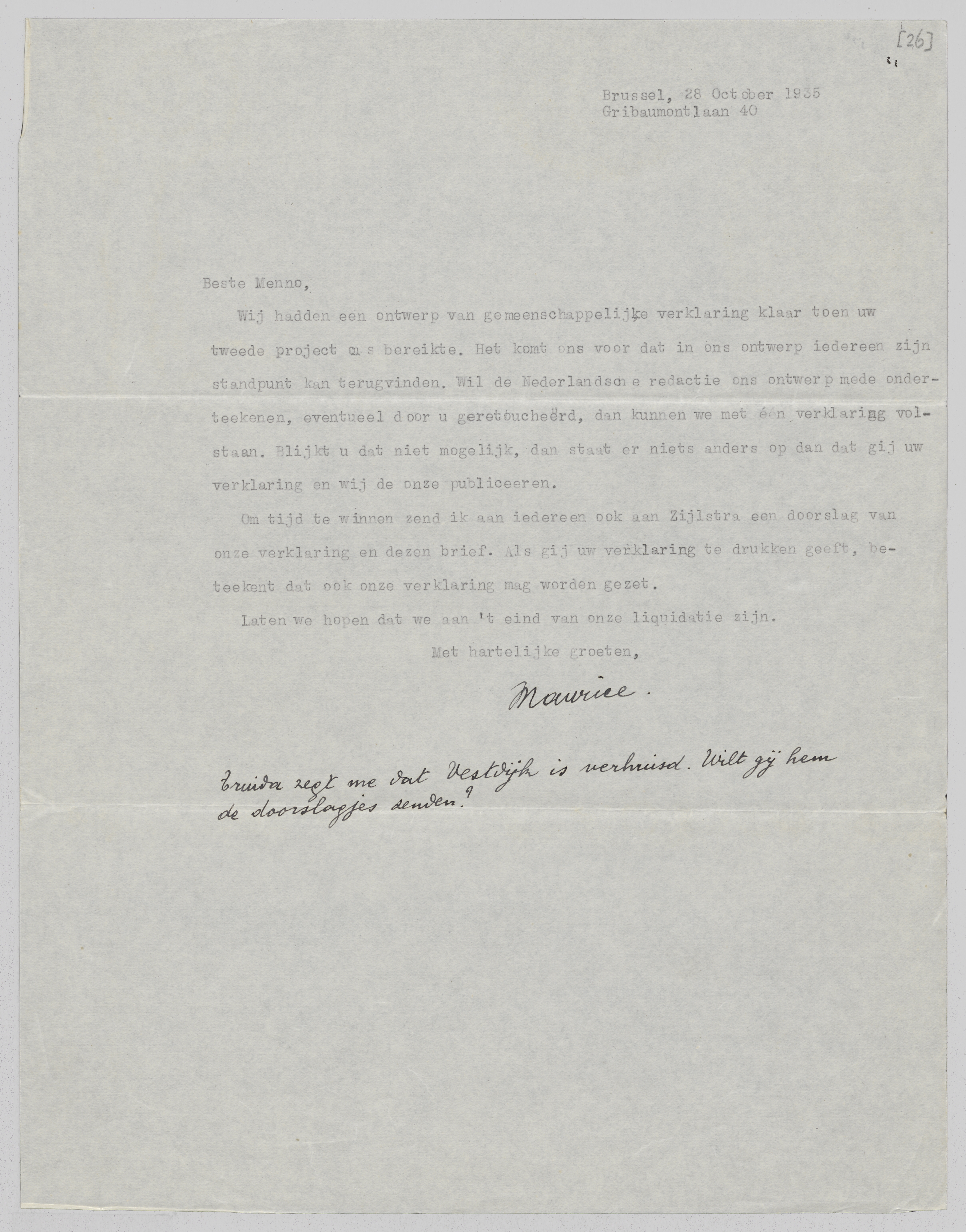 Om tijd te winnen zend ik aan iedereen ook aan Zijlstra een doorslag van onze verklaring en dezen brief. Als gij uw verklaring te drukken geeft, beteekent dat ook onze verklaring mag worden gezet.