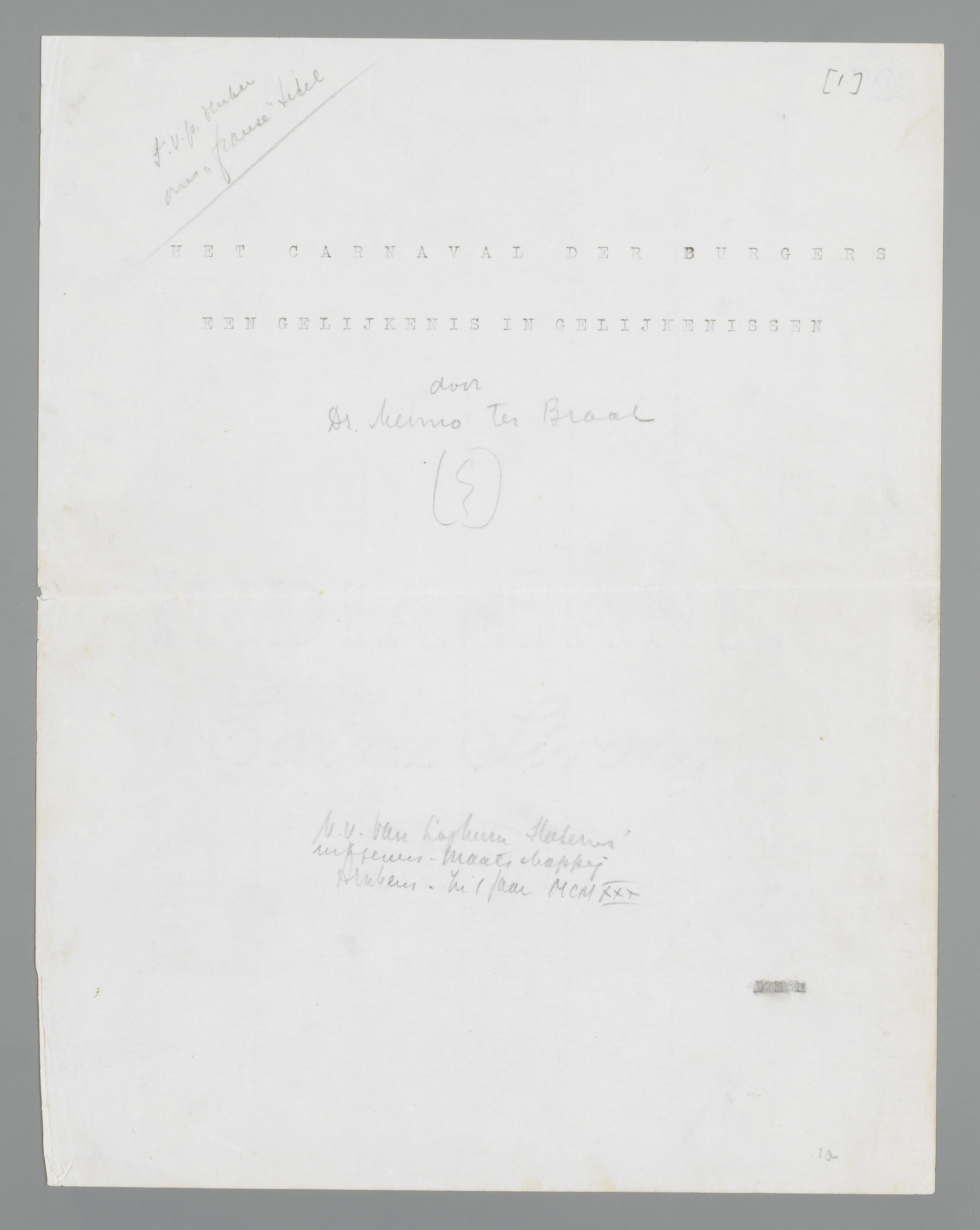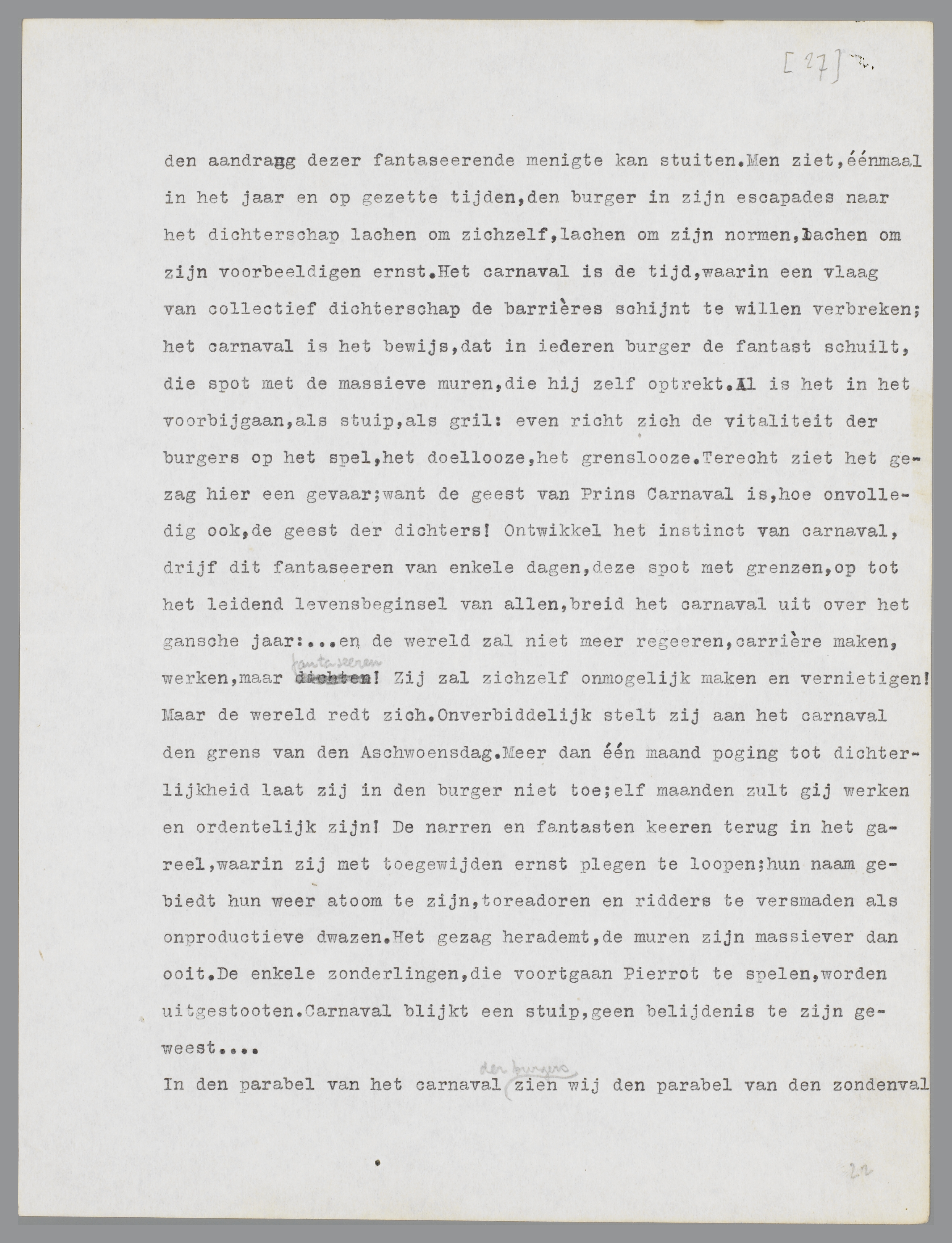 In den parabel van het carnaval der burgers zien wij den parabel van den zondenval vernieuwd. Het nieuwe beeld is niet beter, maar het is jeugdiger; het is niet bezwaard met een gansche traditie van commentaren, die aan den simpelen woordklank reeds een geur van volstrekte eerbiedwaardigheid verleenen. Om over den zondenval te spreken, moet men zich, om ernstig te kunnen zijn, terugtrekken in een atmosfeer van historie, die den waren ernst niet ter stade komt; de gelijkenis van den zondenval is dubbelzinnig van klank, omdat zij ook leerstelling is en zich met dien leerstelligen mantel van burgerlijken ernst als gemeenplaats heeft voortgeplant. Hij, die het beeld vernieuwt, verbetert niet, maar wijst slechts met nadruk aan, dat niet de beteekenis der woorden belangrijk is, maar hun gelijkeniswaarde; niet om de beel-
