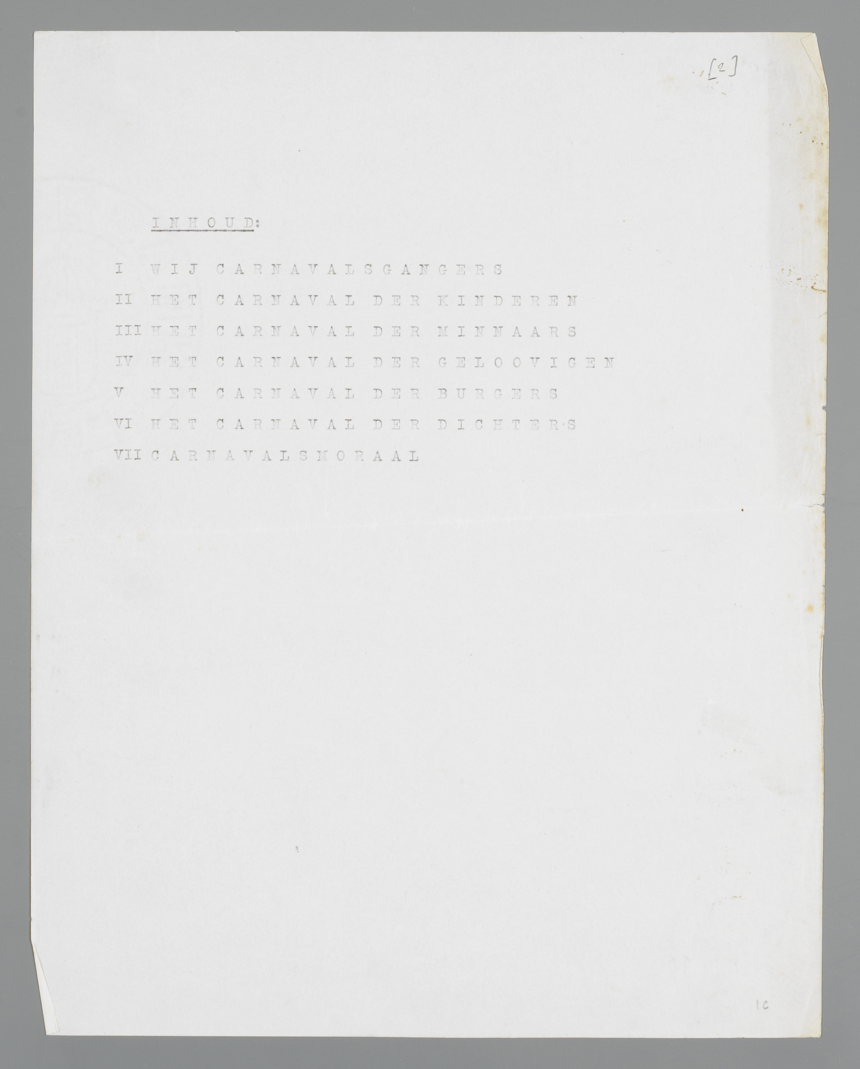 ‘Den lof der zotheid, den lof van carnaval zingt hij, die in de zotheid der burgers en op het carnaval der burgers den dichter heeft ontdekt. Want de zotheid en het carnaval werpen de starre gemeenplaatsen zorgeloos om, terwijl zij onmiddellijk nieuwe gemeenplaatsen van noode hebben; zij spreken de gelijkenis van de betrekkelijkheid, maar tevens van de noodzakelijkheid der burgerlijke vormen. Dààrom is de geest van carnaval de geest der dichters, zooals hij slechts nadert in het gewaad der burgers. Carnaval houdt ons voor, dat de veranderlijkheid der vormen onuitputtelijk is en dat het leven met de vormen speelt; carnaval houdt ons voor, dat de vormen onvermijdelijk zijn en dat het leven niet dan in vormen tot ons komt. Carnaval is het verloren paradijs, waarvan de herinnering in ons leeft, zonder dat wij het kunnen herwinnen; onophoudelijk onze vormen verwerpend, nooit van de beperktheid der vormen verlost, moeten de burgers om-