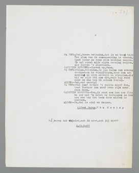 PA UBU: - Welnu, vrienden, ik zou raden den koning doodgewoon te vergiftigen, door hem arsenicum in zijn ontbijt te strooien. Als hij er zijn bek aan zet, valt hij dood neer en dan ben ik meteen koning.