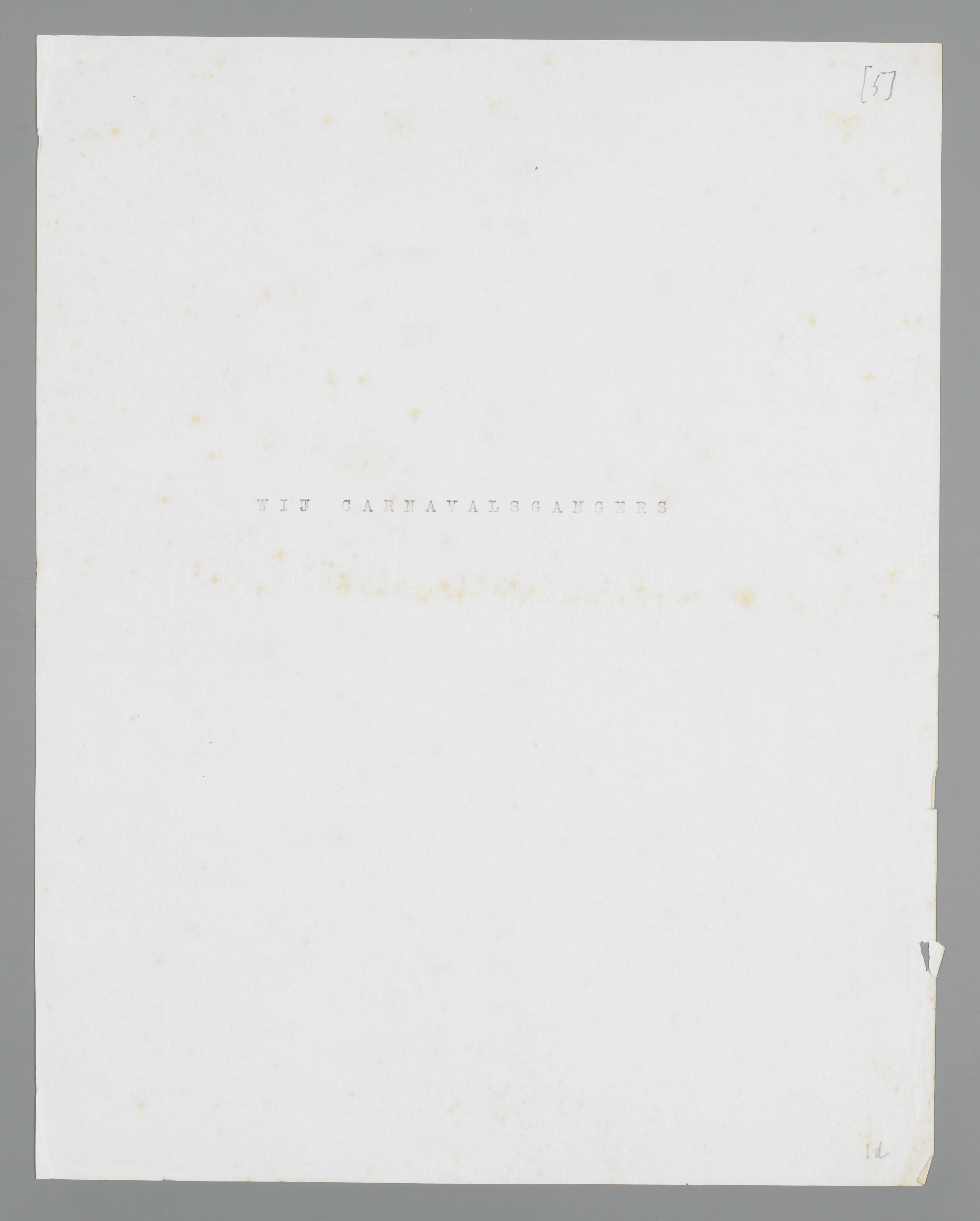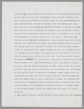 ‘Wij’... Thans is zelfs de kleinste burger dichter, ook al dicht hij geen gemeenplaatsen weg. Hoor hem zeggen: ‘Ik heb je lief’, zie hem bloemen op de bajonet steken, en vergeet de in groote oplagen gedrukte romans, waaraan hij deze formules ontleende. Vergeet den burger, vergeet den dichter en hervind beide op het carnaval!