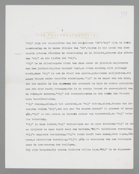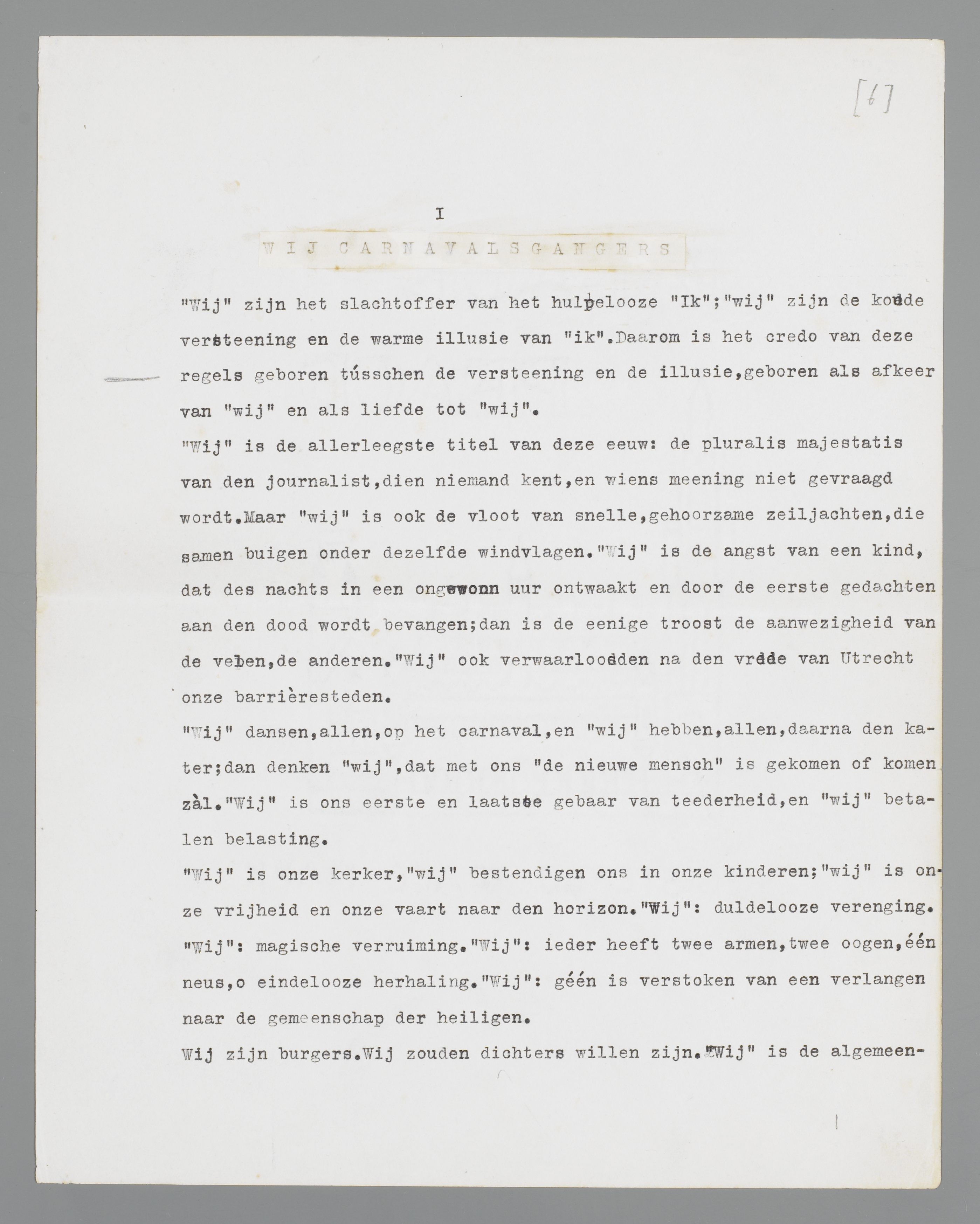‘Wij’ is de allerleegste titel van deze eeuw: de pluralis majestatis van den journalist, dien niemand kent, en wiens meening niet gevraagd wordt. Maar ‘wij’ is ook de vloot van snelle, gehoorzame zeiljachten, die samen buigen onder dezelfde windvlagen. ‘Wij’ is de angst van een kind, dat des nachts in een ongewoon uur ontwaakt en door de eerste gedachte aan den dood wordt bevangen; dan is de eenige troost de aanwezigheid van de velen, de anderen. ‘Wij’ ook verwaarloosden na den vrede van Utrecht onze barrièresteden.
