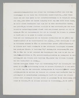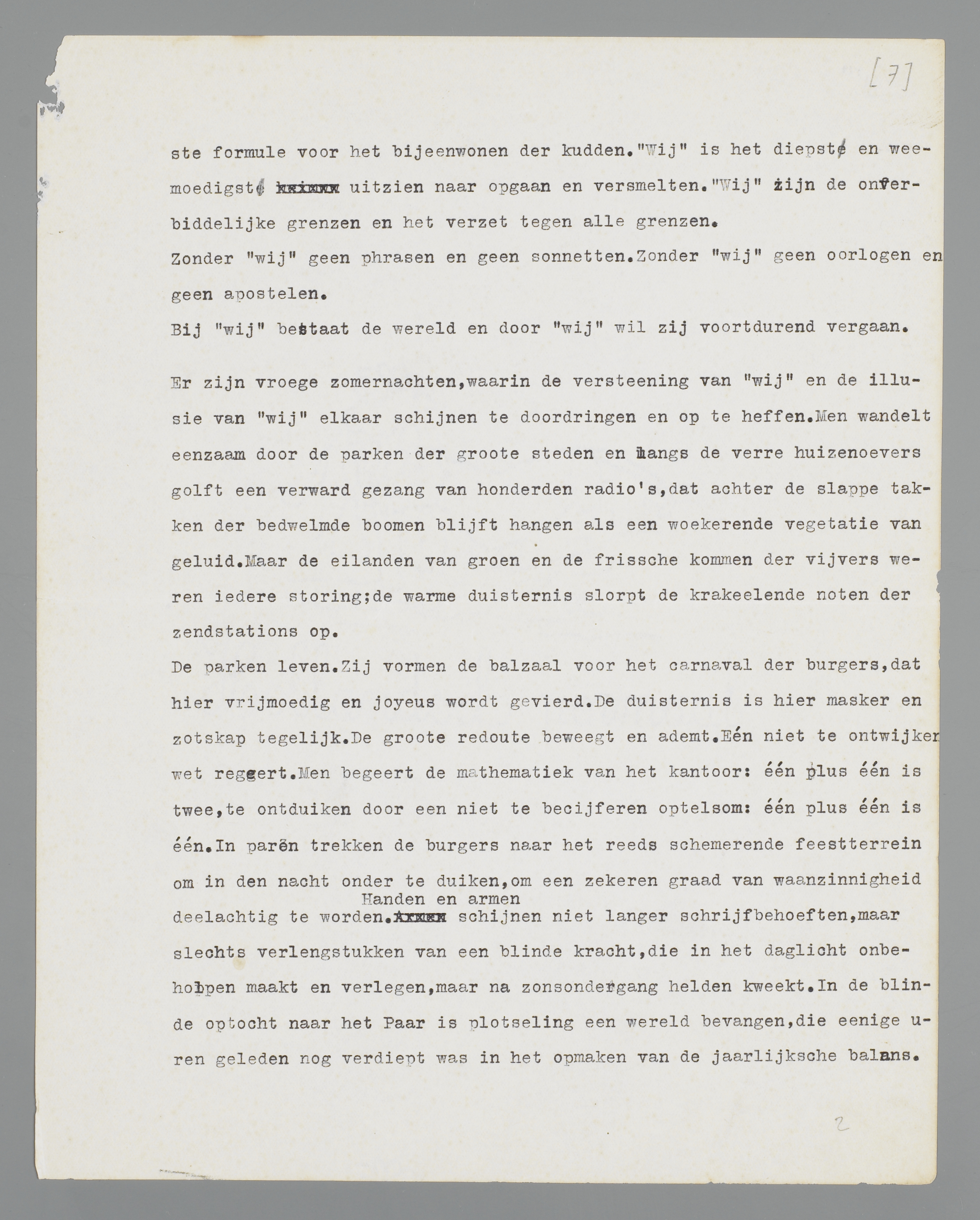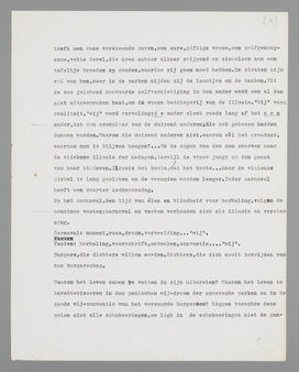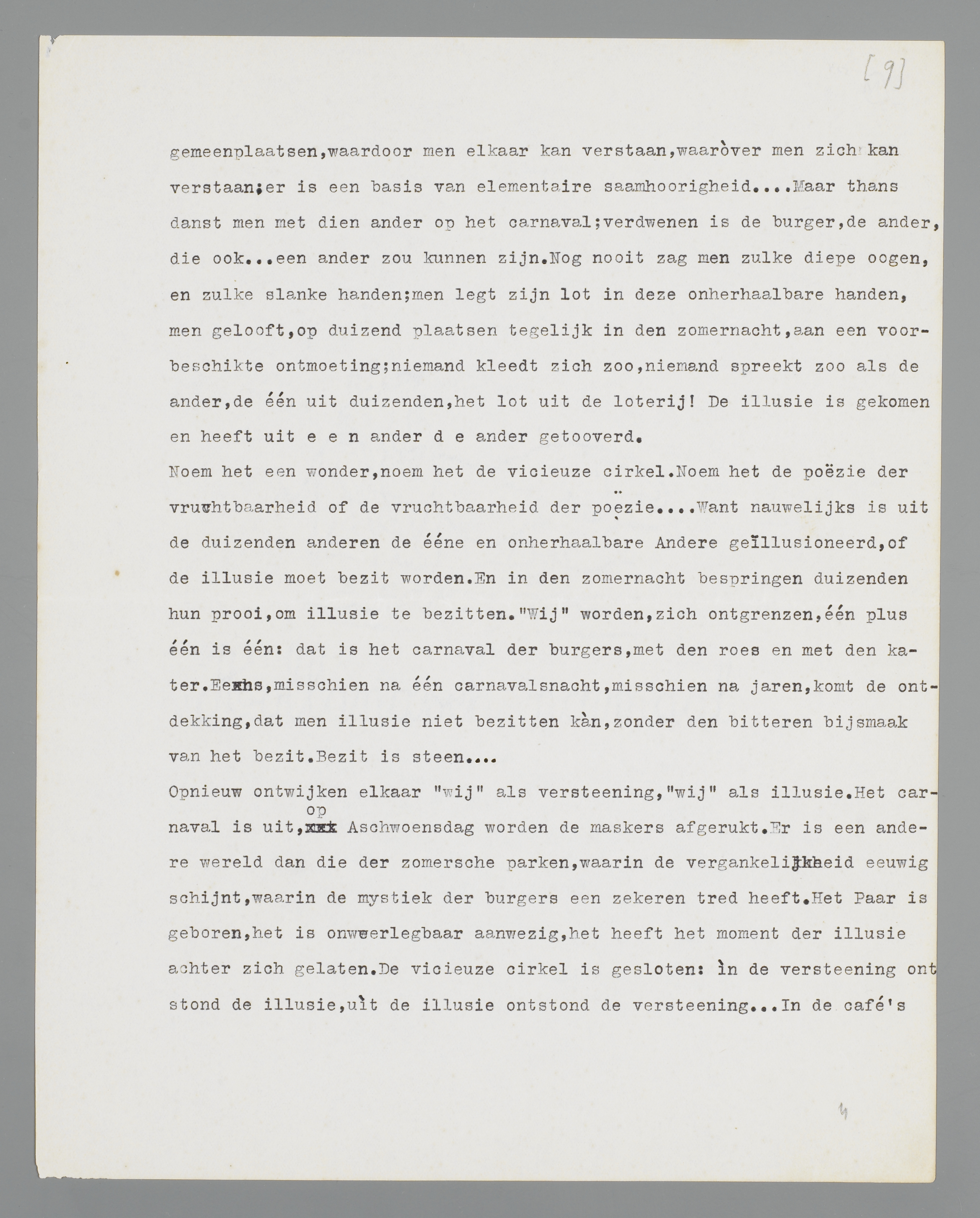 Opnieuw ontwijken elkaar ‘wij’ als versteening, ‘wij’ als illusie. Het carnaval is uit, op Aschwoensdag worden de maskers afgerukt. Er is een andere wereld dan die der zomersche parken, waarin de vergankelijkheid eeuwig schijnt, waarin de mystiek der burgers een zekeren tred heeft. Het Paar is geboren, het is onweerlegbaar aanwezig, het heeft het moment der illusie achter zich gelaten. De vicieuze cirkel is gesloten: in de versteening ontstond de illusie, uìt de illusie ontstond de versteening... In de café's treft men deze versteende paren, een zure, giftige vrouw, een zelfgenoegzame, vette kerel, die uren achter elkaar zwijgend en zinneloos aan een tafeltje broeden op zonden, waartoe zij geen moed hebben. De straten zijn vol van hen, maar in de parken mijden zij de laantjes en de banken. Uit de zoo juichend aanvaarde zelfvernietiging in den ander werd een al dan niet uitgesproken haat, om de vooze bedriegerij van de illusie. ‘Wij’ werd realiteit, ‘wij’ werd verveling; de ander sleet reeds lang af tot een ander, tot een exemplaar van de duizend anderen, die ook gekozen hadden kunnen worden. Waarom die duizend anderen niet,