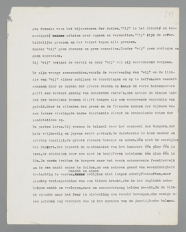 Wie de term ‘wij’ critiekloos gebruikt, vervalscht, bewust of onbewust, de wereld. Door ‘wij’ (wij Hollanders zijn trotsch op de organisatie der Olympische Spelen) giet men aan zeven millioen individuen, idioten, baby's, effectenmakelaars en prostituée's, een trots in, die bij enkelen ijdelheid, bij velen semi-sexueele geestdrift, bij de meesten volkomen onverschilligheid beteekent. Even trotsch zijn ‘wij’, als het zoo uitkomt, op ‘onzen’ grooten Lorentz.