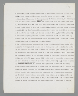 ‘Wij’ zijn het slachtoffer van het hulpelooze ‘Ik’; ‘wij’ zijn de koude versteening en de warme illusie van ‘ik’. Daarom is het credo van deze regels geboren tùsschen de versteening en de illusie, geboren als afkeer van ‘wij’ en als liefde tot ‘wij’.