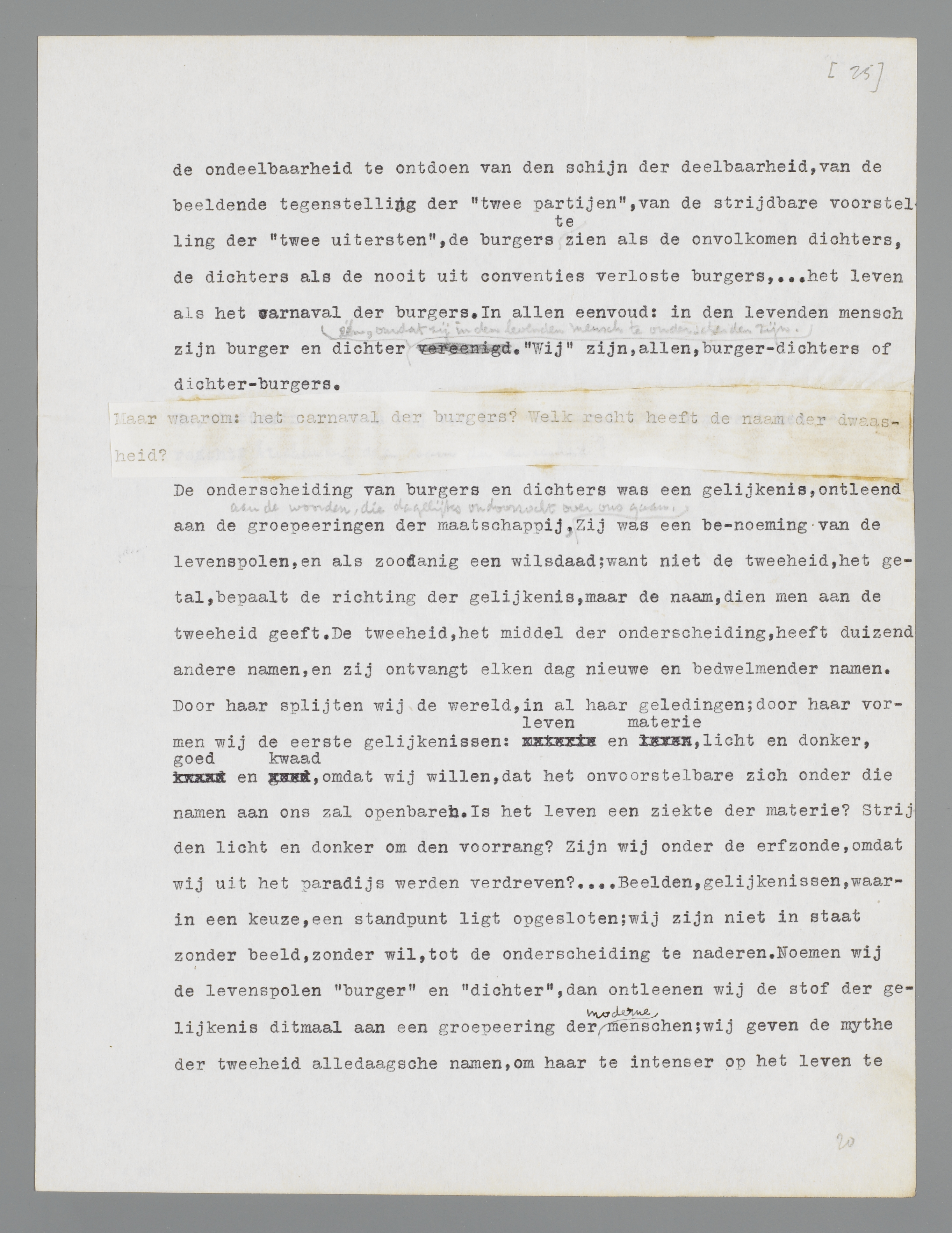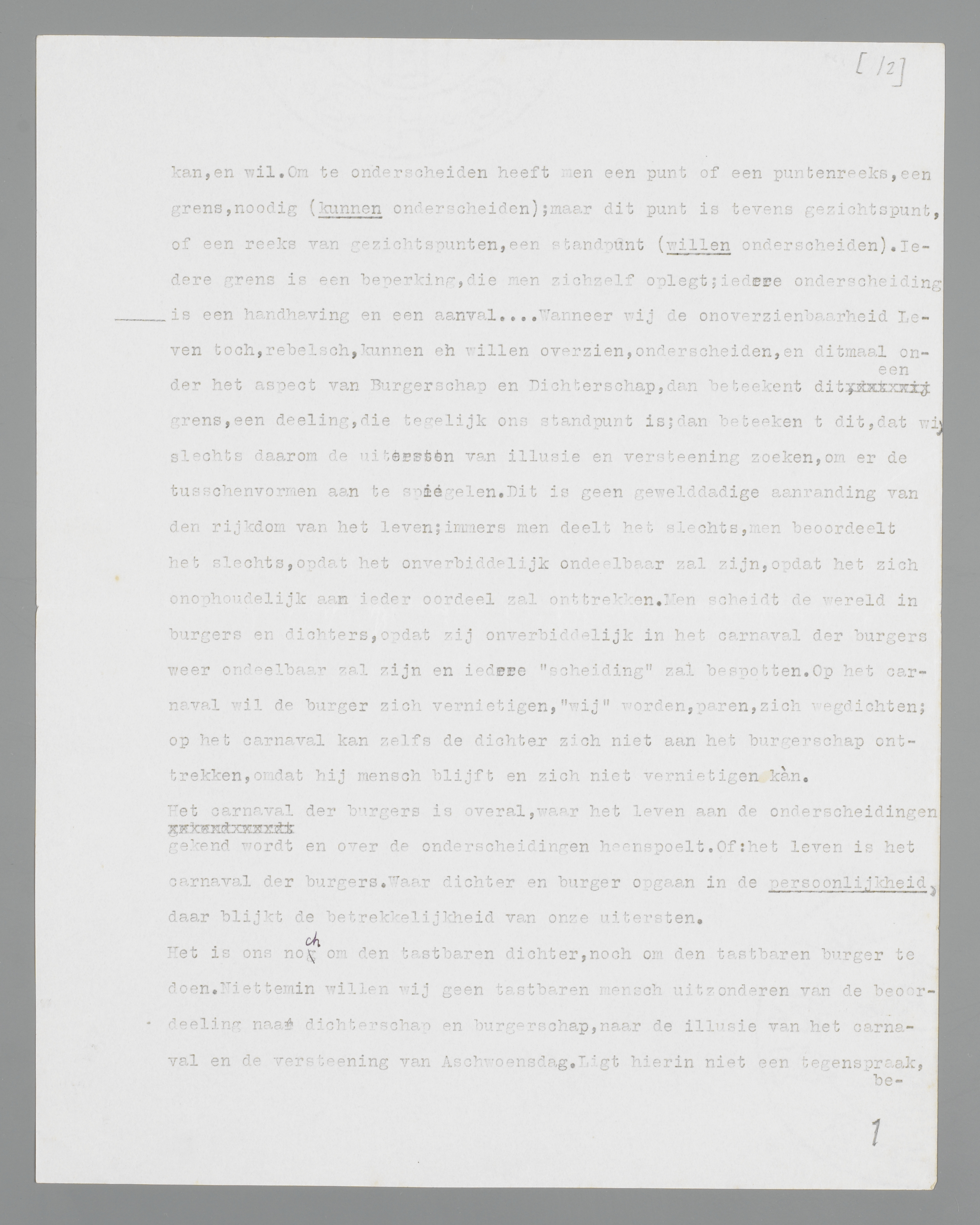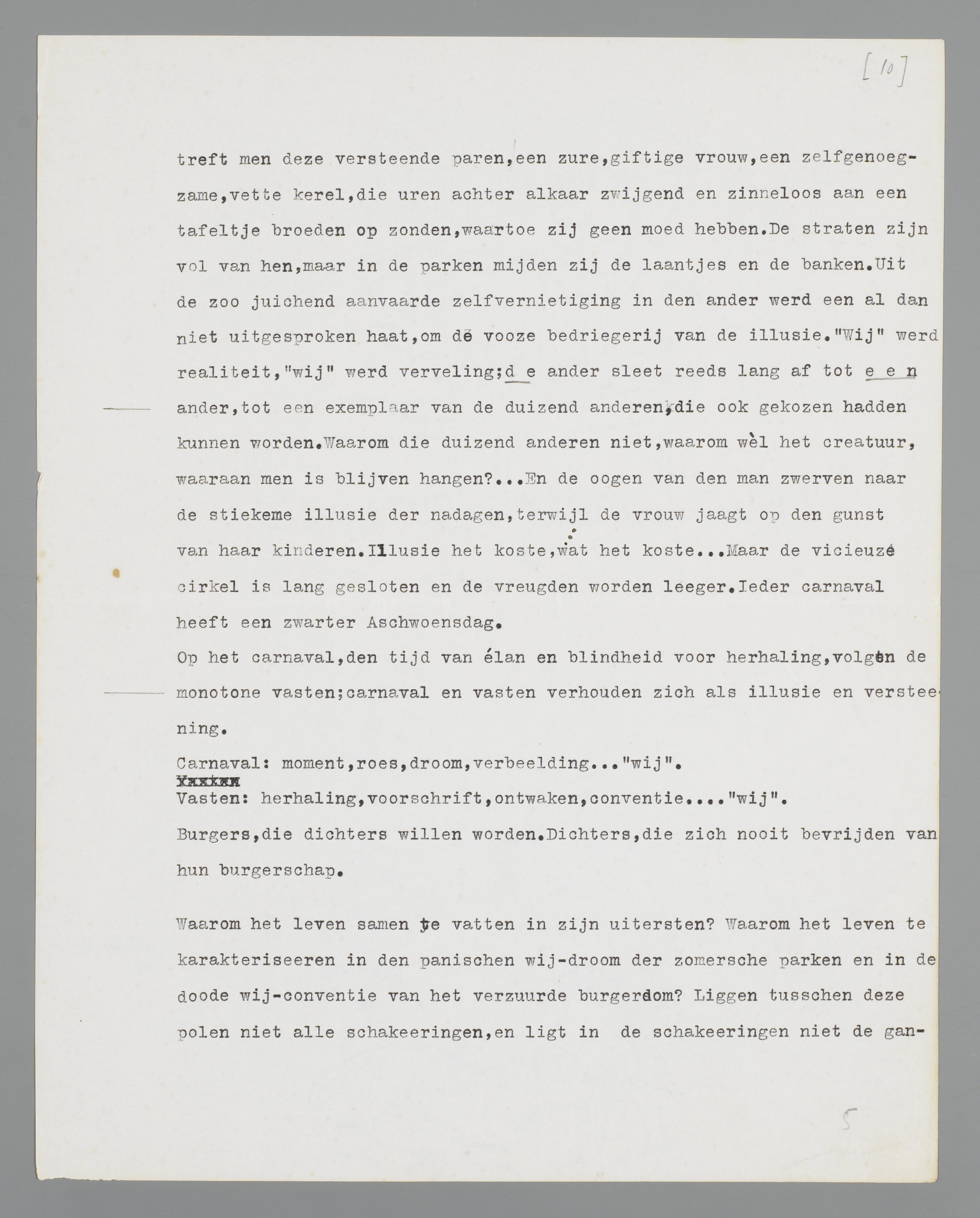 Deze voorkeur schept ook de namen ‘dichterschap’ en ‘burgerschap’, als denkbeeldige uitersten van wij-droom en wij-conventie. Uit deze voorkeur ontstaat de groteske benaming ‘carnaval der burgers’. Woorden, die rijk zijn aan associaties, dat is rijk aan elementen van liefde en haat; woorden, die ‘misleidend’ zijn, zoodra men denkt aan beroepsdichters en beroepsburgers; woorden, die zich niet beroemen op den schijn van voorkeurloosheid, de zuivere abstractie; woorden, die aanduiden, dat het leven ook als carnaval, zijn ‘polariteit’ ook als dichter-burgerschap kan en wil worden gezien, geoordeeld.