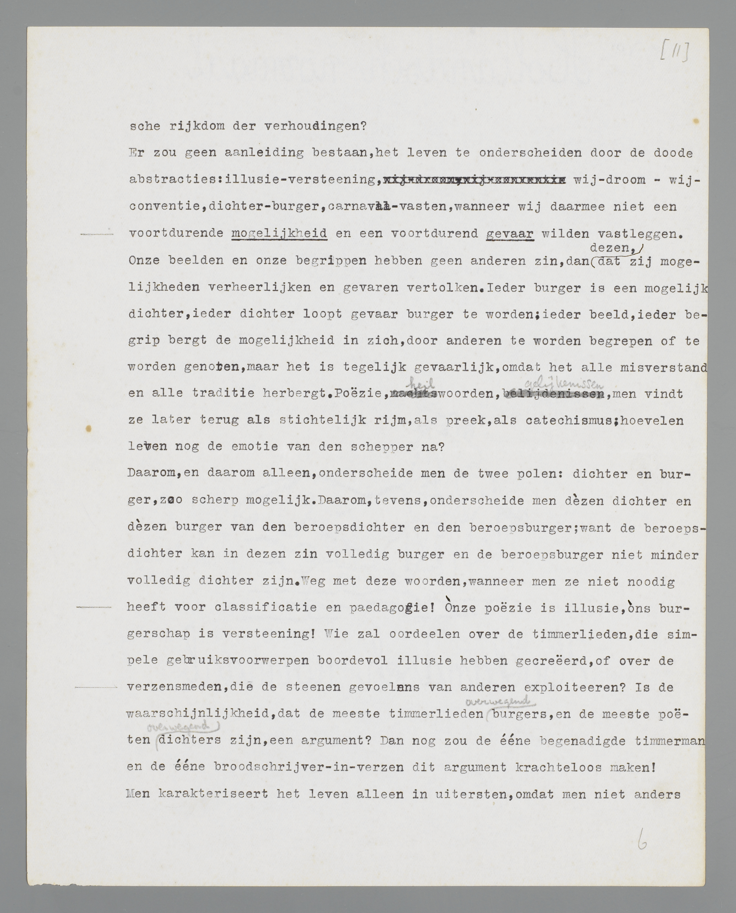 Daarom, en daarom alleen, onderscheide men de twee polen: dichter en burger, zoo scherp mogelijk. Daarom, tevens, onderscheide men dèzen dichter en dèzen burger van den beroepsdichter en den beroepsburger; want de beroepsdichter kan in dezen zin volledig burger en de beroepsburger niet minder volledig dichterzijn. Weg met deze woorden, wanneer men ze niet noodig heeft voor classificatie en paedagogie! Onze poëzie is illusie, òns burgerschap is versteening! Wie zal oordeelen over de timmerlieden, die simpele gebruiksvoorwerpen boordevol illusie hebben gecreëerd, of over de verzensmeden, die de steenen gevoelens van ande-