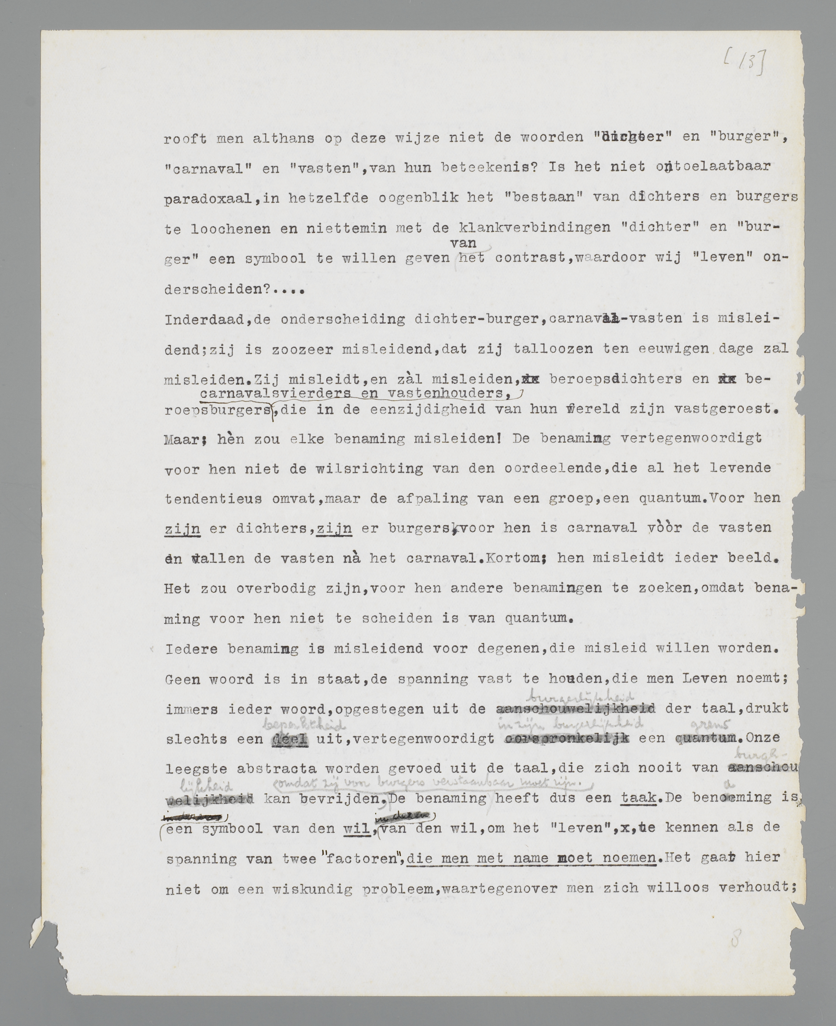 Het is ons noch om den tastbaren dichter, noch om den tastbaren burger te doen. Niettemin willen wij geen tastbaren mensch uitzonderen van de beoordeeling naar dichterschap en burgerschap, naar de illusie van het carnaval en de versteening van Aschwoensdag. Ligt hierin niet een tegenspraak, berooft men althans op deze wijze niet de woorden ‘dichter’ en ‘burger’, ‘carnaval’ en ‘vasten’, van hun beteekenis? Is het niet ontoelaatbaar paradoxaal, in hetzelfde oogenblik het ‘bestaan’ van dichters en burgers te loochenen en niettemin met de klankverbindingen ‘dichter’ en ‘burger’ een symbool te willen geven van het contrast, waardoor wij ‘leven’ onderscheiden...?