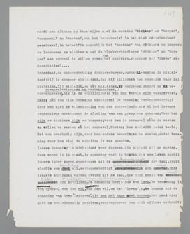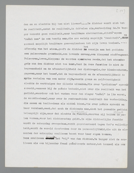 De gangbare beteekenismodulaties van het woord ‘dichter’ verraden in de eerste plaats, dat ook de burgers over den dichter spreken, hem als medeburger verlangen te behandelen,... zonder echter iets over hem te kunnen zeggen, dat zijn functie raakt! Men wil den dichter als medeatoom; men wil den dichter als langharige, als den op-rijm-schrijver, als den onsterfelijke, als den onnuttige, want in haren, rijm, klassiciteit en maatschappelijke débâcle kan men duizend dichters vangen, kan men de weerbarstigen organiseeren, fatsoeneeren, ‘atomiseeren’; en deze suggestie is zelfs zoo sterk, dat vele dichters onder den drang der burgers hun dichterschap voor het beroepsdichterschap