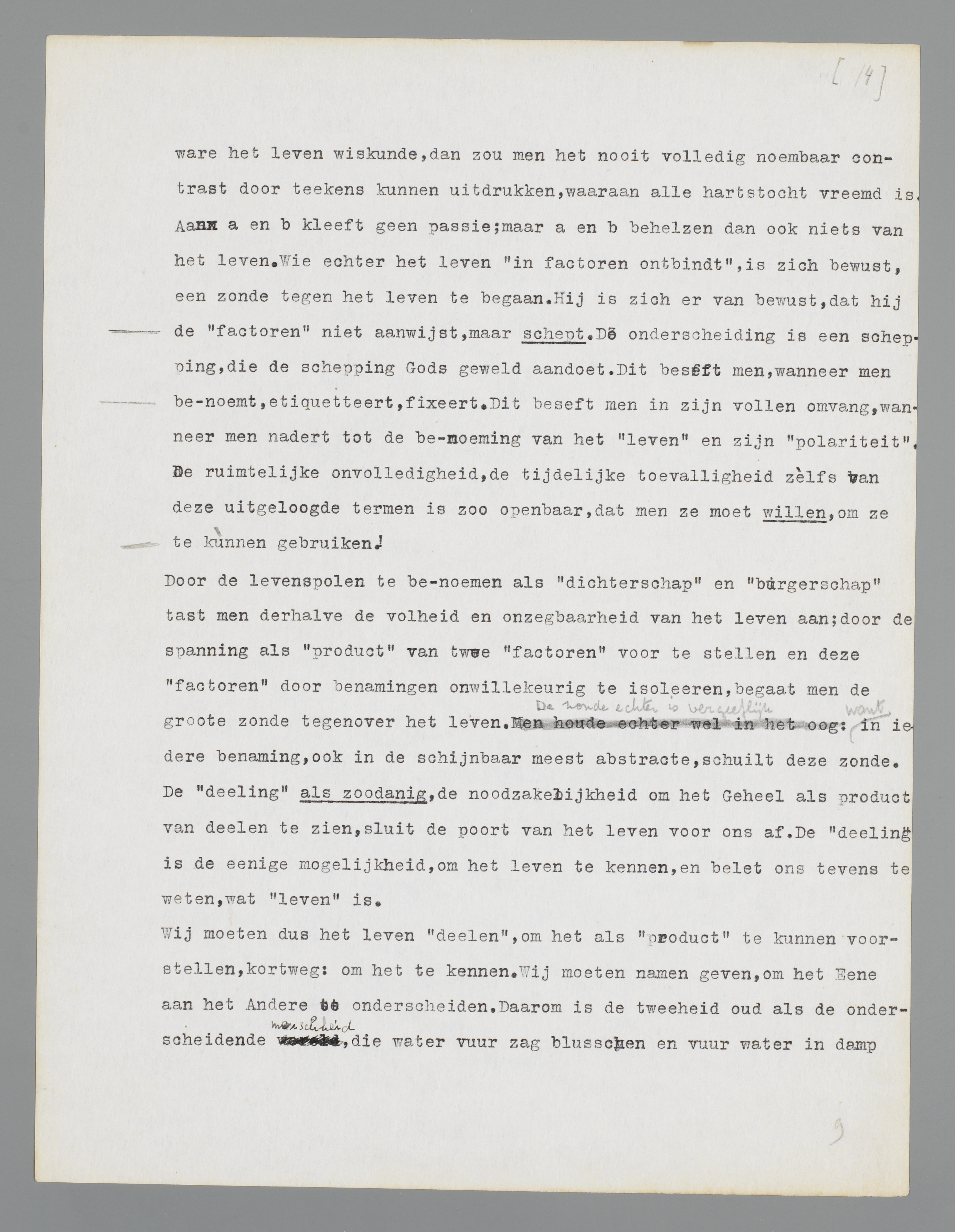Door de levenspolen te be-noemen als ‘dichterschap’ en ‘burgerschap’ tast men derhalve de volheid en onzegbaarheid van het leven aan; door de spanning als ‘product’ van twee ‘factoren’ voor te stellen en deze ‘factoren’ door benamingen onwillekeurig te isoleeren, begaat men de groote zonde tegenover het leven. De zonde echter is vergeeflijk: want iedere benaming, ook de schijnbaar meest abstracte,