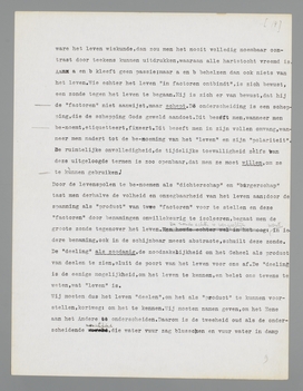 Wij moeten het leven ‘deelen’, om het als ‘product’ te kunnen voorstellen, kortweg: om het te kennen. Wij moeten namen geven, om het Eene aan het Andere te onderscheiden. Daarom is de tweeheid oud als de onderscheidende menschheid, die water vuur zag blusschen en vuur water in damp doen opgaan. Men laat ‘God’ de ‘wereld’ scheppen, men laat ook een ‘cel’ zich ‘deelen’. De tweeheid is noodzaak,... maar het noemen is wilszaak! Want men bezie nu den tegenkant: men kan zich geen verbitterder strijd denken, dan dien tusschen theologen en Darwinisten! Niet als in de wiskunde, is het noemen (a, x) hartstochtlooze functie; onze wil bepaalt, door het noemen, in welke richting onze ‘deeling’ zich beweegt. Het punt is tegelijk gezichtspunt, de grens is tegelijk standpunt. Het is (betrekkelijk) onbelangrijk, dat men overal het getal twee als grensbepaling terugvindt, want het leven is geen mathematica; maar het is hoogst belangrijk, dat men overal, door aan deze twee een naam te geven, een standpunt inneemt. Uit de noodzakelijkheid, het Eene aan het Andere te