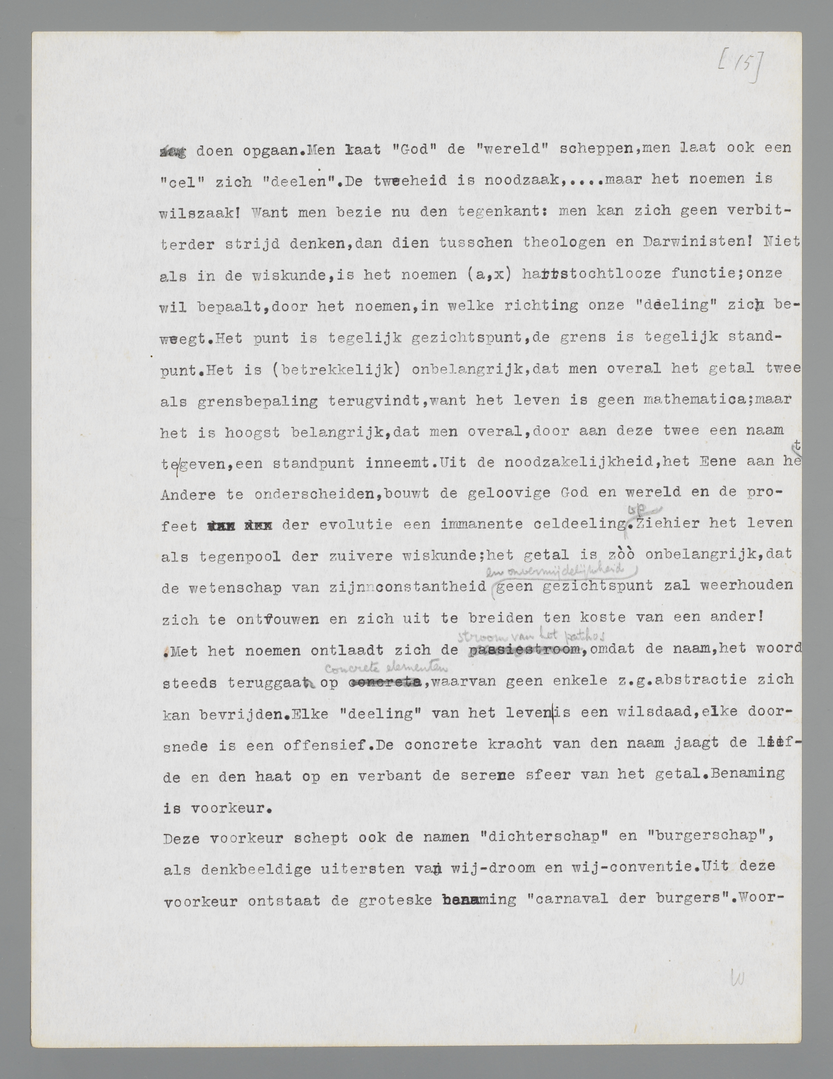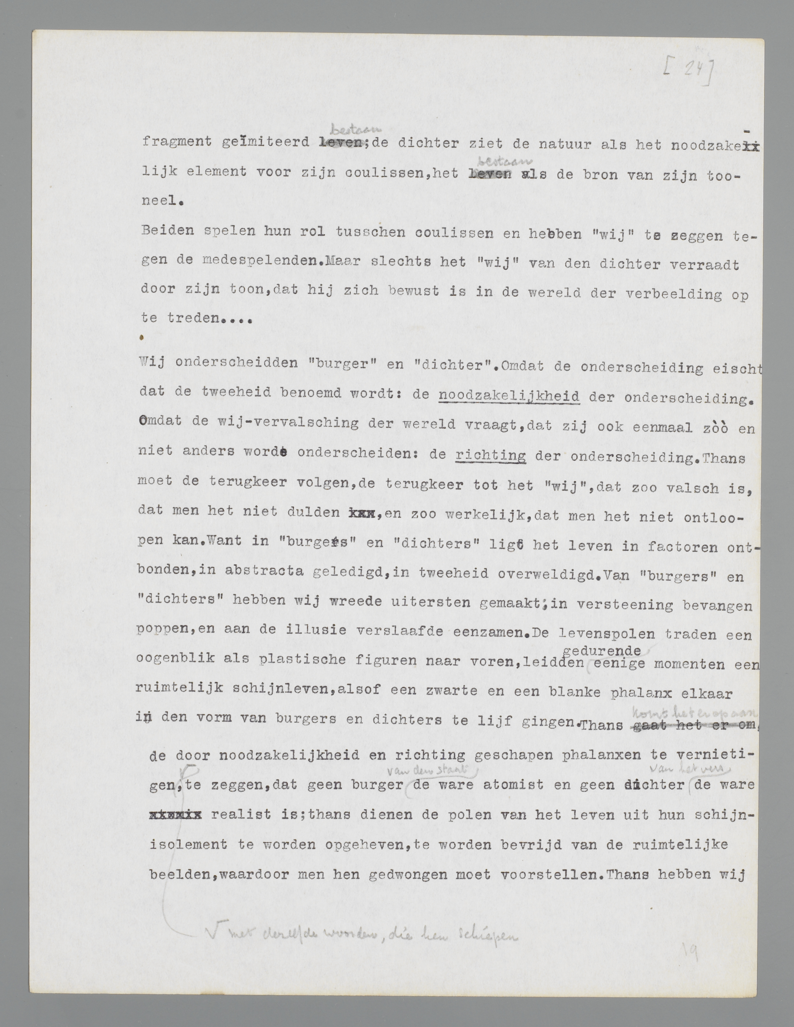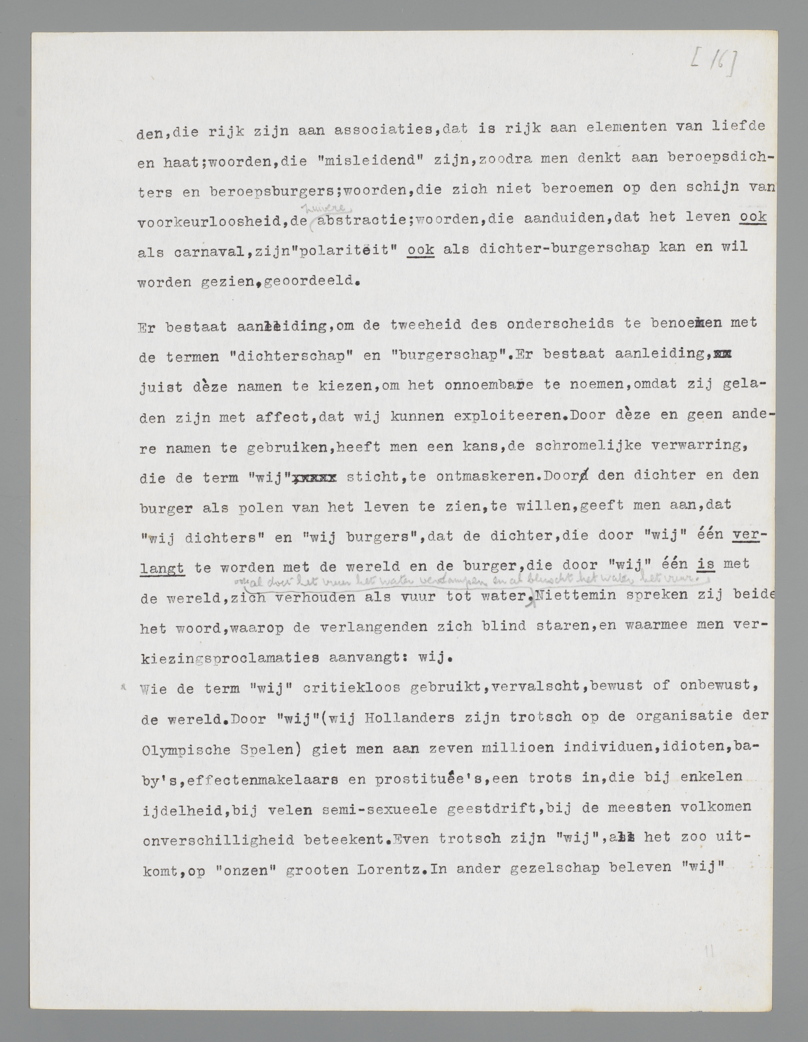 Er bestaat aanleiding, om de tweeheid des onderscheids te benoemen met de termen ‘dichterschap’ en ‘burgerschap’. Er bestaat aanleiding, juist dèze namen te kiezen, om het onnoembare te noemen, omdat zij geladen zijn met affect, dat wij kunnen exploiteeren. Door dèze en geen andere namen te gebruiken, heeft men een kans, de schromelijke verwarring, die de term ‘wij’ sticht, te ontmaskeren. Door den dichter en den burger als polen van het leven te zien, te willen, geeft men aan, dat ‘wij dichters’ en ‘wij burgers’, dat de dichter, die door ‘wij’ één verlangt te worden met de wereld en de burgers, die door ‘wij’ één is met de wereld, zich verhouden als vuur tot water, ook al doet het vuur het water verdampen en al bluscht het water het vuur. Niettemin spreken zij beide hetzelfde woord, waarop de verlangenden zich blind staren, doch waarmee men evenzeer verkiezingsproclamaties aanvangt: wij.