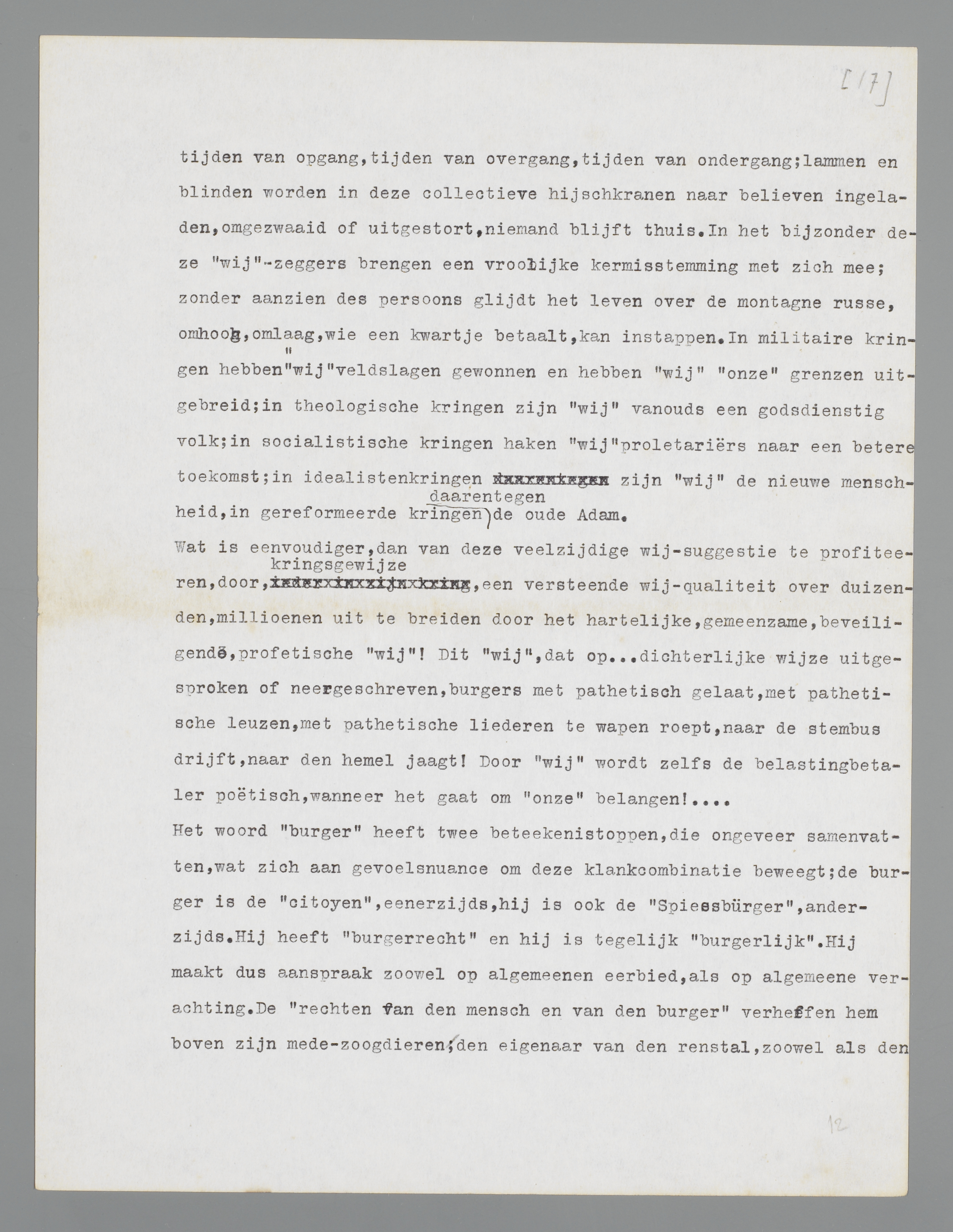Wat is eenvoudiger, dan van deze veelzijdige wij-suggestie te profiteeren, door, kringsgewijze, een versteende wij-qualiteit over duizenden, millioenen uit te breiden door het hartelijke, gemeenzame, beveiligende, profetische ‘wij’! Dit ‘wij’, dat op... dichterlijke wijze uitgesproken of neergeschreven, burgers met pathetisch gelaat, met pathetische leuzen, met pathetische liederen te wapen roept, naar de stembus drijft, naar den hemel jaagt! Door ‘wij’ wordt zelfs de belastingbetaler poëtisch, wanneer het gaat om ‘onze’ belangen...!