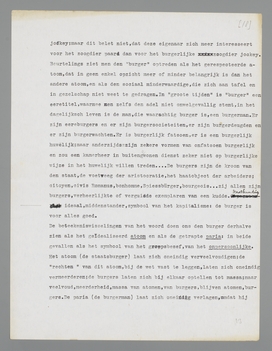 De beteekeniswisselingen van het woord doen ons den burger derhalve zien als het geïdealiseerd atoom en als de getrapte paria: in beide gevallen als het symbool van het groepsbesef, van het onpersoonlijke. Het atoom (de staatsburger) laat zich oneindig verveelvoudigen; de ‘rechten’ van dit atoom, bij de wet vast te leggen, laten zich oneindig vermeerderen; de burgers laten zich bij elkaar optellen tot massa; maar veelvoud, meerderheid, massa van atomen, van burgers, blijven atomen, burgers. De paria (de burgerman) laat zich oneindig verlagen, omdat hij slechts de lagere graad vertegenwoordigt; de adel noemt den stadspatriciër burgerlijk, de patriciër noemt de gegoede ‘burgerij’ burgerlijk, de burgerij noemt den kruidenier burgerlijk... ad infinitum; maar al deze soorten burgerlieden verachten elkaar om klassekenmerken; zij handhaven door hun verachting hun klasse en pas in hun klasse zichzelf. Het samenzijn der burgeratomen is even weinig een verschijnsel van per-