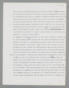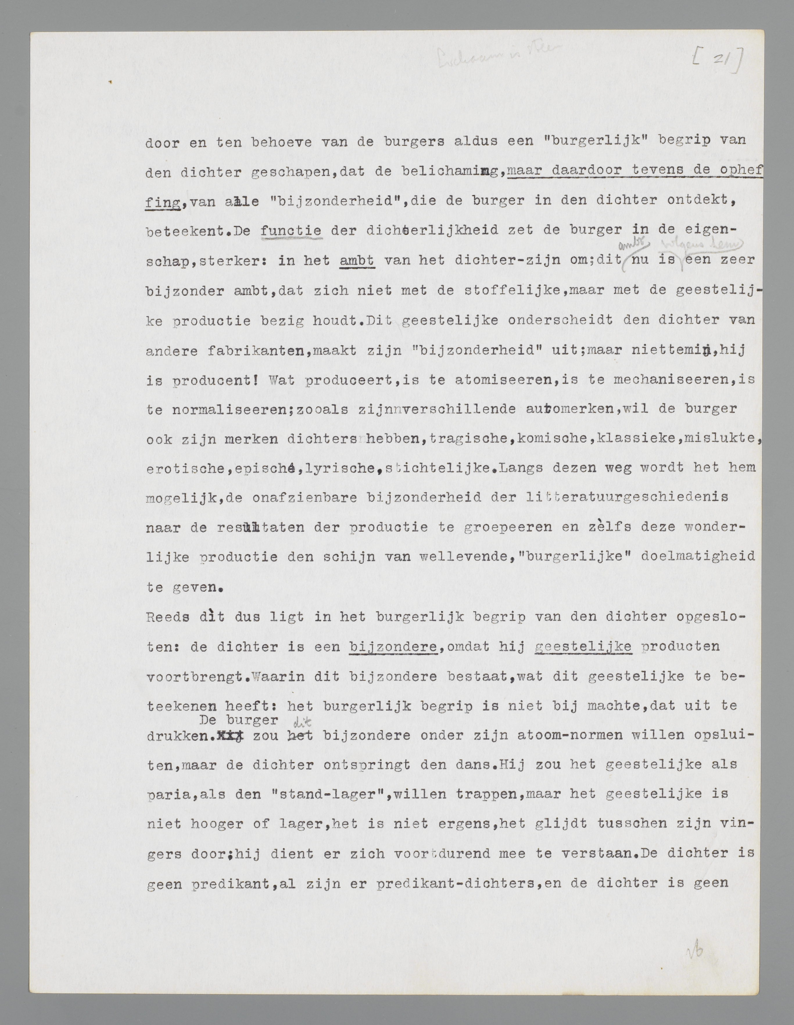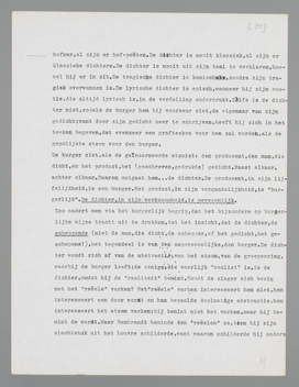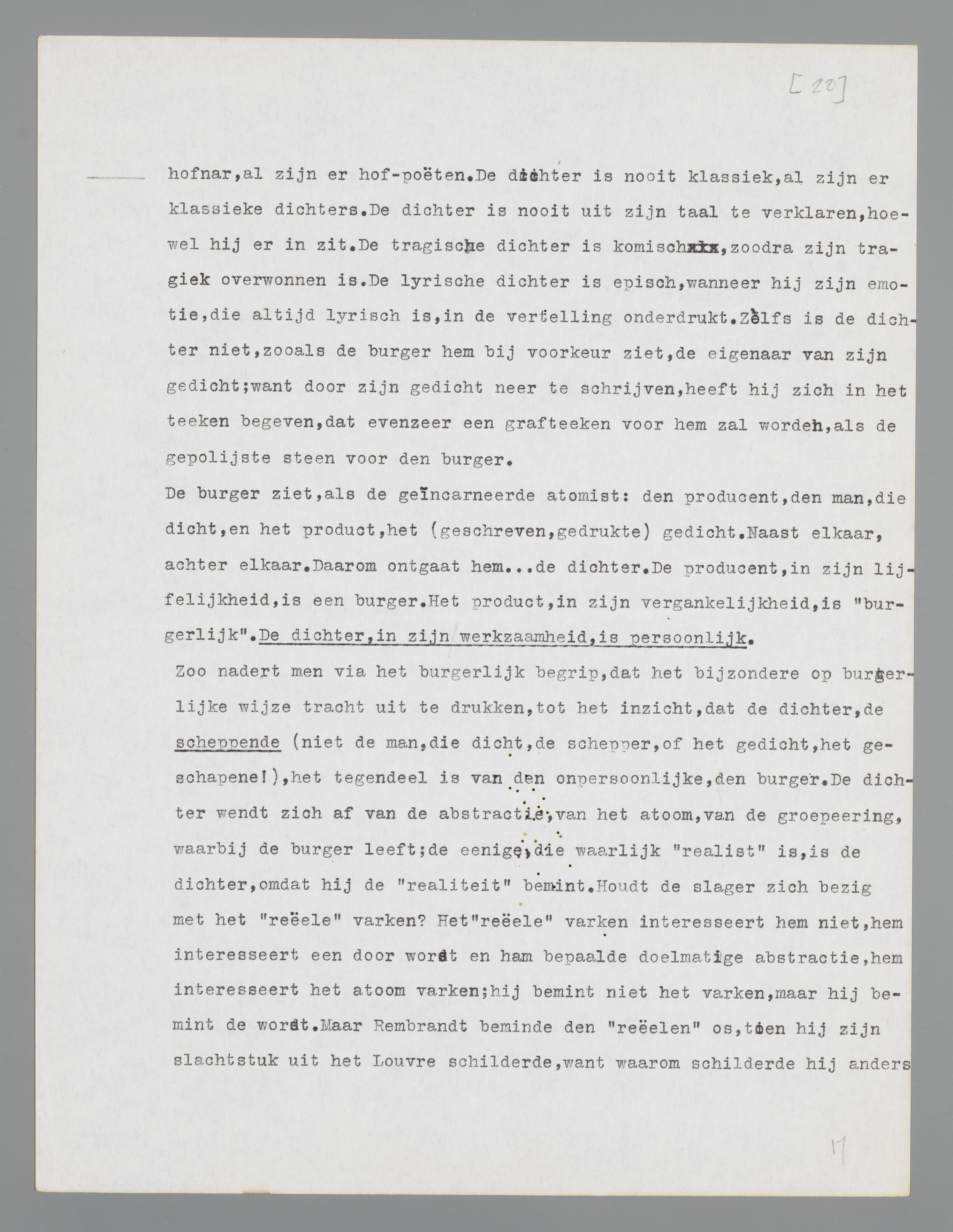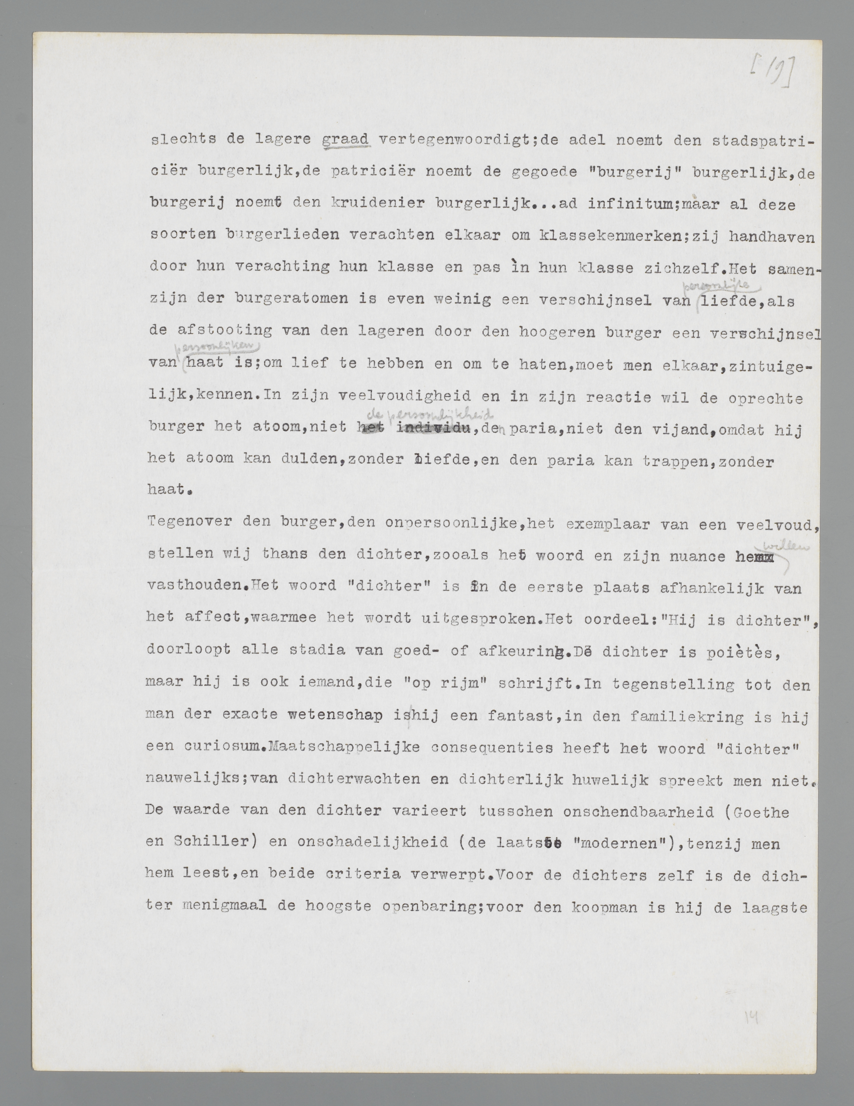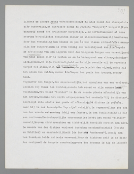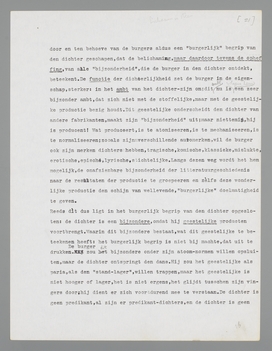 De burger ziet, als de geïncarneerde atomist: den producent, den man, die dicht, en het product, het (geschreven, gedrukte) gedicht. Naast elkaar, achter elkaar. Daarom ontgaat hem... de dichter. De producent, in zijn lijfelijkheid, is een burger. Het product, in zijn vergankelijkheid, is ‘burgerlijk’. De dichter, in zijn werkzaamheid, is persoonlijk.