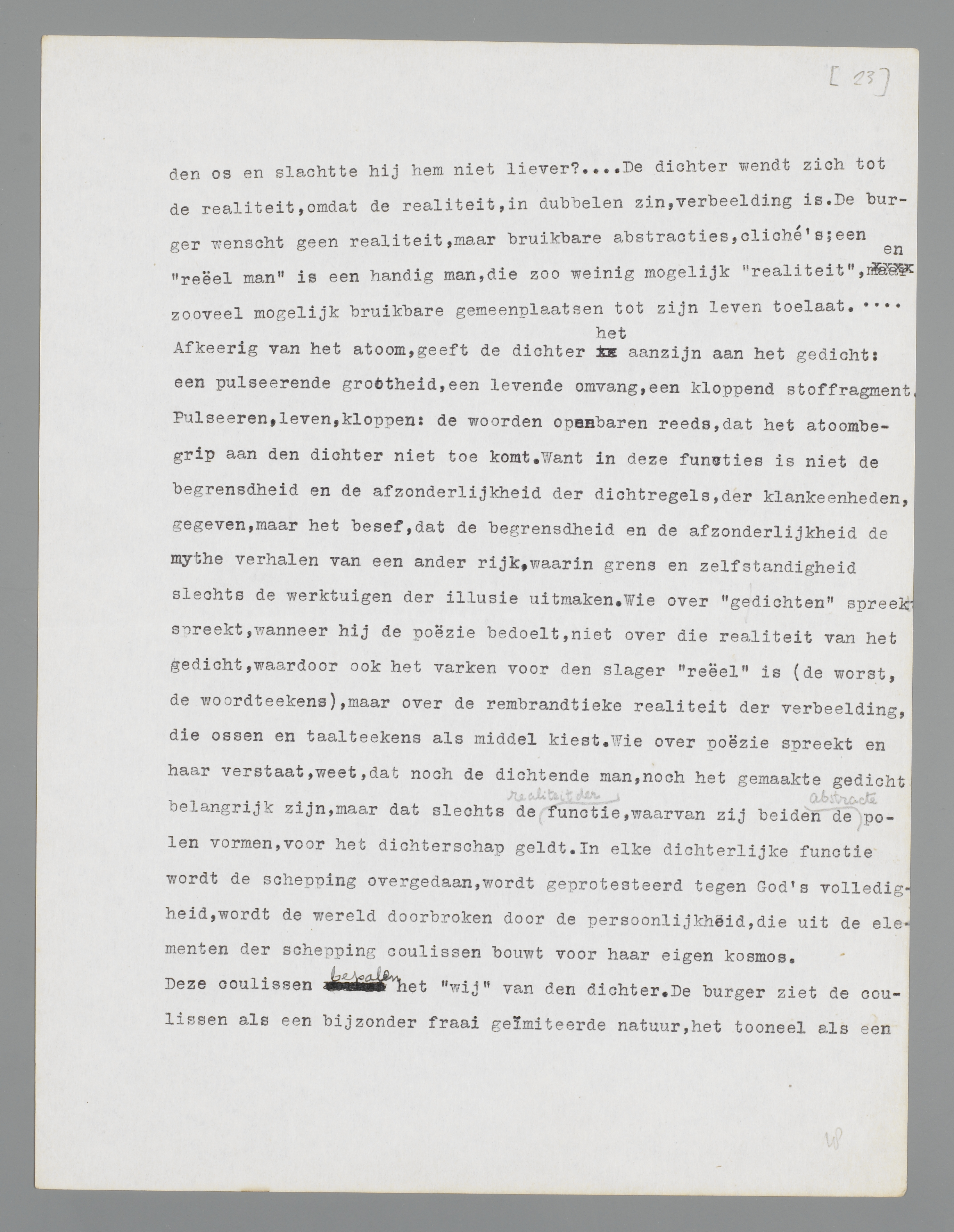 Afkeerig van het atoom, geeft de dichter het aanzijn aan het gedicht: een pulseerende grootheid, een levende omvang, een kloppend stoffragment. Pulseeren, leven, kloppen: de woorden openbaren reeds, dat het atoombegrip aan den dichter niet toe komt. Want in deze functies is niet de begrensdheid en de afzonderlijkheid der dichtregels, der klankeenheden, gegeven, maar het besef, dat de begrensdheid en de afzonderlijkheid de mythe verhalen van een ander rijk, waarin grens en zelfstandigheid slechts de werktuigen der illusie uitmaken. Wie over ‘gedichten’ spreekt, spreekt, wanneer hij de poëzie bedoelt, niet over die realiteit van het gedicht, waardoor ook het varken voor den slager ‘reëel’ is (de worst, de woordteekens), maar over de rembrandtieke realiteit der verbeelding, die ossen en taalteekens als middel kiest. Wie over poëzie spreekt en haar verstaat, weet, dat noch de dichtende man, noch het gemaakte gedicht belangrijk zijn, maar dat slechts de realiteit der functie, waarvan zij beiden de abstracte polen vormen, voor het dichterschap geldt. In elke dichterlijke functie wordt de