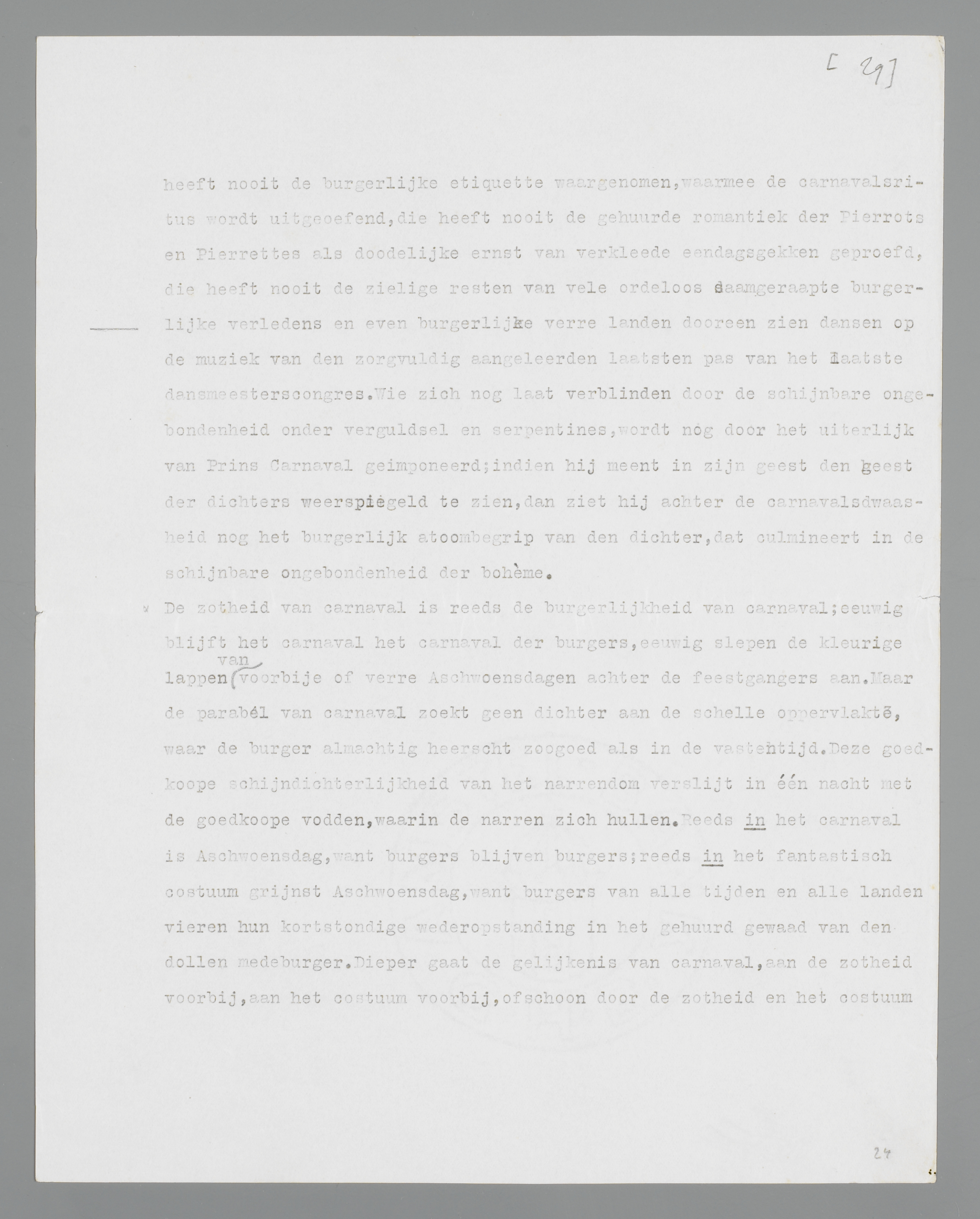 Inderdaad, om de dwaasheid is het in de gelijkenis niet te doen. Wie de carnavalszotternij als de openbaring van den dichter mocht beschouwen, die heeft nooit de burgerlijke etiquette waargenomen, waarmee de carnavalsritus wordt uitgeoefend, die heeft nooit de gehuurde romantiek der Pierrots en Pierrettes als doodelijke ernst van verkleede eendagsgekken geproefd, die heeft nooit de zielige resten van vele ordeloos saamgeraapte burgerlijke verledens en even burgerlijke verre landen dooreen zien dansen op de muziek van den zorgvuldig aangeleerden laatsten pas van het laatste