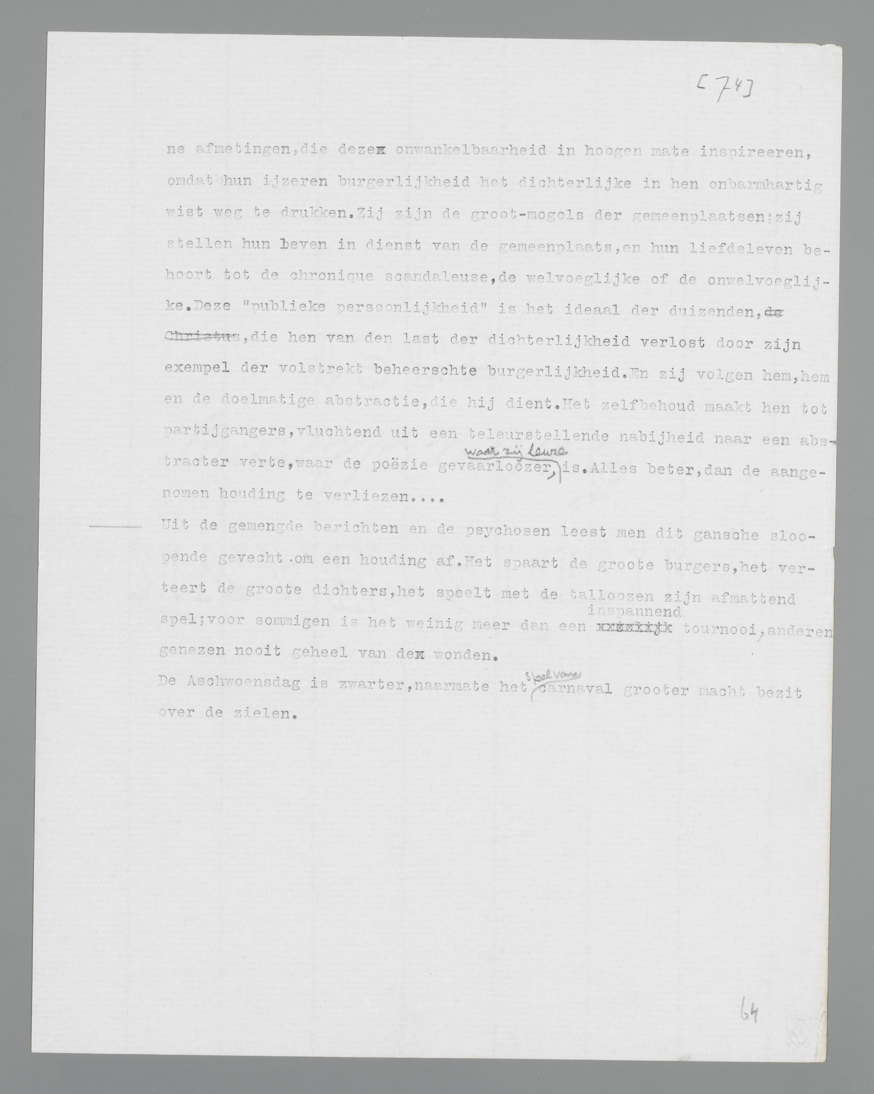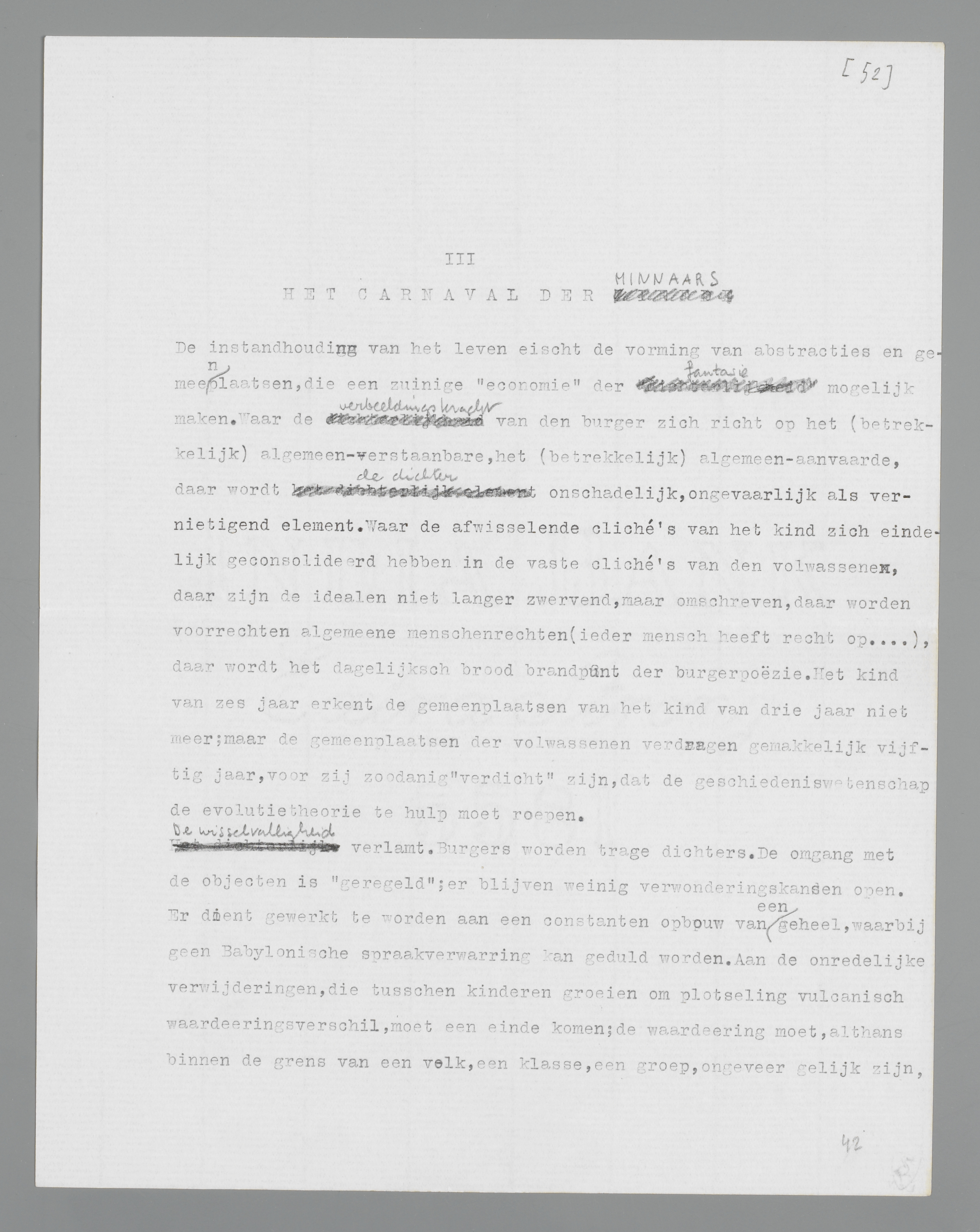 De burgerlijke gevangenis van den dichter is de gemeenplaats, is het woord, dat door burgers onverzettelijk wordt uitgesproken en gehandhaafd. In deze gevangenis versmacht de dichter, maar buiten haar muren zou hij ‘geen leven hebben’... Het is de minnaar, die ons van den dichter, want het is het carnaval, dat ons van het paradijs rest.