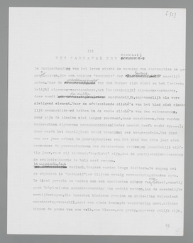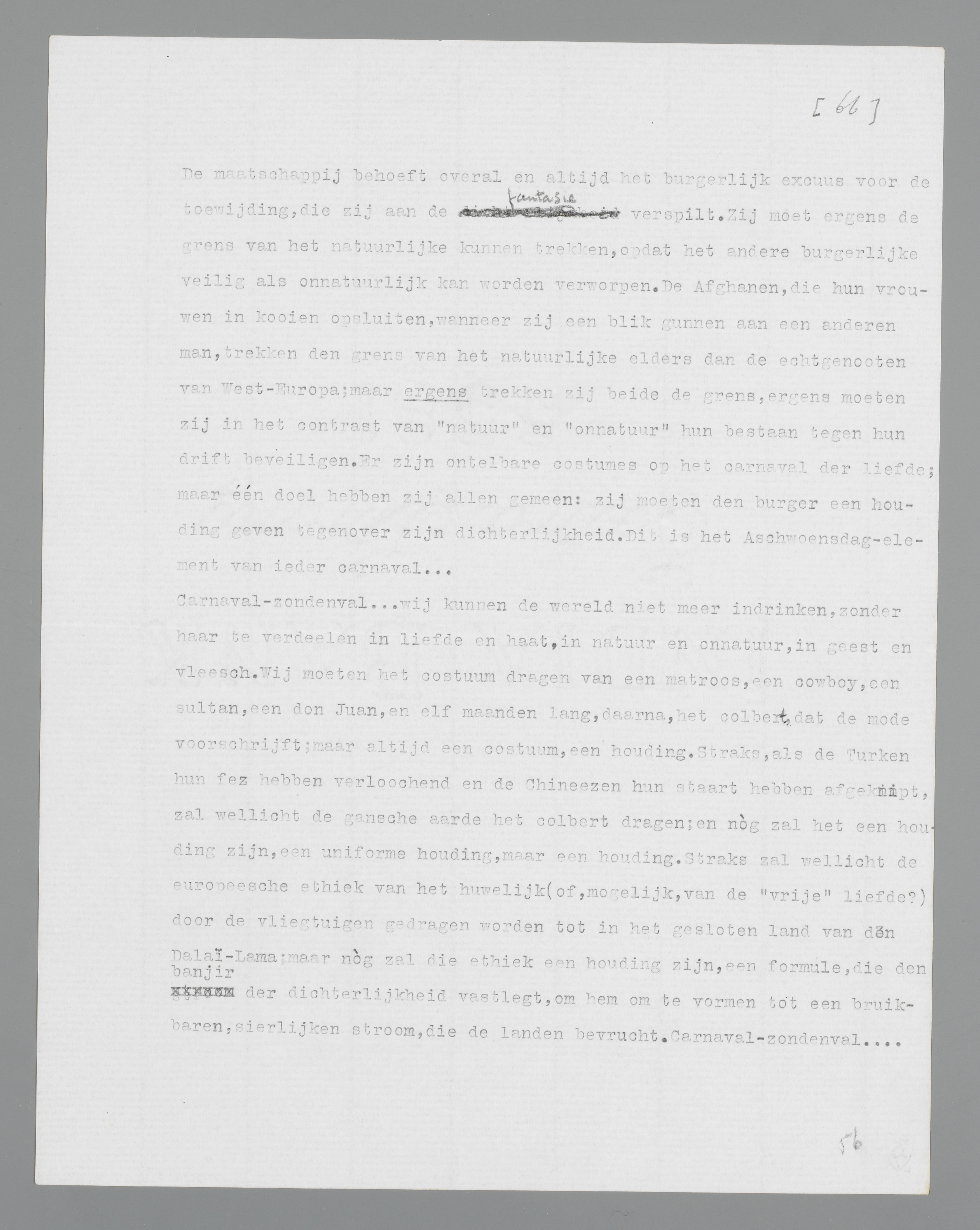 De maatschappij behoeft overal en altijd het burgerlijk excuus voor de toewijding, die zij aan de fantasie verspilt. Zij moet ergens de grens van het natuurlijke kunnen trekken, opdat het andere burgerlijke veilig als onnatuurlijk kan worden verworpen. De Afghanen, die hun vrouwen in kooien opsluiten, wanneer zij een blik gunnen aan een anderen man, trekken den grens van het natuurlijke elders dan de echtgenooten van West-Europa; maar ergens trekken zij beide de grens, ergens moeten zij in het contrast van ‘natuur’ en ‘onnatuur’ hun bestaan tegen hun drift beveiligen. Er zijn ontelbare costumes op het carnaval der liefde; maar één doel hebben zij allen gemeen: zij moeten den burger een houding geven tegenover zijn dichterlijkheid. Dit is het Aschwoensdagelement van ieder carnaval...