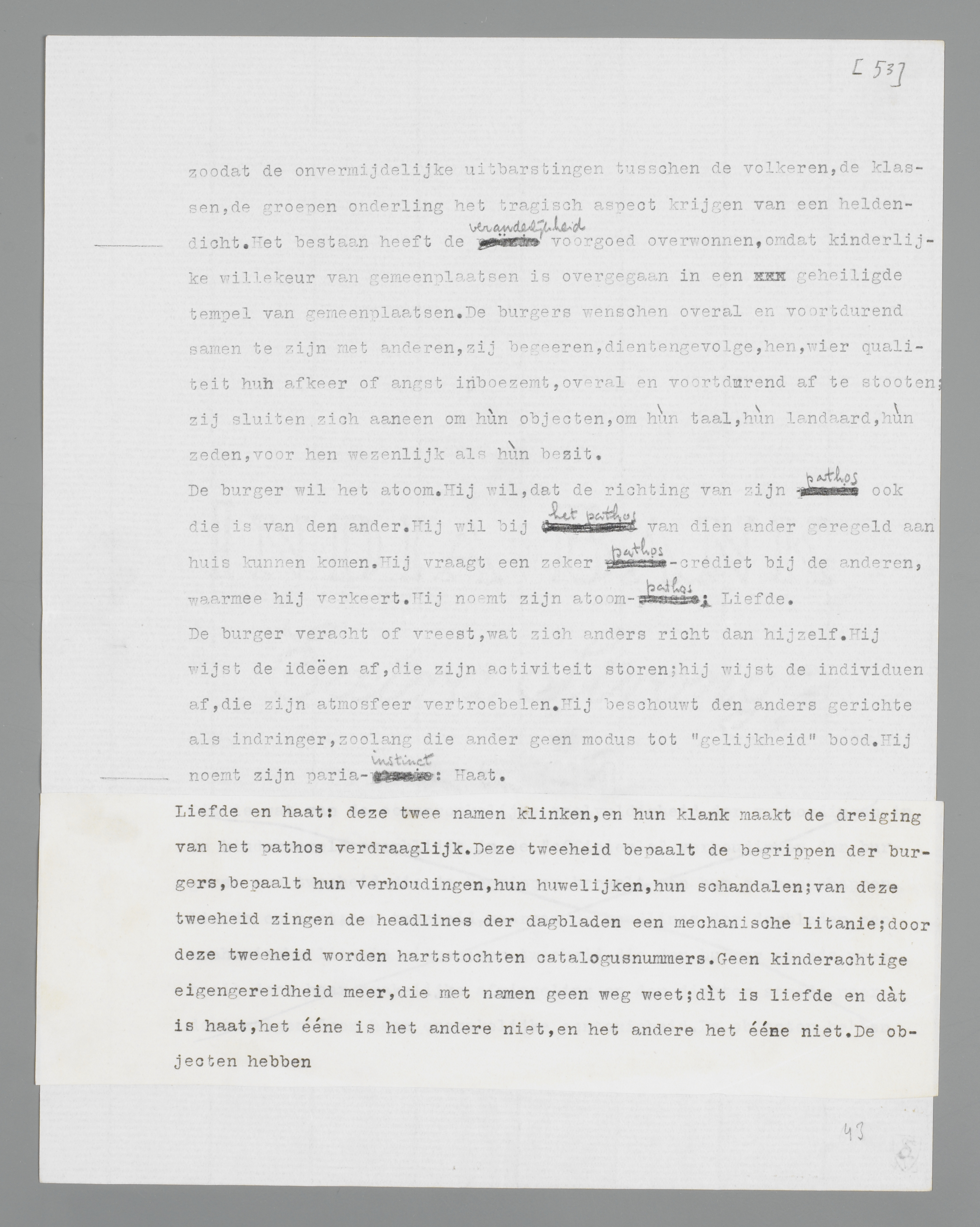Aan de oppervlakte bemint en haat de burger, alsof hij een ambt vervult. Zijn gansche streven is er op gericht, de liefde en de haat te codificeeren, te richten in atoom-banen. Er is slechts één weg, om te ontkomen aan de giftige waarheid, dat alle pathos het bestaan ontvleescht en vernielt: onophoudelijk luide te zeggen, dat het pathos getemperd en vastgelegd moet worden, dat liefde moet worden verzacht tot geluk en haat tot concurrentie. Er is slechts één weg, om te ontsnappen aan de onzekerheden van het kind: weten, dat de beet van den