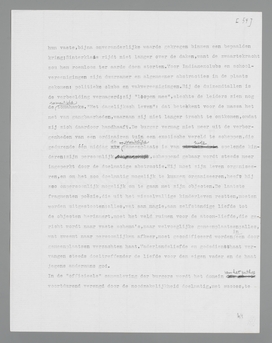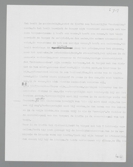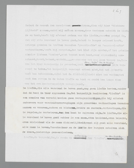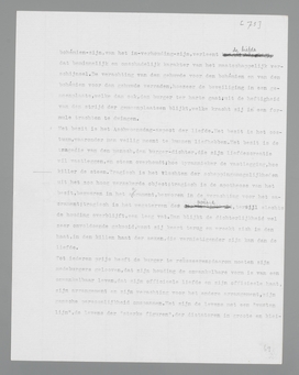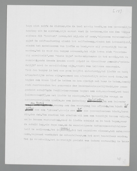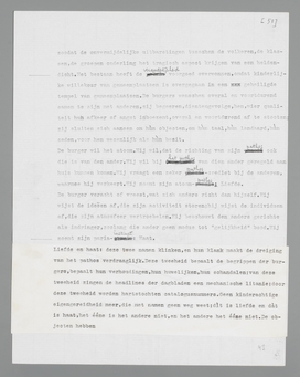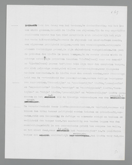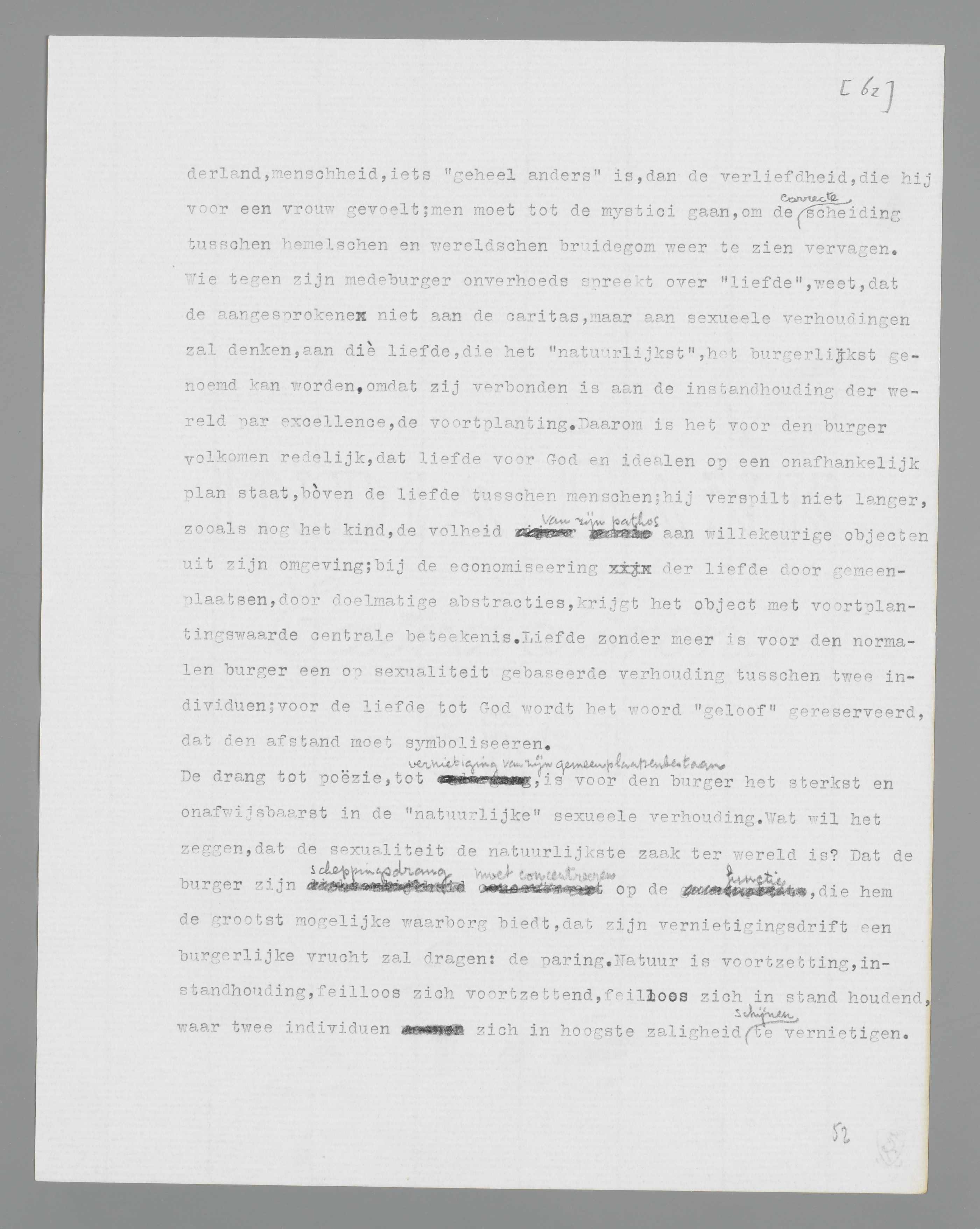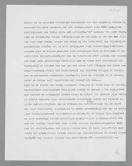 liefde, die het ‘natuurlijkst’, het burgerlijkst genoemd kan worden, omdat zij verbonden is aan de instandhouding der wereld par excellence, de voortplanting. Daarom is het voor den burger volkomen redelijk, dat liefde voor God en idealen op een onafhankelijk plan staat, bòven de liefde tusschen menschen; hij verspilt niet langer, zooals nog het kind, de volheid van zijn pathos aan willekeurige objecten uit zijn omgeving; bij de economiseering der liefde door gemeenplaatsen, door doelmatige abstracties, krijgt het object met voortplantingswaarde centrale beteekenis. Liefde zonder meer is voor den normalen burger een op sexualiteit gebaseerde verhouding tusschen twee individuen; voor de liefde tot God wordt het woord ‘geloof’ gereserveerd, dat den afstand moet symboliseeren.
