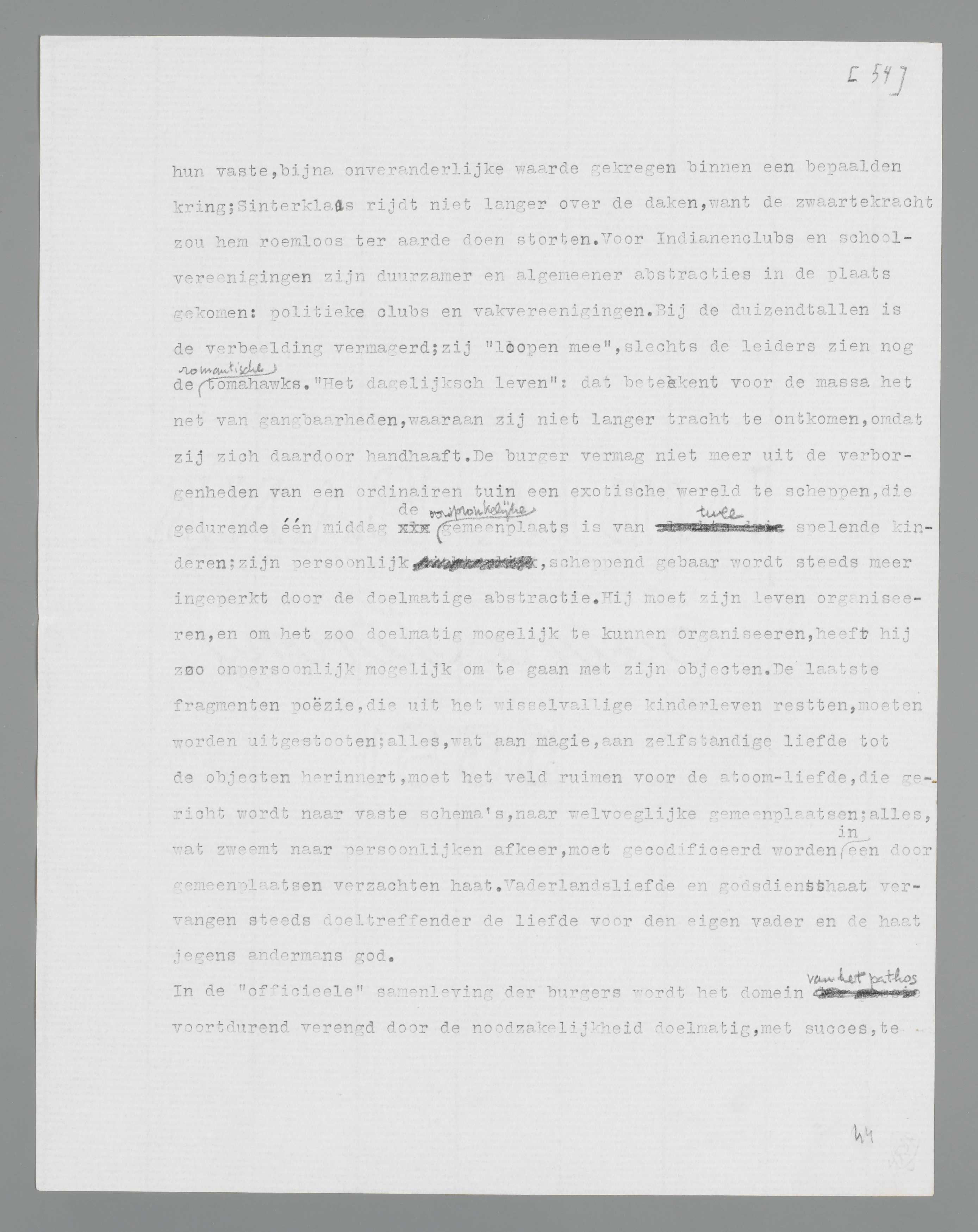 gerd; zij ‘loopen mee’, slechts de leiders zien nog de romantische tomahawks. ‘Het dagelijksch leven’: dat beteekent voor de massa het net van gangbaarheden, waaraan zij niet langer tracht te ontkomen, omdat zij zich daardoor handhaaft. De burger vermag niet meer uit de verborgenheden van een ordinairen tuin een exotische wereld te scheppen, die gedurende één middag de oorspronkelijke gemeenplaats is van twee spelende kinderen; zijn persoonlijk, scheppend gebaar wordt steeds meer ingeperkt door de doelmatige abstractie. Hij moet zijn leven organiseeren, en om het zoo doelmatig mogelijk te kunnen organiseeren, heeft hij zoo onpersoonlijk mogelijk om te gaan met zijn objecten. De laatste fragmenten poëzie, die uit het wisselvallige kinderleven restten, moeten worden uitgestooten; alles, wat aan magie, aan zelfstandige liefde tot de objecten herinnert, moet het veld ruimen voor de atoom-liefde, die gericht wordt naar vaste schema's, naar welvoeglijke gemeenplaatsen; alles, wat zweemt naar persoonlijken afkeer, moet gecodificeerd worden in een door gemeenplaatsen verzachten haat. Vaderlandsliefde en godsdiensthaat vervangen steeds doeltreffender de liefde voor den eigen vader en de haat jegens andermans god.